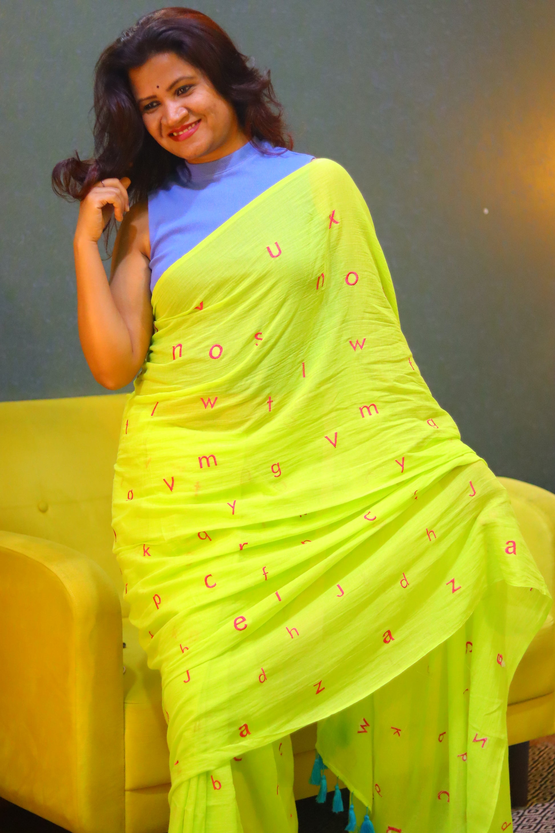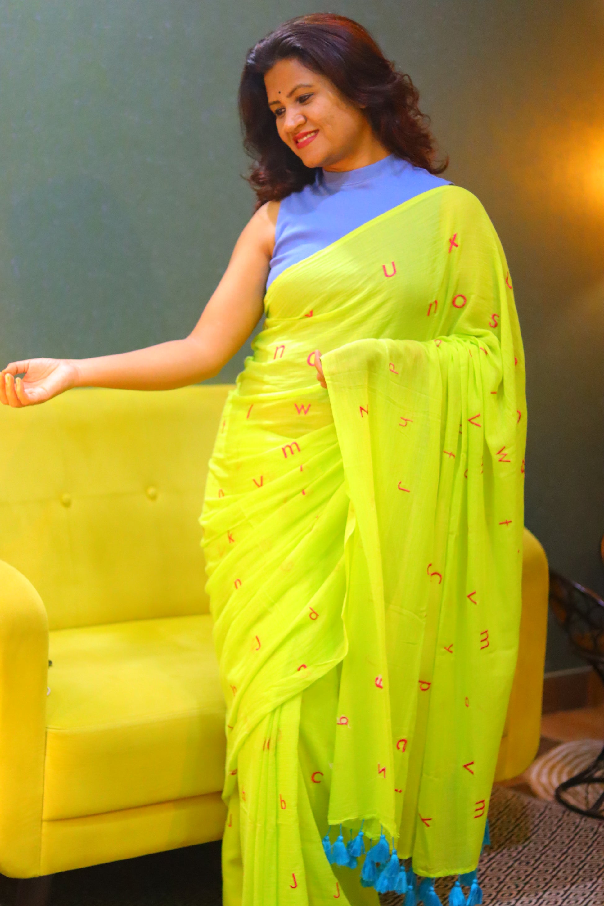 Lime yellow mul cotton saree with alphabets embroidered all over saree