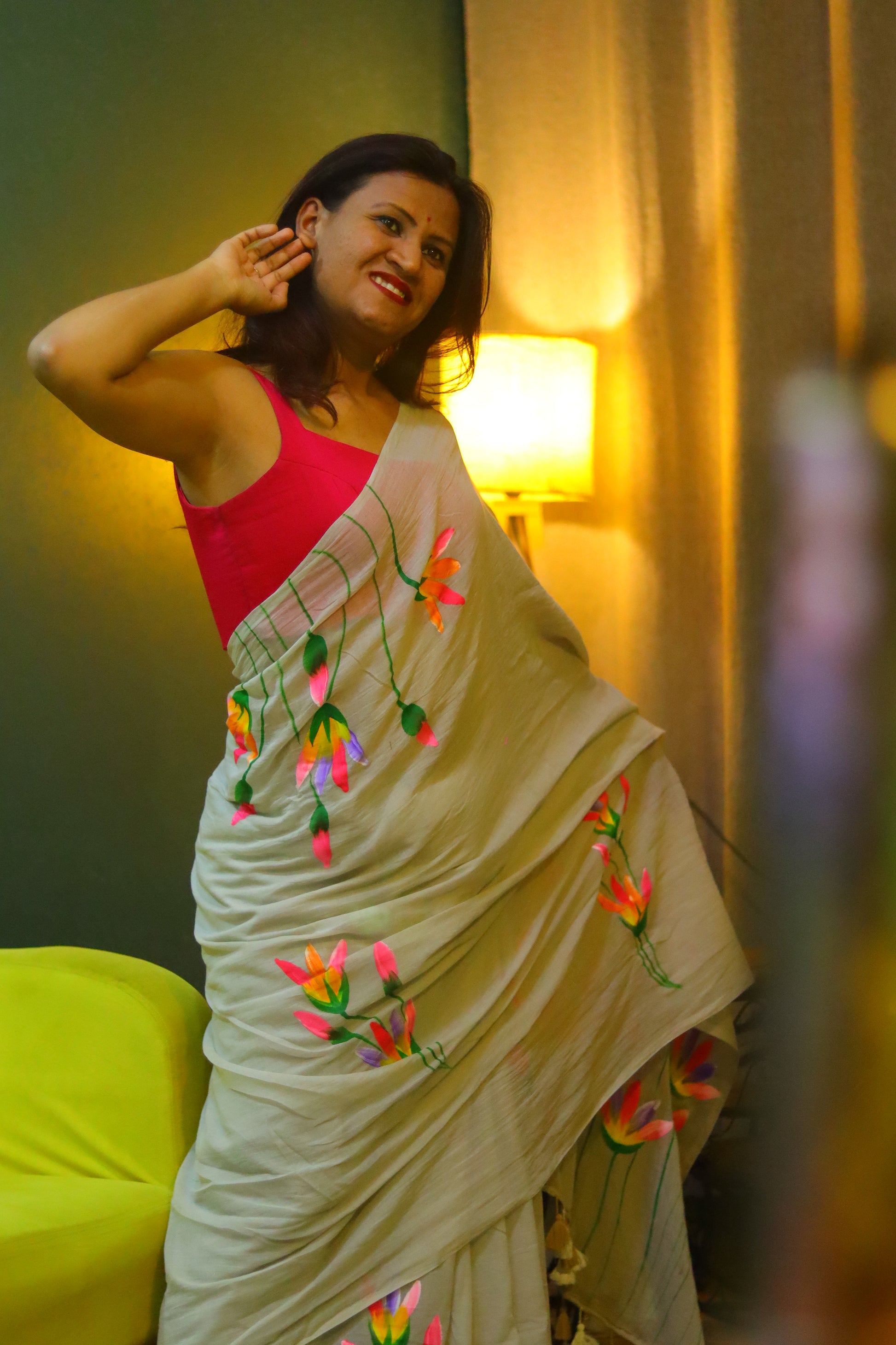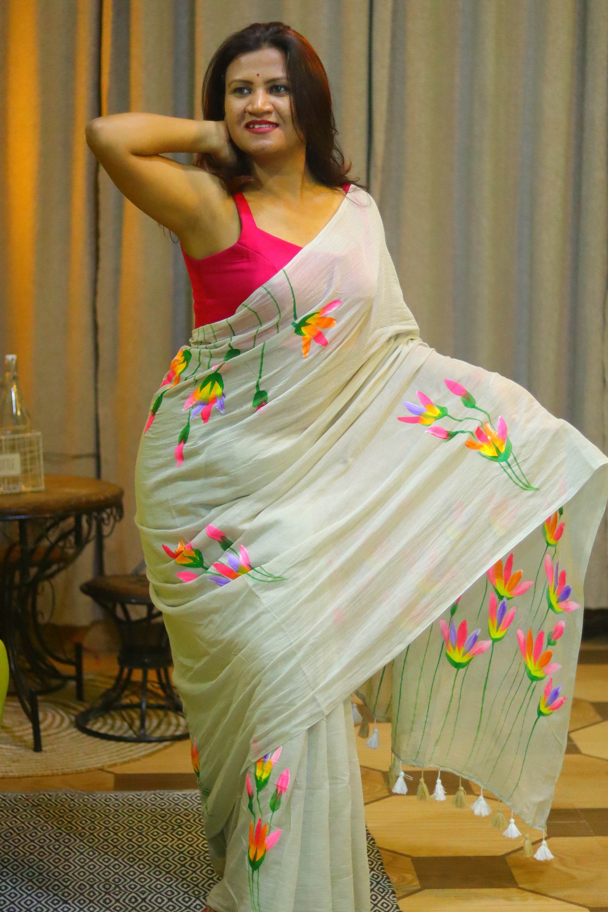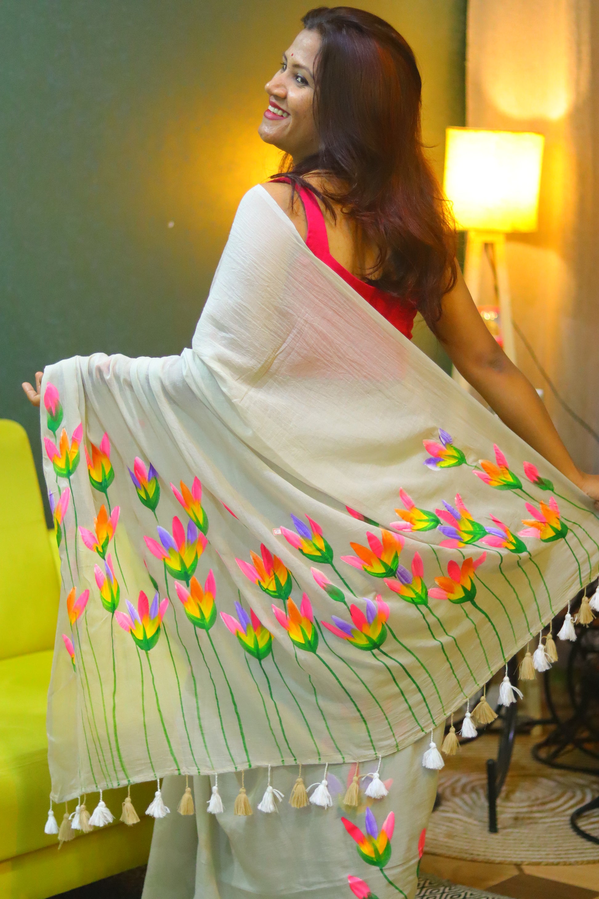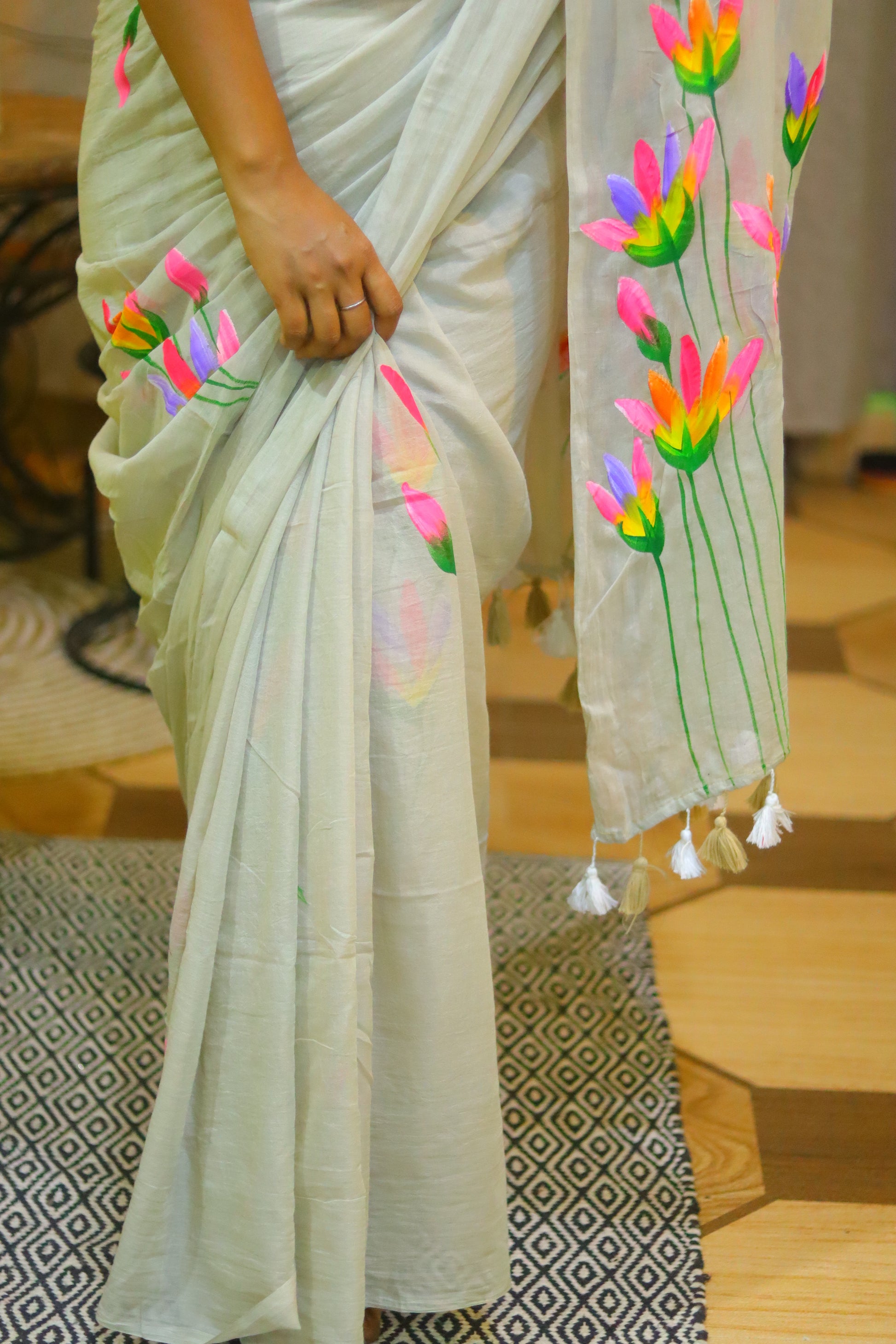 "Aravali" - a serene grey mul cotton saree, adorned with a delicate, hand-painted lotus bloom. Simple, yet striking, this saree embodies the beauty of nature.