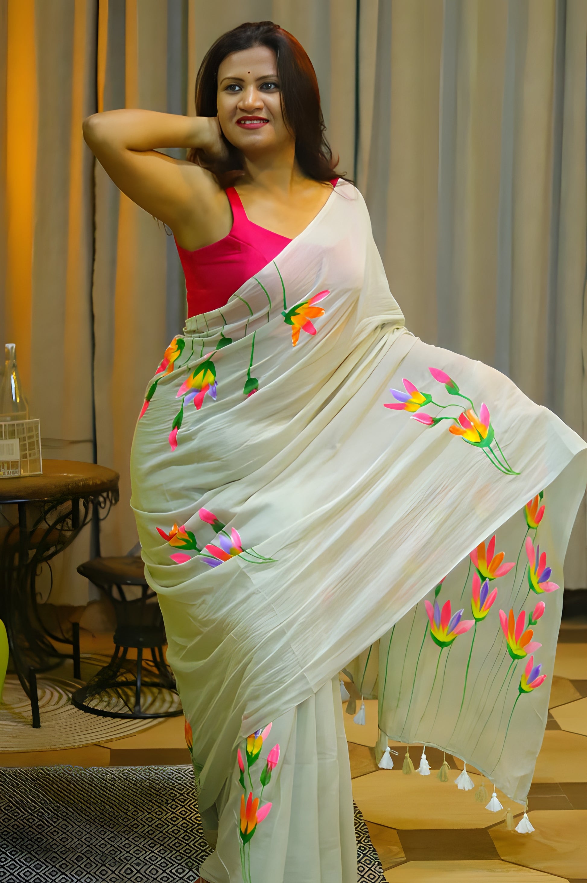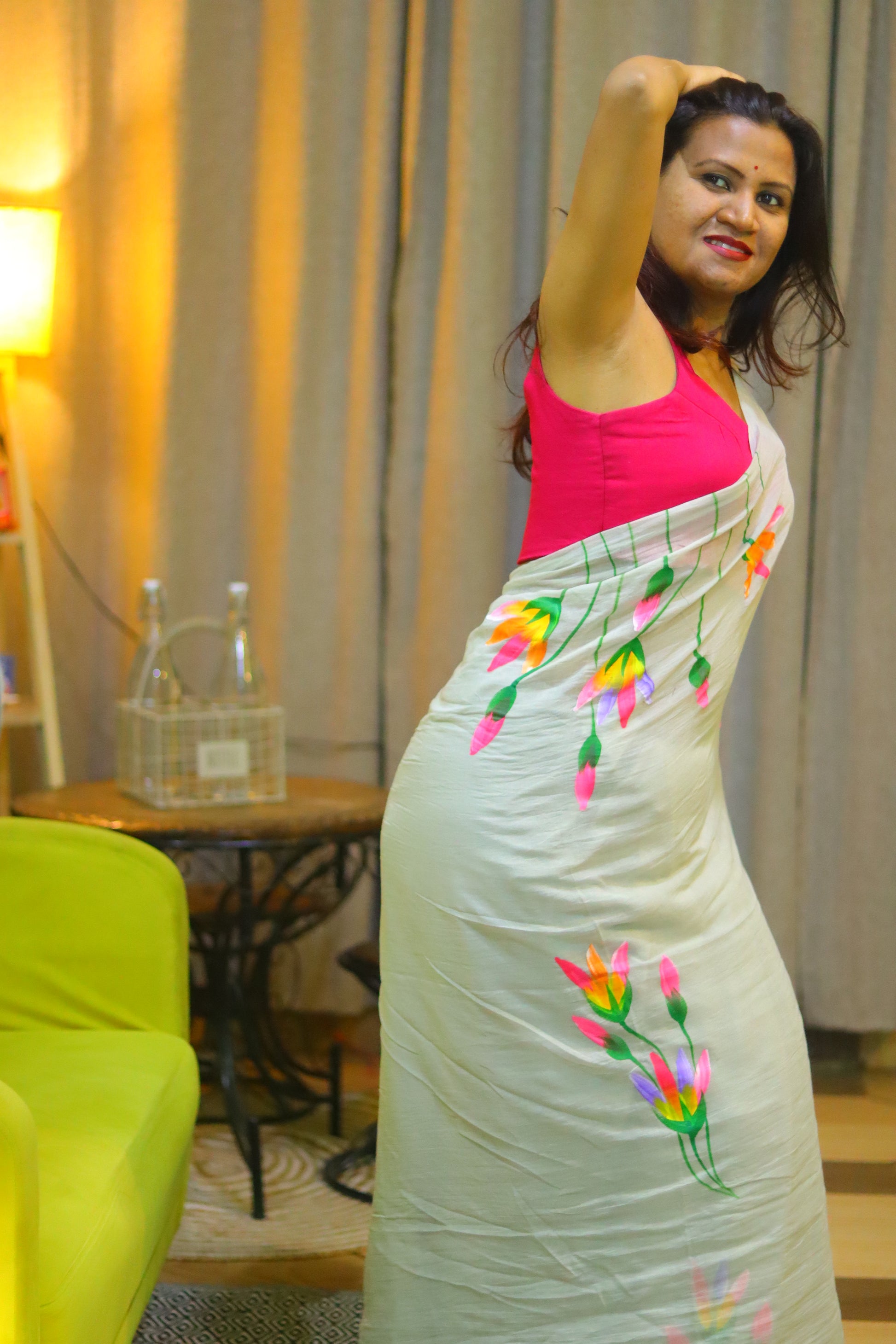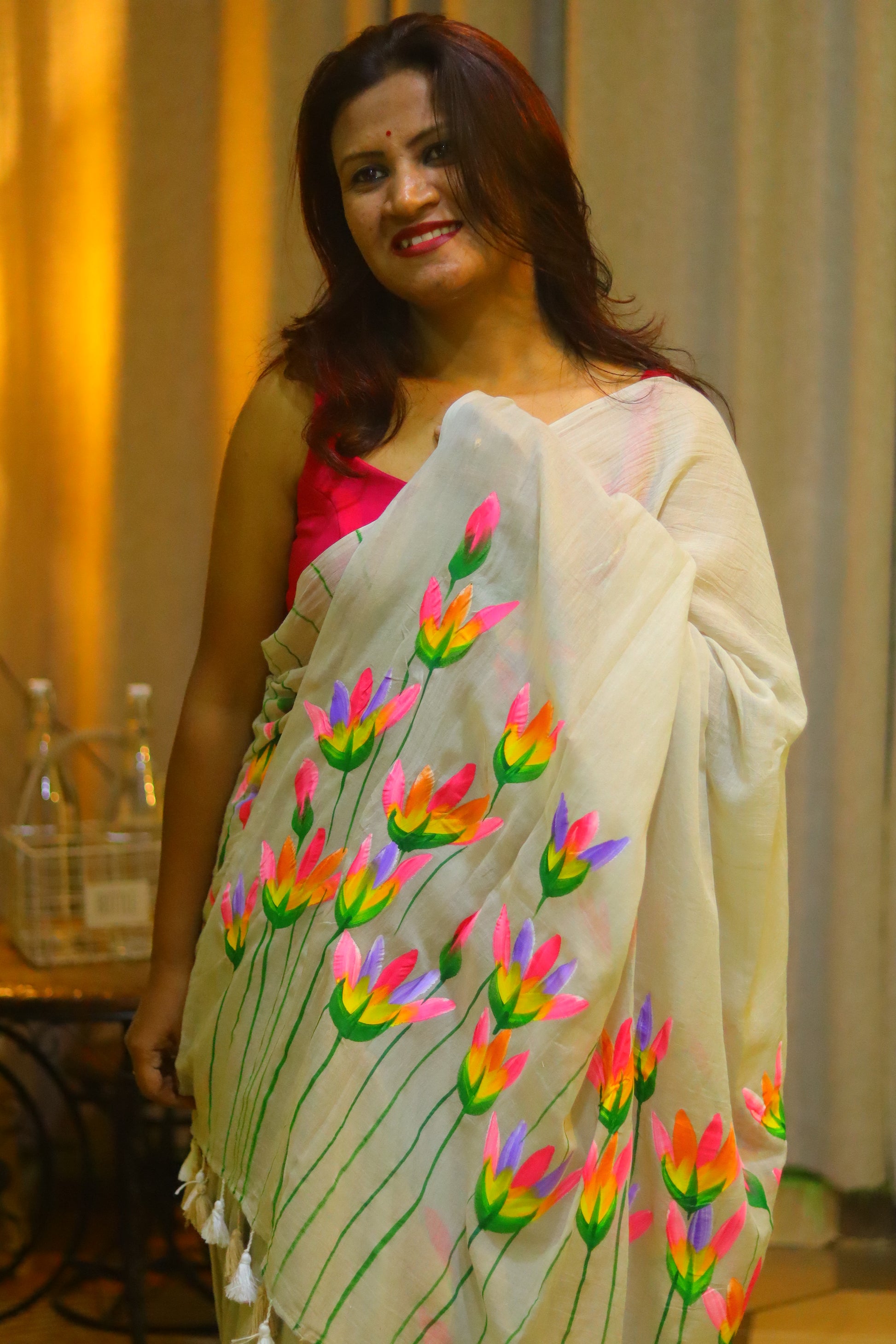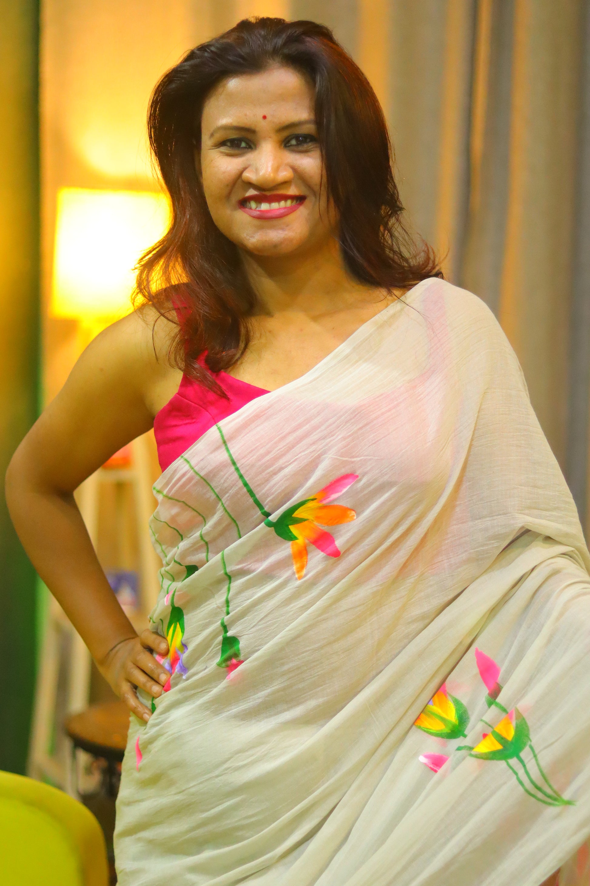"Aravali" - a serene grey mul cotton saree, adorned with a delicate, hand-painted lotus bloom. Simple, yet striking, this saree embodies the beauty of nature.