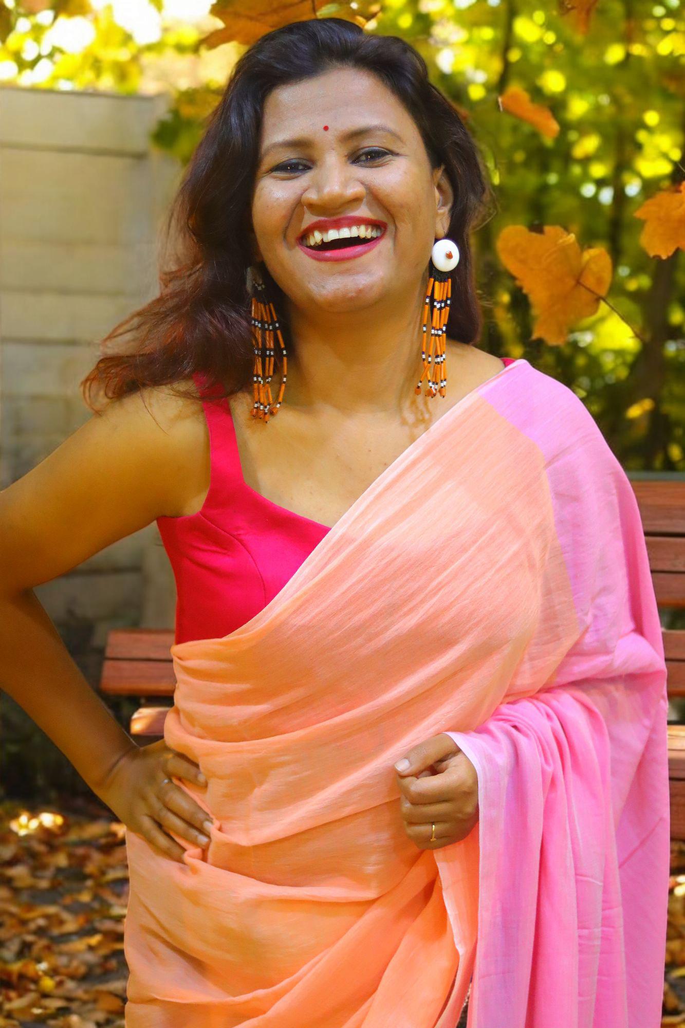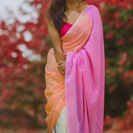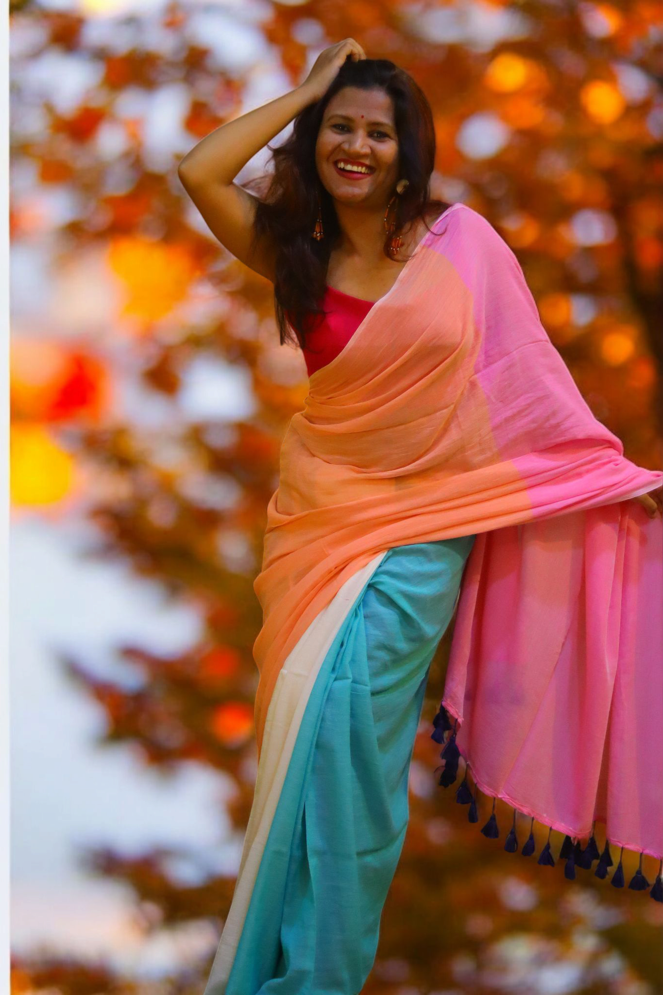 Blue to pink is a five coloured Mul cotton saree that has shades of blue, offwhite, pink, orange and teal colour