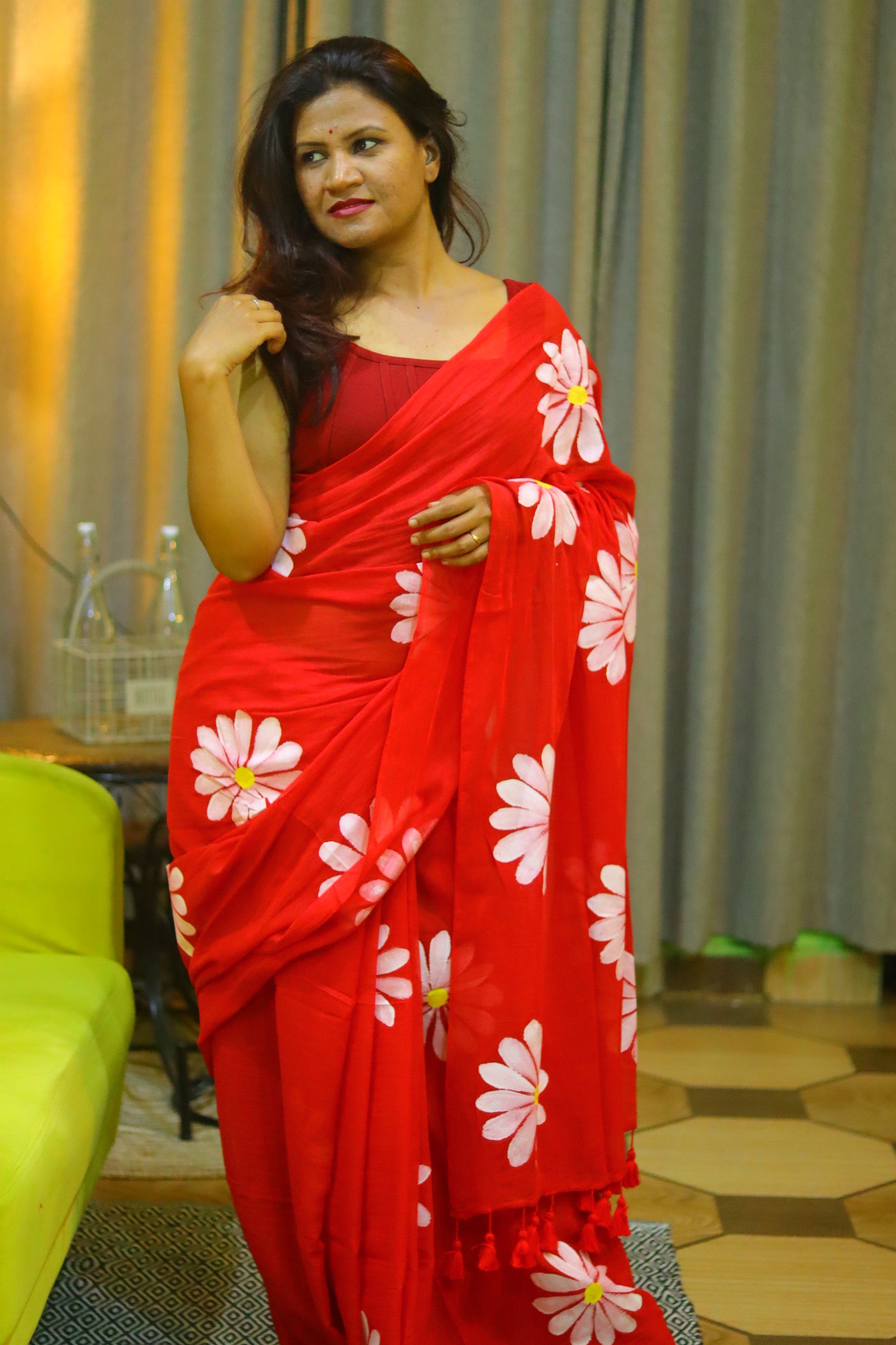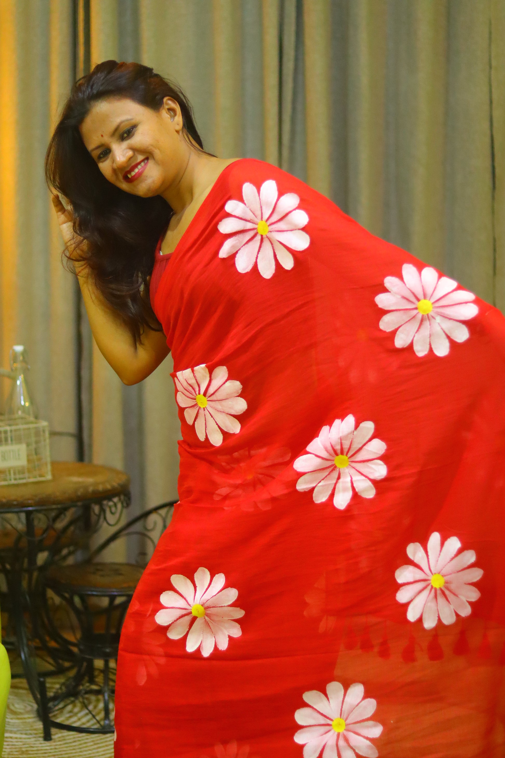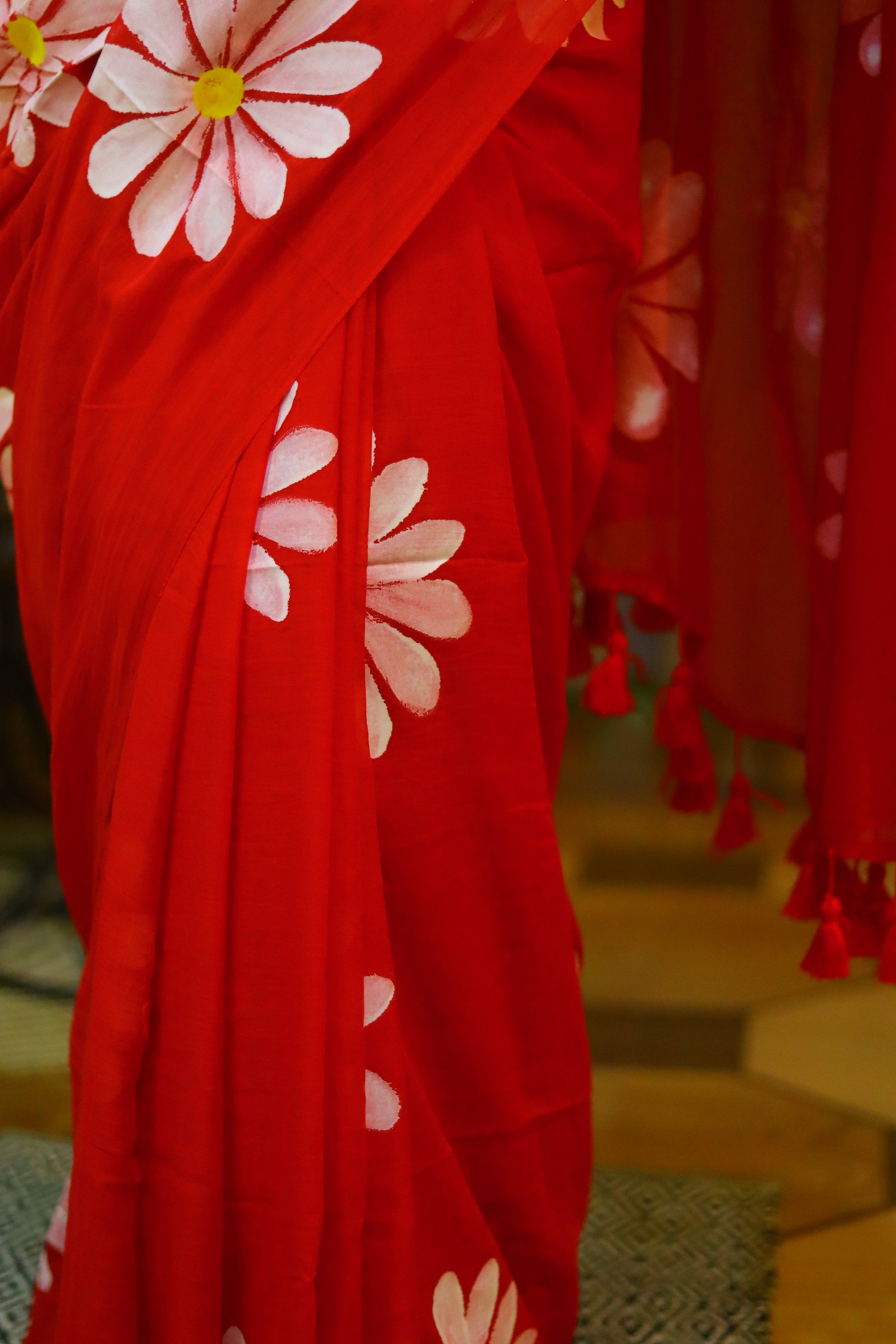 "Burning Desire" - A fiery red mul cotton saree, ignited by delicate white hand-painted flowers that dance across the fabric like flames. This captivating saree embodies passion, energy, and unbridled beauty, making it a stunning statement piece.