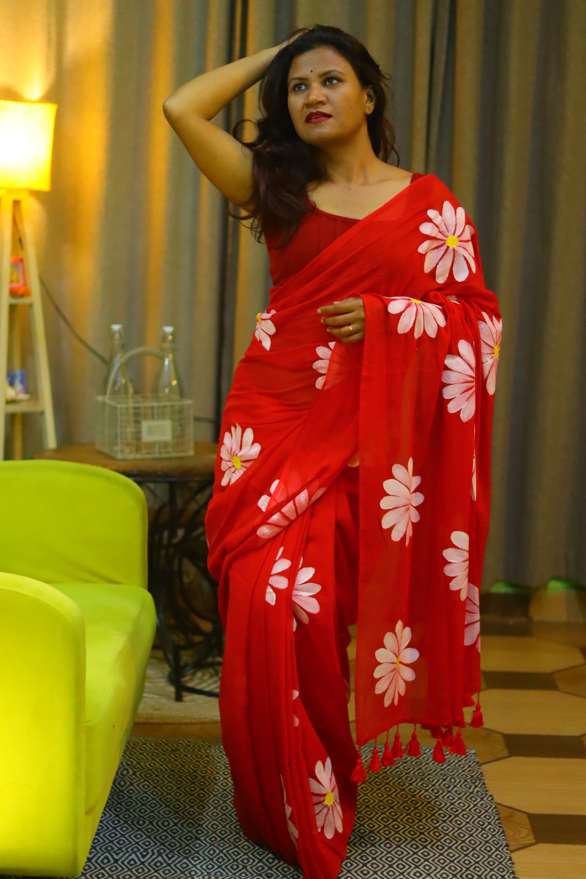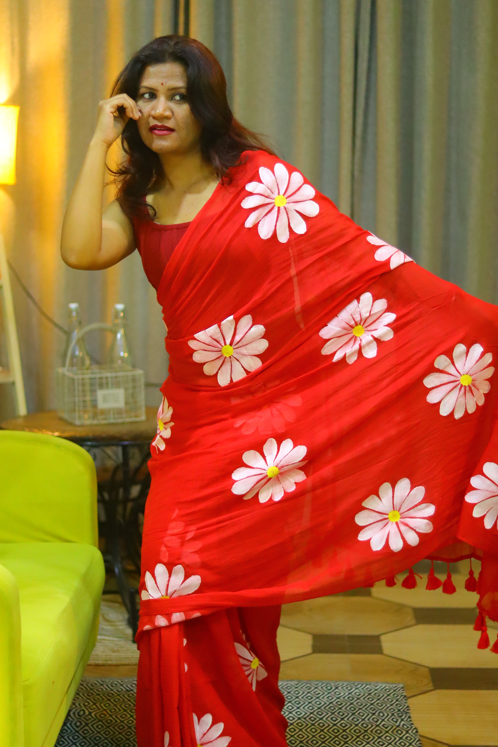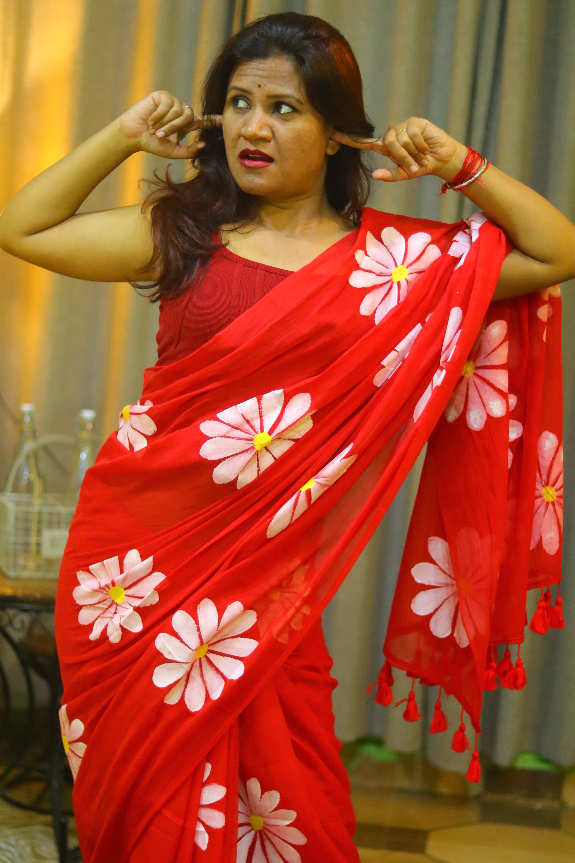 "Burning Desire" - A fiery red mul cotton saree, ignited by delicate white hand-painted flowers that dance across the fabric like flames. This captivating saree embodies passion, energy, and unbridled beauty, making it a stunning statement piece.