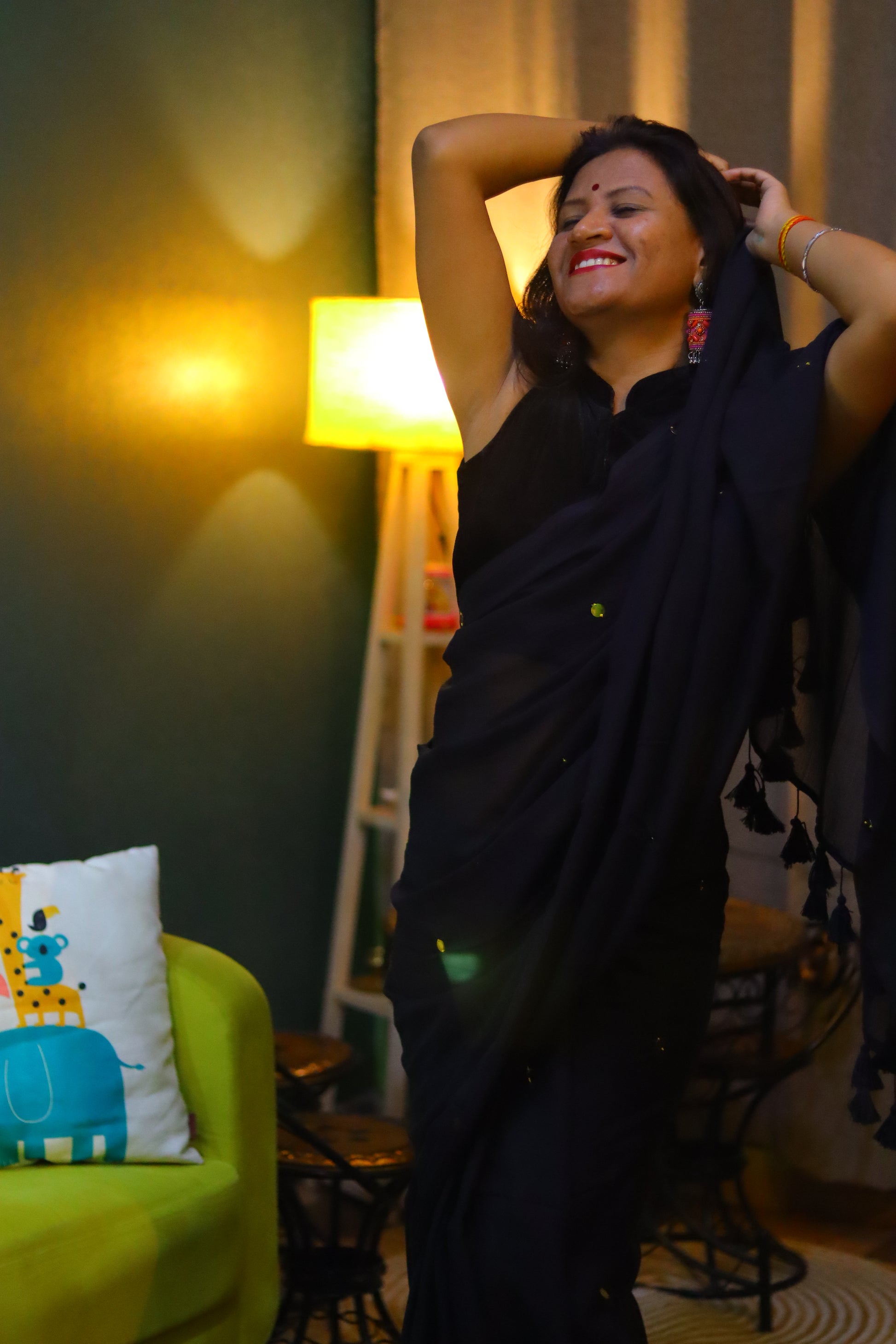 The Dark Black Saree with Stars is a stunning embodiment of celestial beauty and elegance. The deep black fabric serves as a perfect canvas for the shimmering stars scattered across the saree, creating a mesmerizing night-sky effect. Each star, delicately designed, adds a hint of sparkle, making the saree glow with a subtle yet striking brilliance. Perfect for evening wear, this saree exudes mystery and allure, offering a blend of sophistication and enchantment. Whether for a special occasion or a festive event, this saree will make you stand out with its unique, ethereal charm.