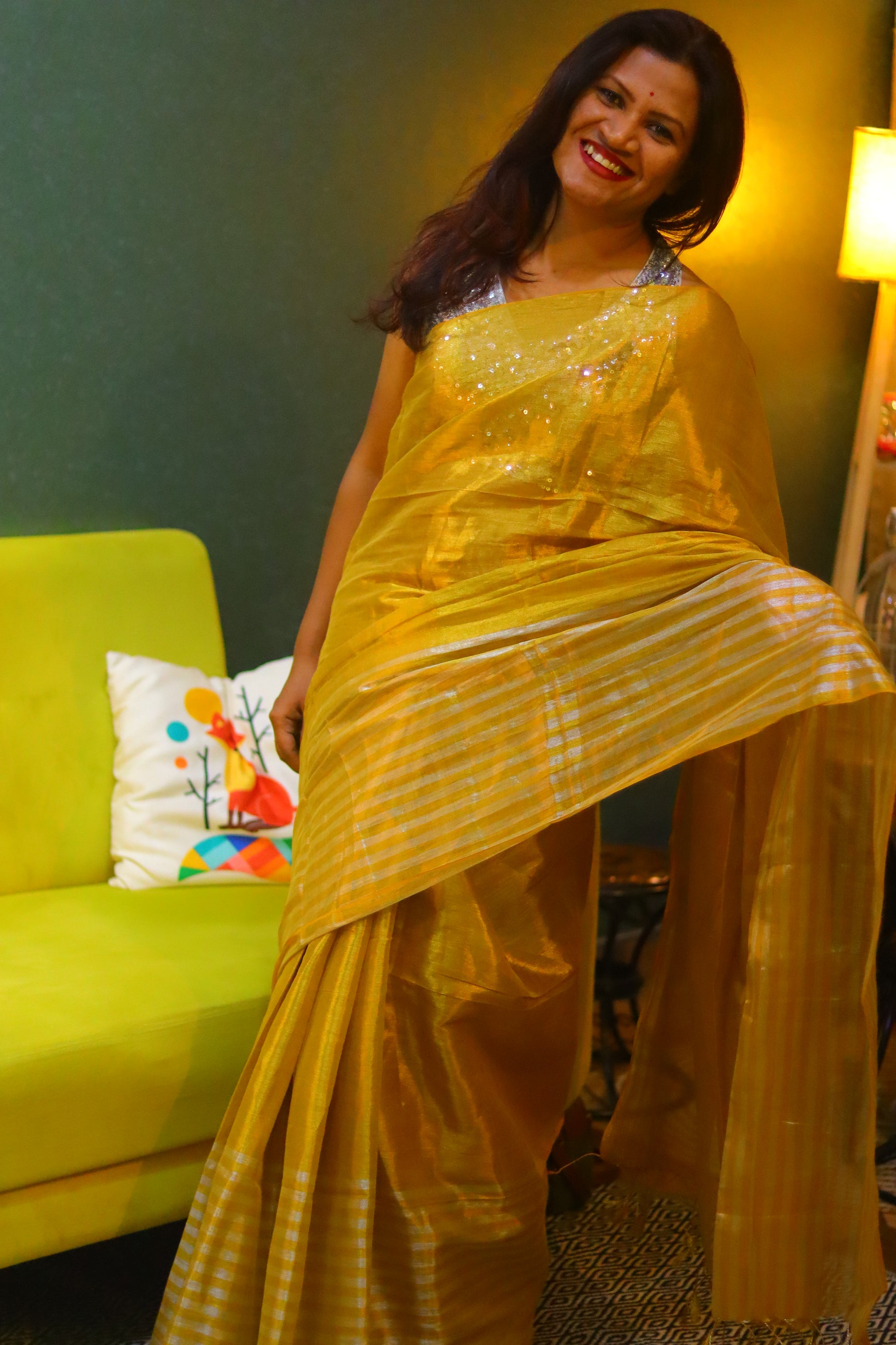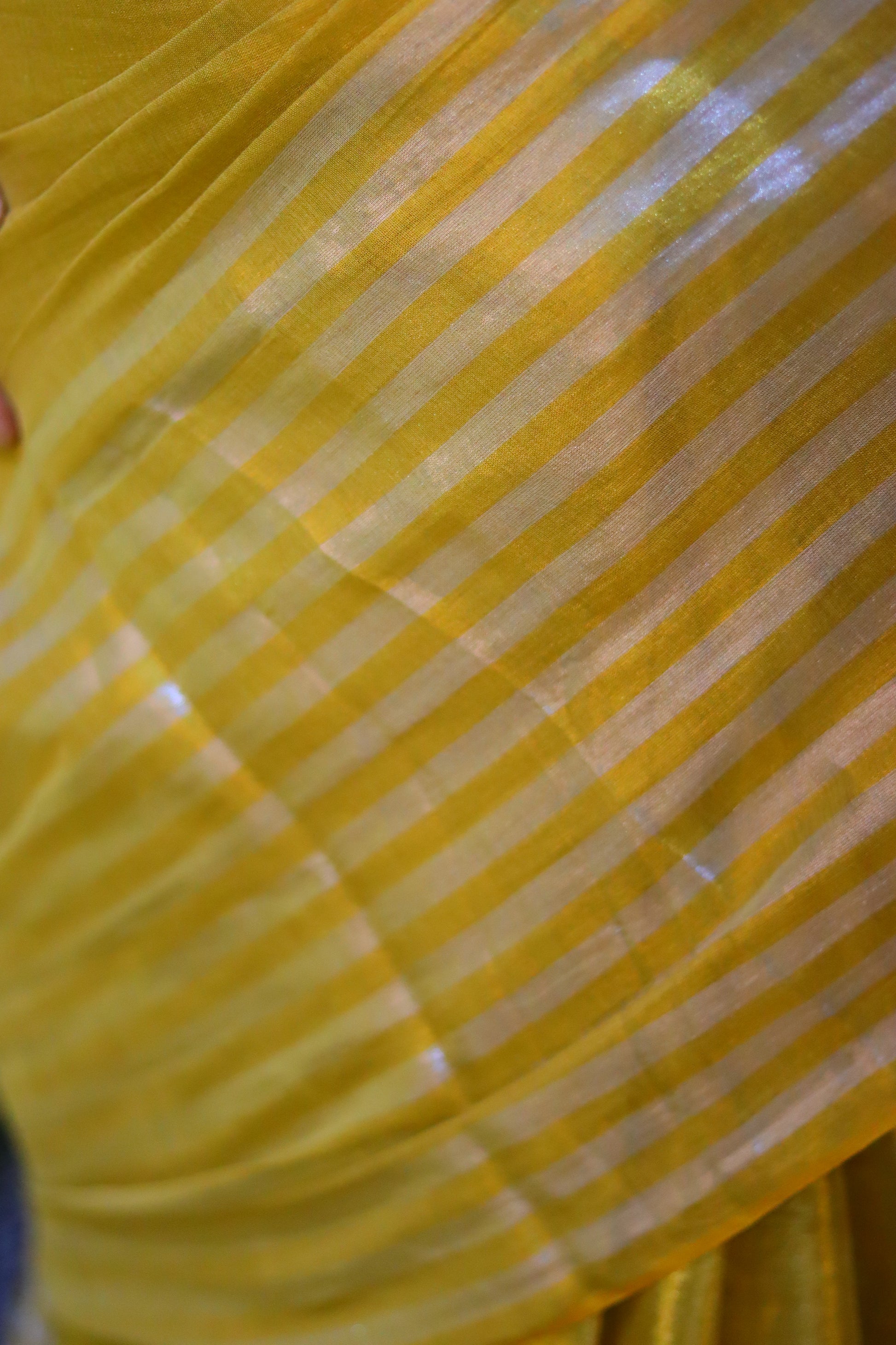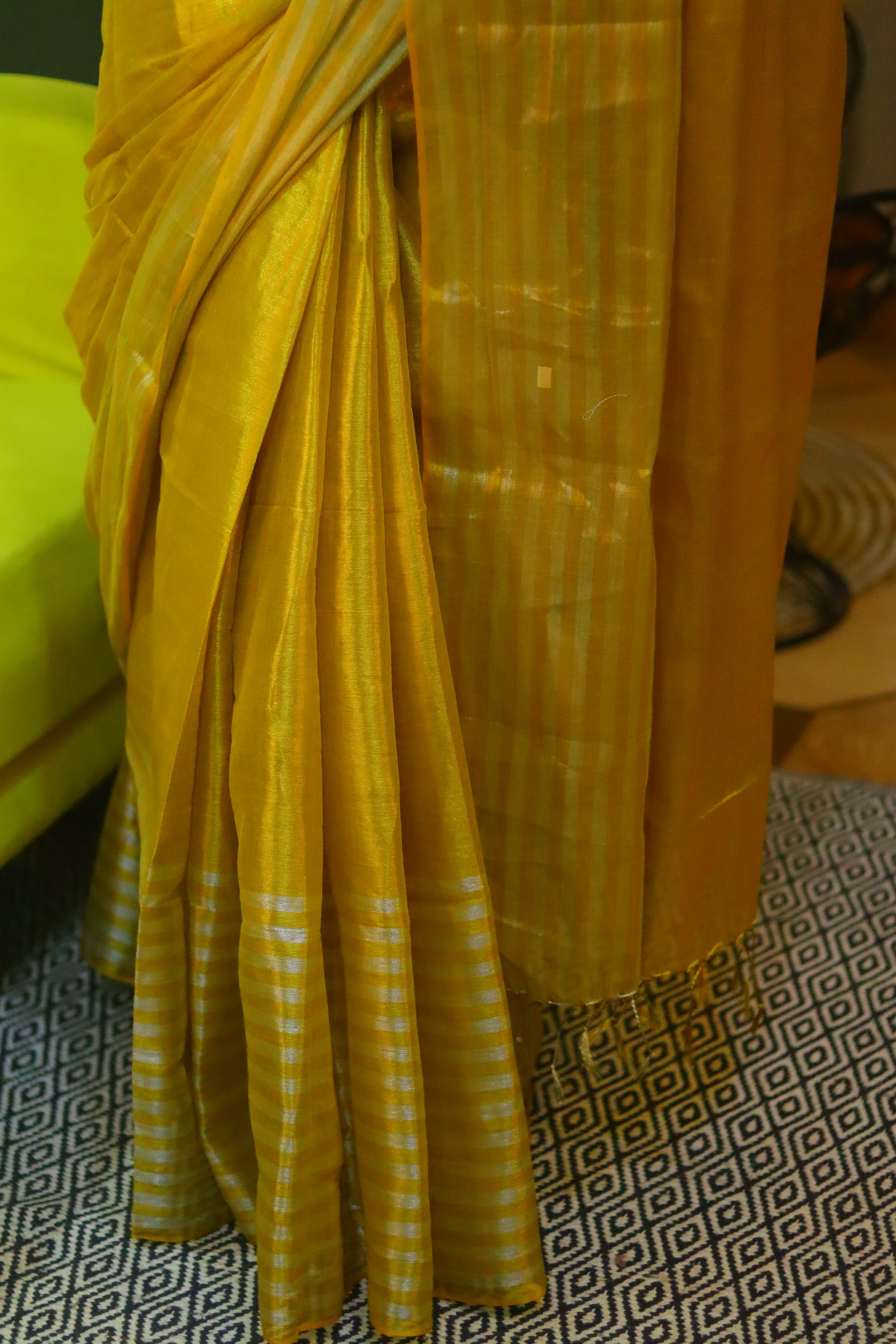 "Dhara" - a serene and elegant white gold saree, reminiscent of a gentle stream. The subtle silver and gold stripes on the lower border add a touch of sophistication, creating a sense of fluid movement. Perfect for special occasions or everyday wear, "Dhara" embodies the beauty of simplicity and refinement.