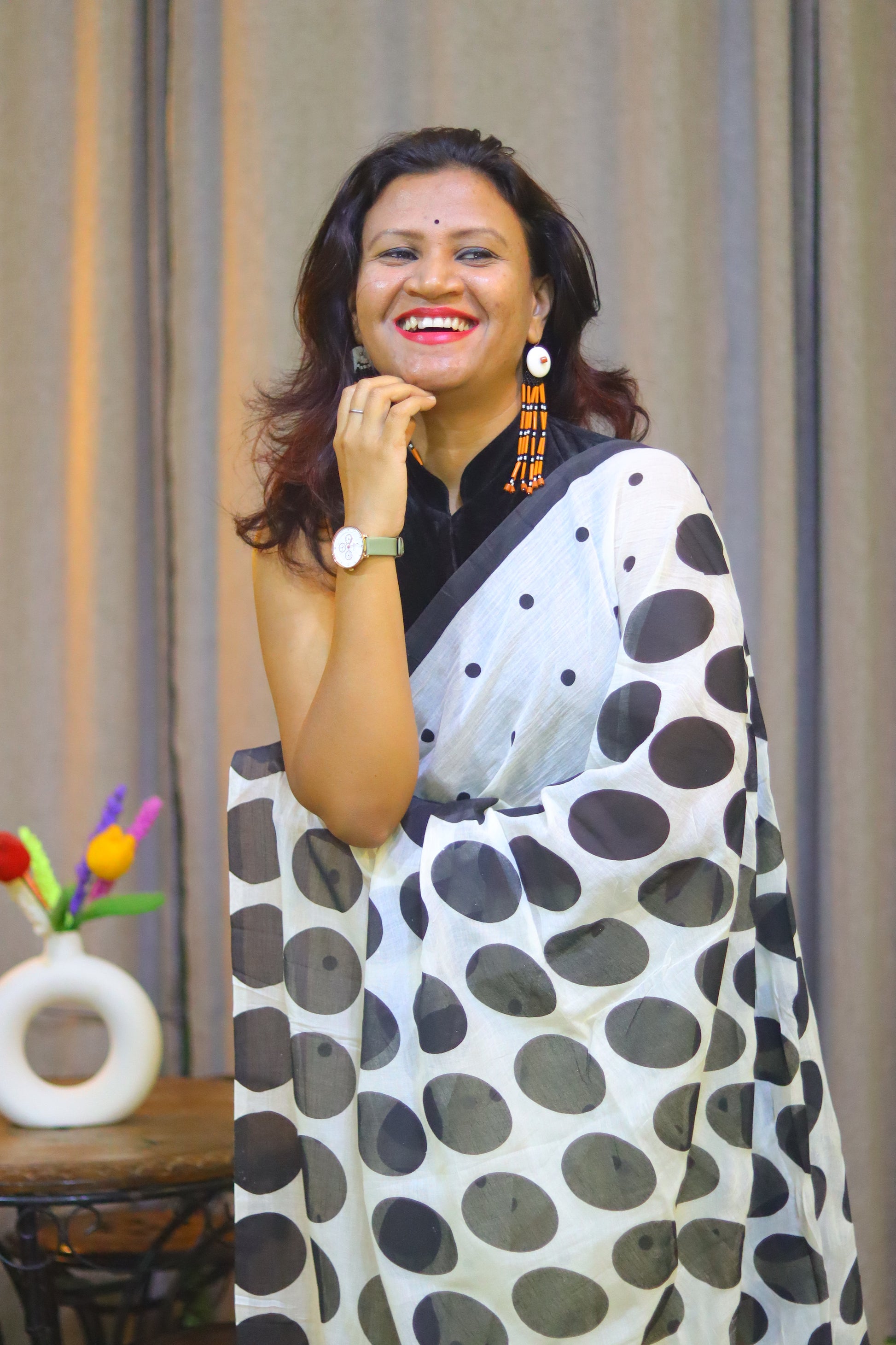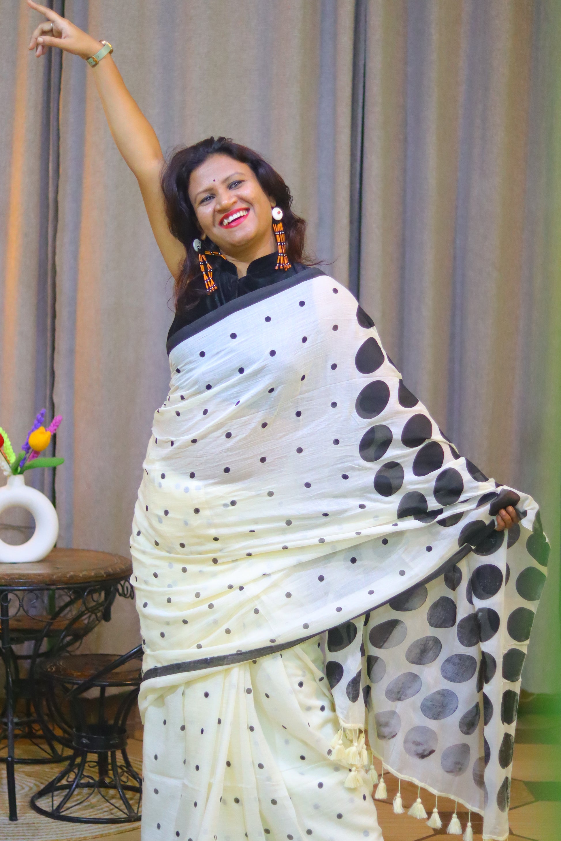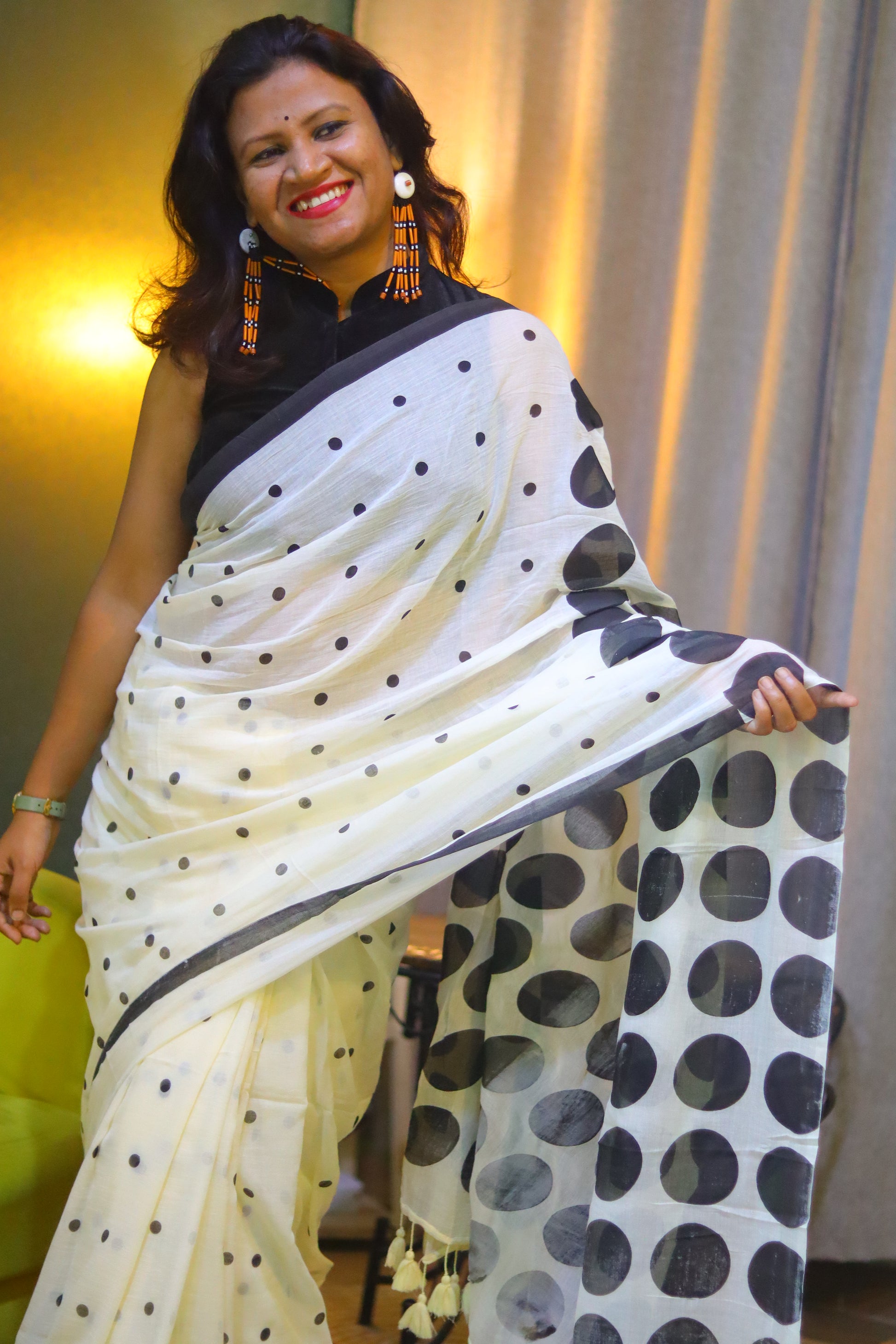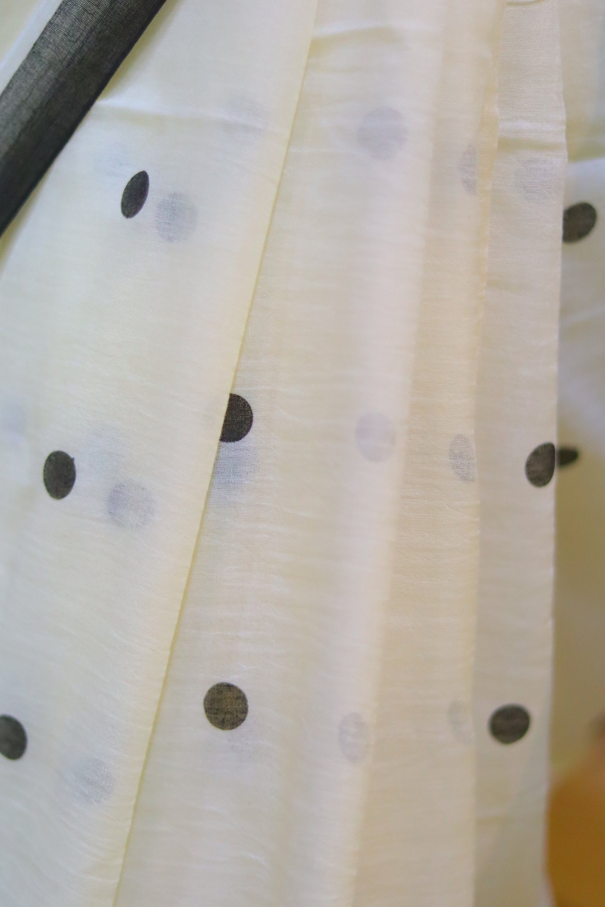 Embrace playful elegance with this white saree adorned with delicate small polka dots throughout and bold, large polka dots gracing the anchal. The design beautifully balances minimalism and statement-making charm, making it perfect for casual outings or chic events. Lightweight and stylish, it's a timeless addition to your wardrobe.