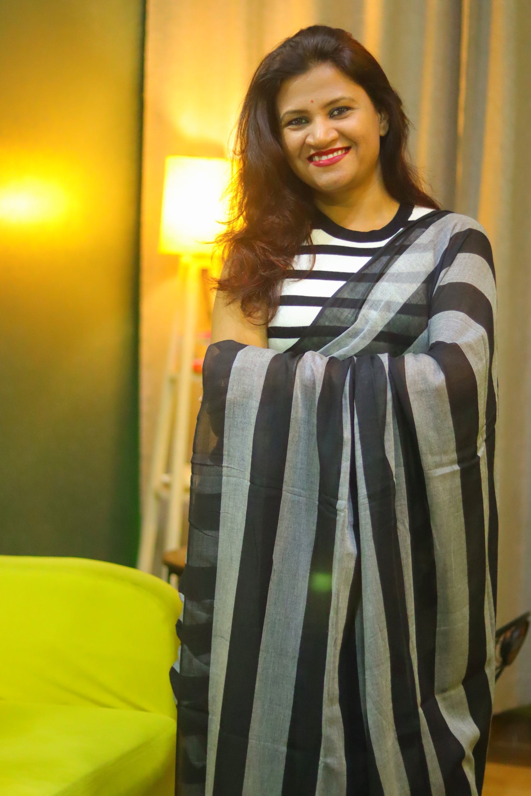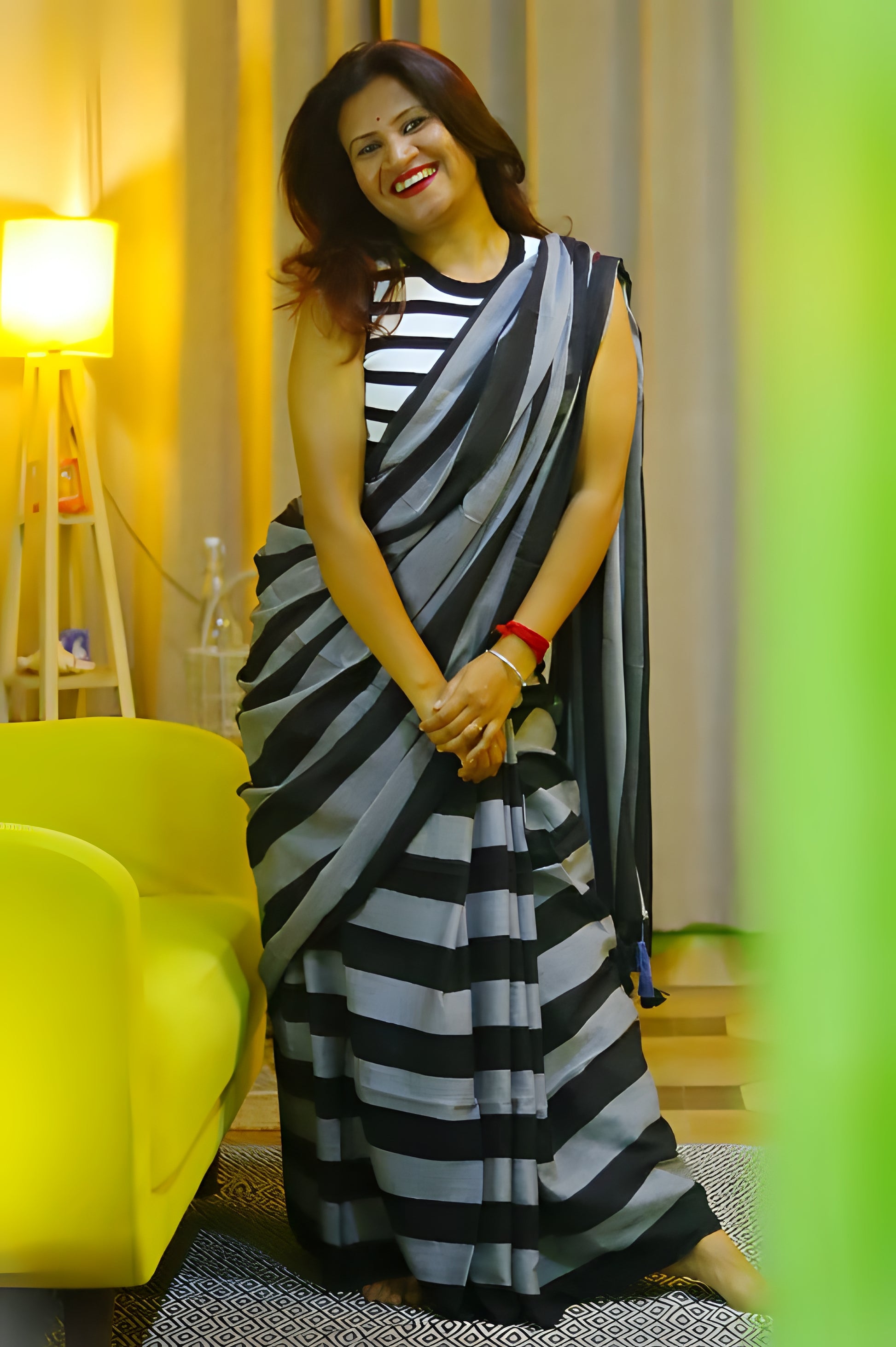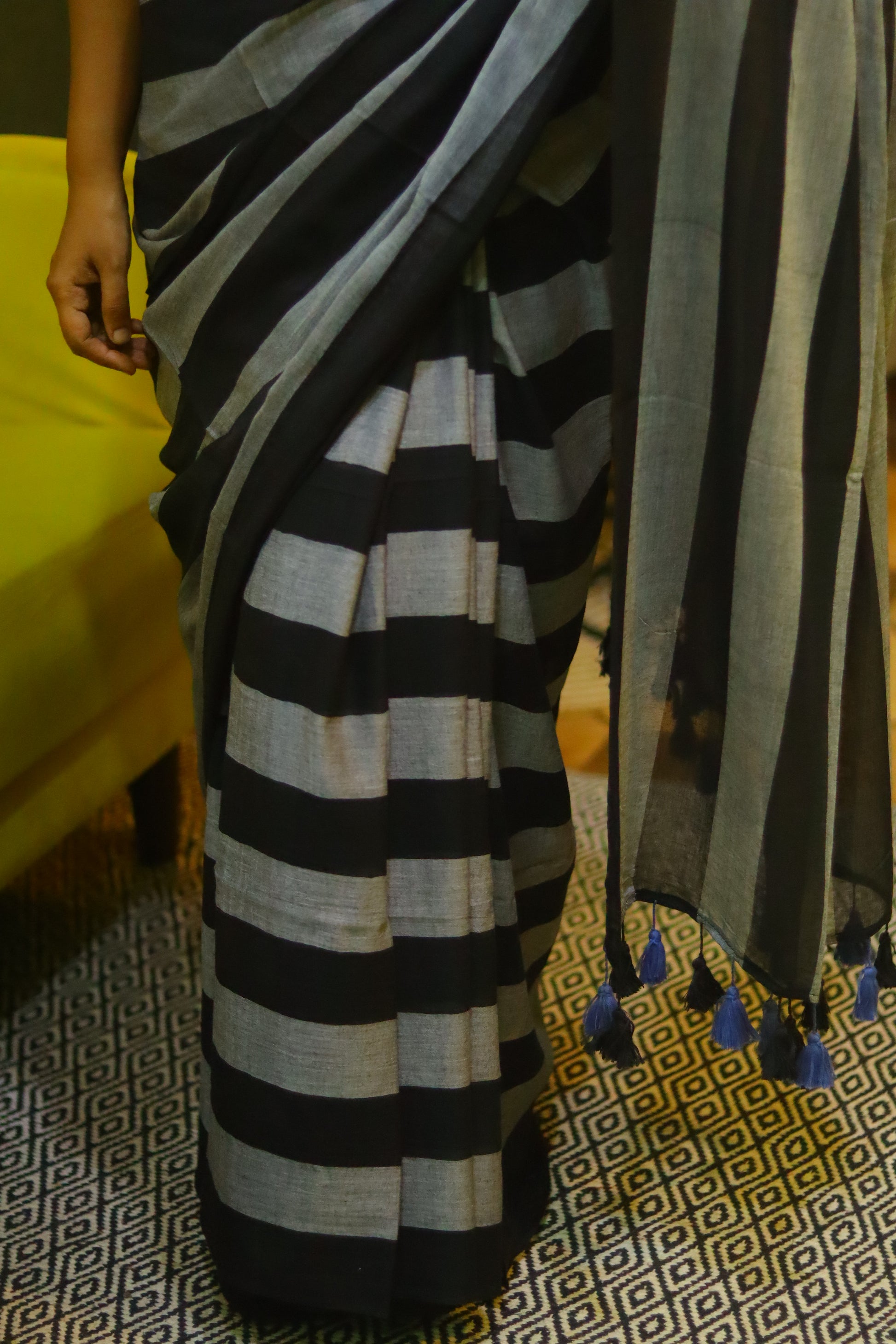 Dusk and dawn is a soft mul cotton saree with thick black and grey lines all across saree. Dusk and dawn saree is a perfect saree for office wear. Broad black and grey lines makes it look very sophisticated and elegant. This sober piece is a 'must have' in your wardrobe if you are a office goer.