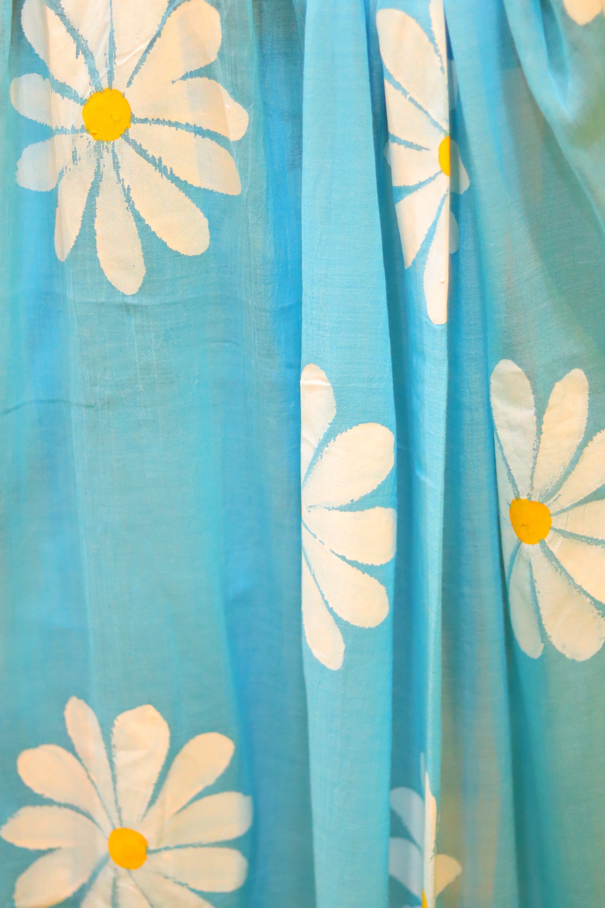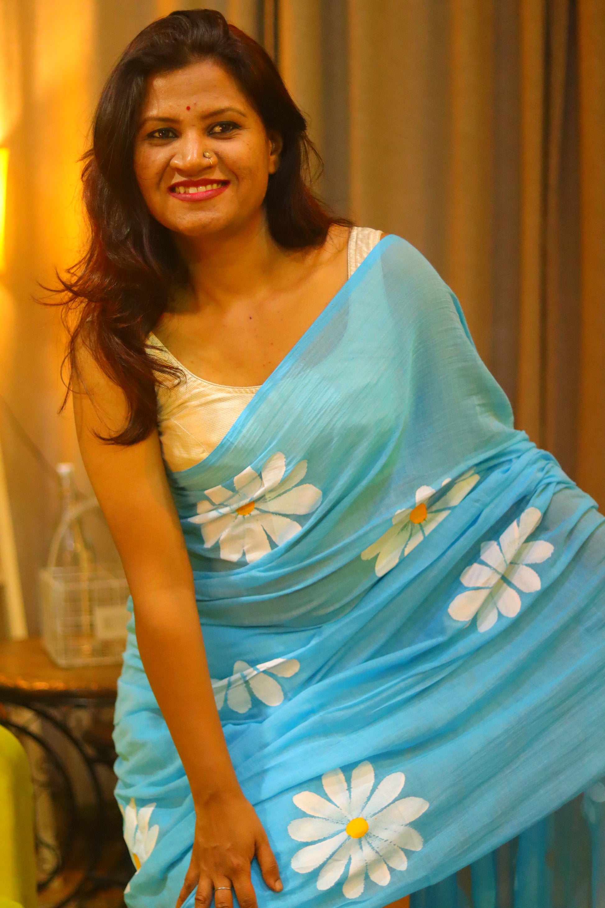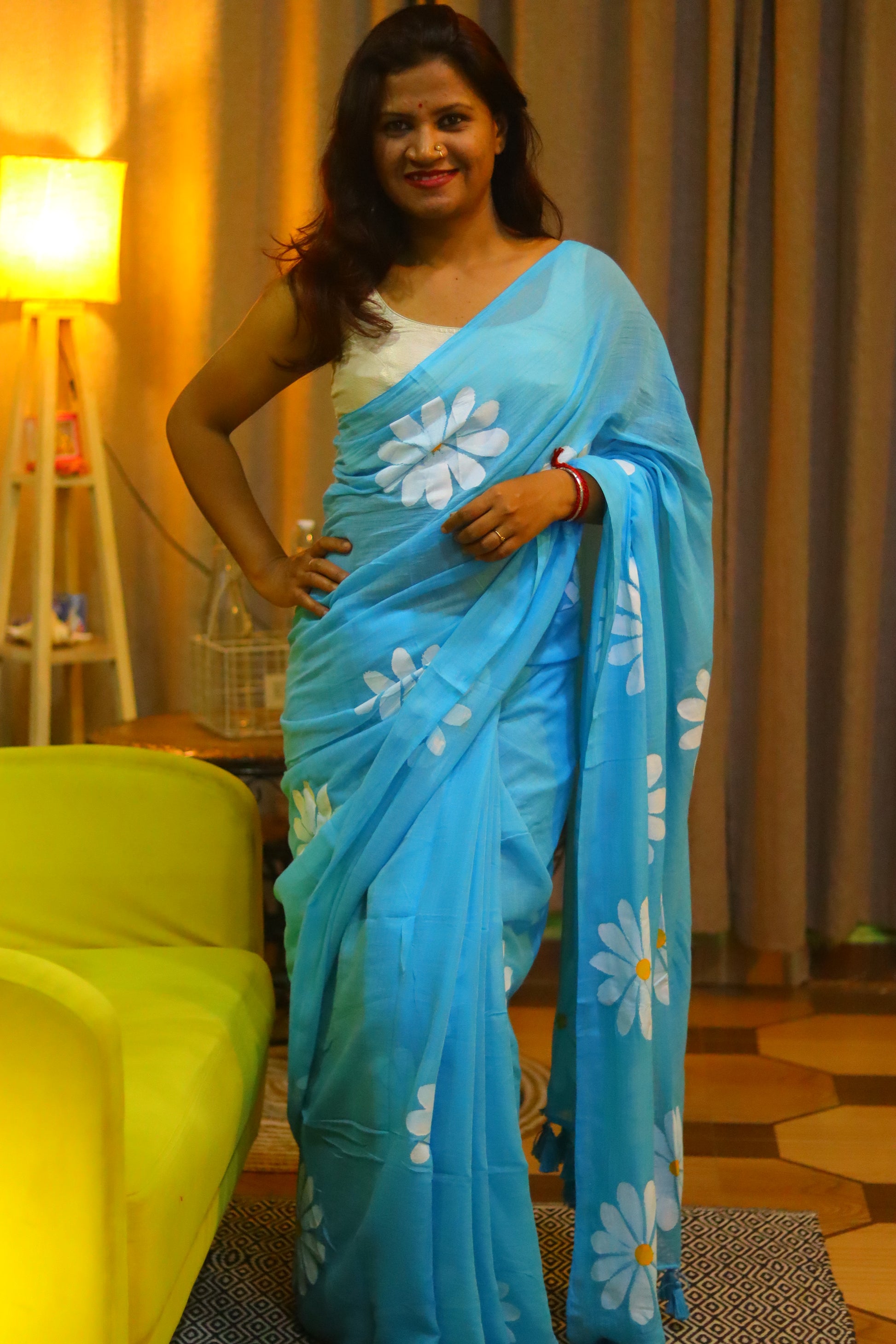 "Floral Skies" - A serene sky blue mul cotton saree, adorned with delicate white hand-painted flowers that seem to float across the fabric like clouds in a clear blue sky. This enchanting saree embodies the beauty of a sunny day, filling your heart with joy and your spirit with tranquility.