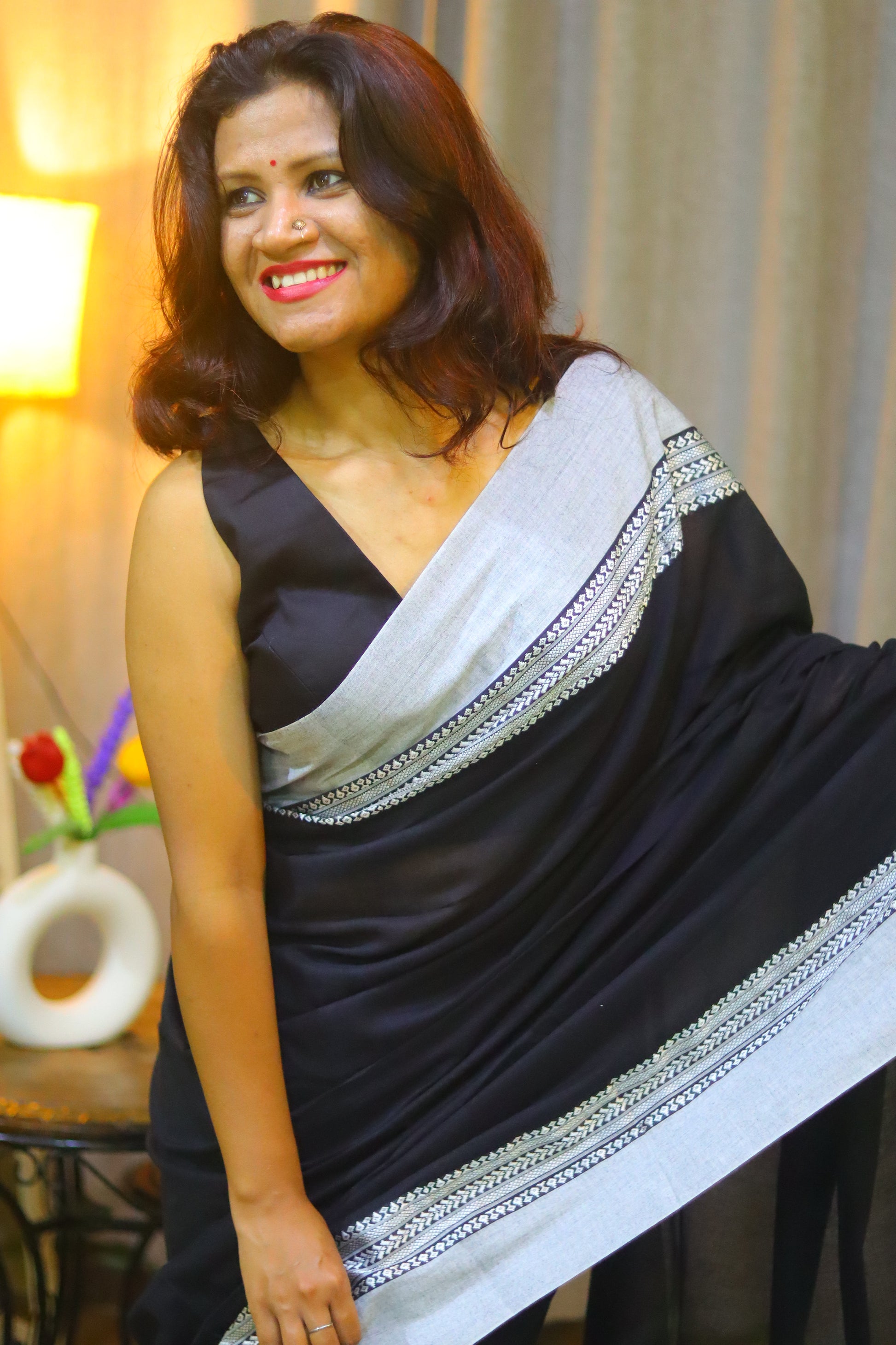 Embrace refined elegance with our stunning black saree, highlighted by a thick grey border adorned with delicate embroidery. The smooth black fabric flows effortlessly, creating a striking contrast with the intricate craftsmanship on the grey border. This saree combines modern simplicity with a touch of traditional artistry, making it perfect for both formal events and festive occasions. Whether it's the subtle shimmer of the threadwork or the rich depth of the black, this saree is designed to captivate with its understated beauty