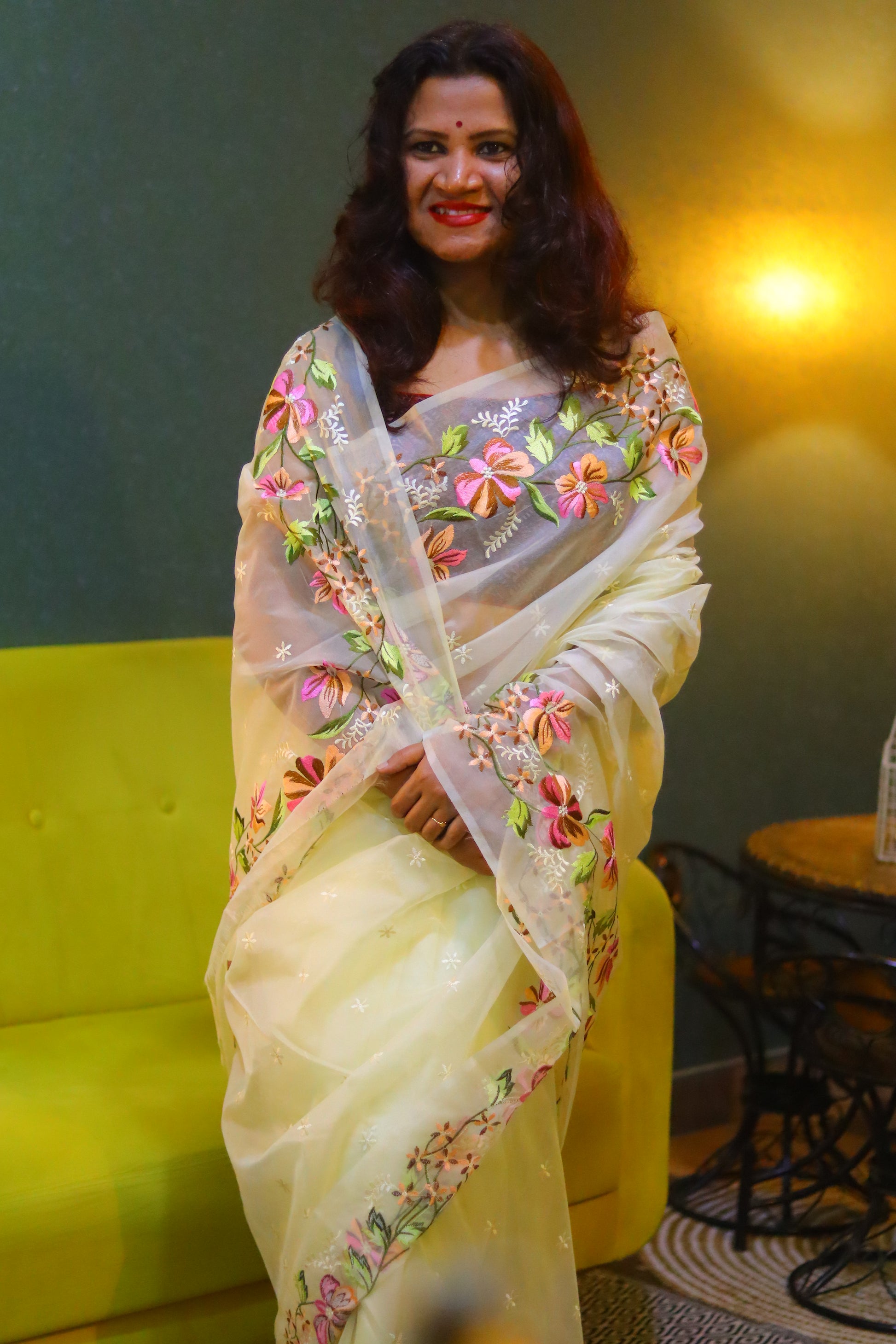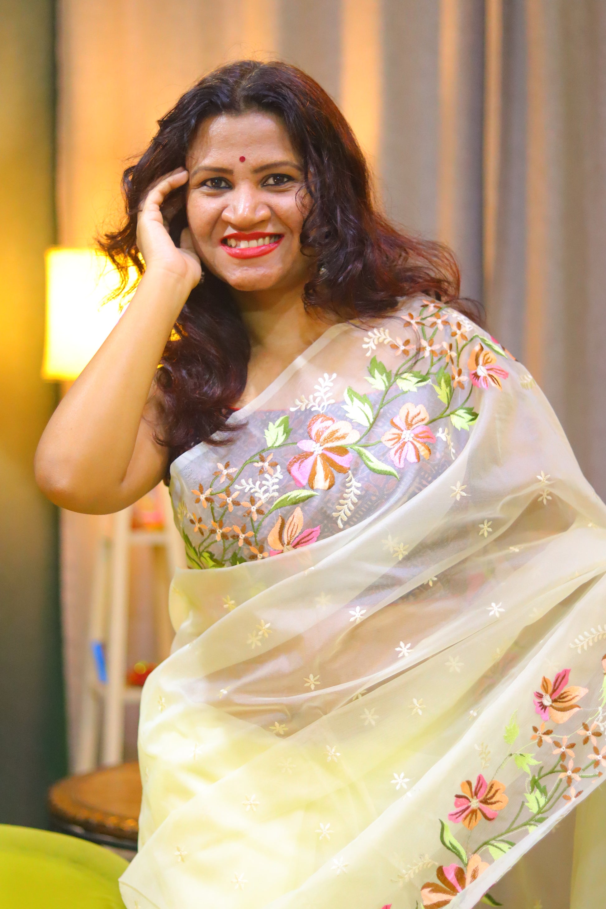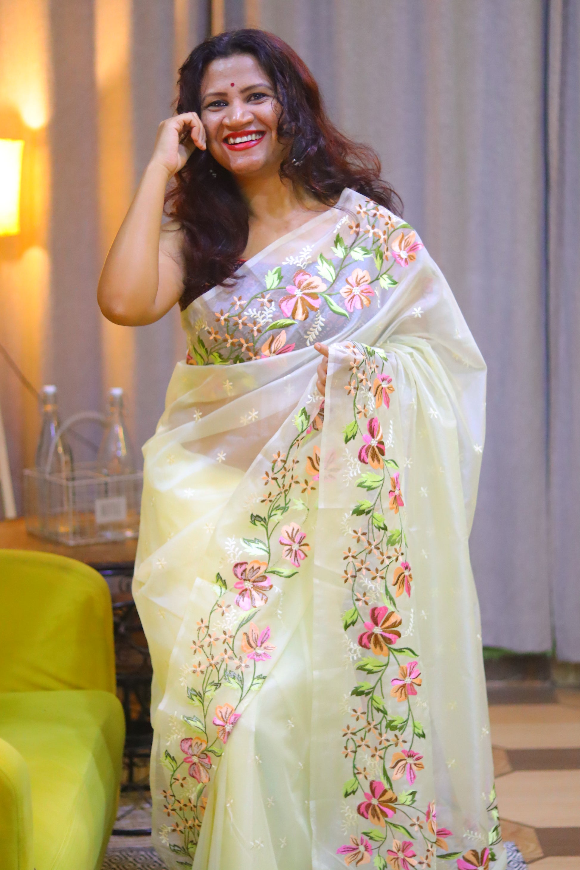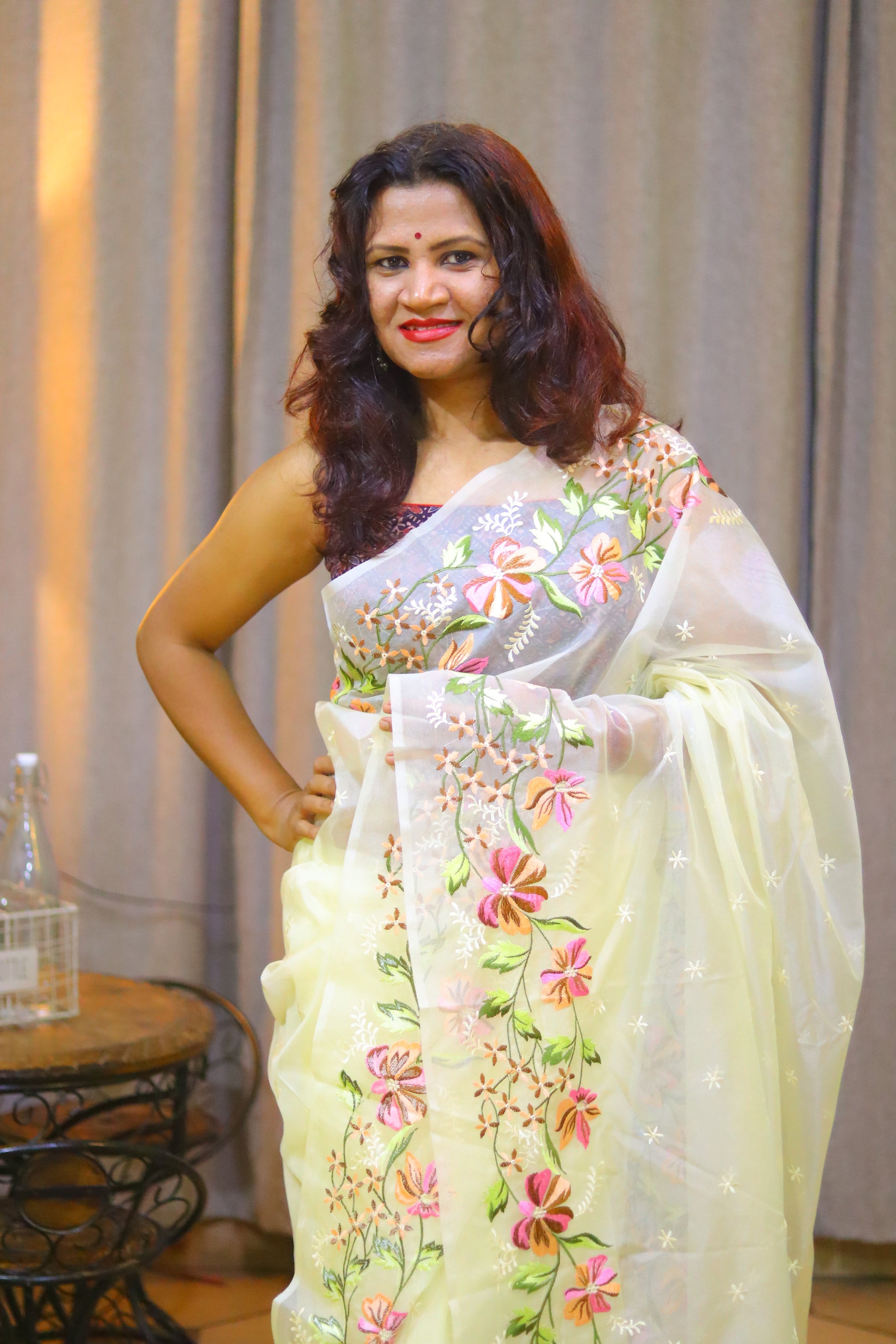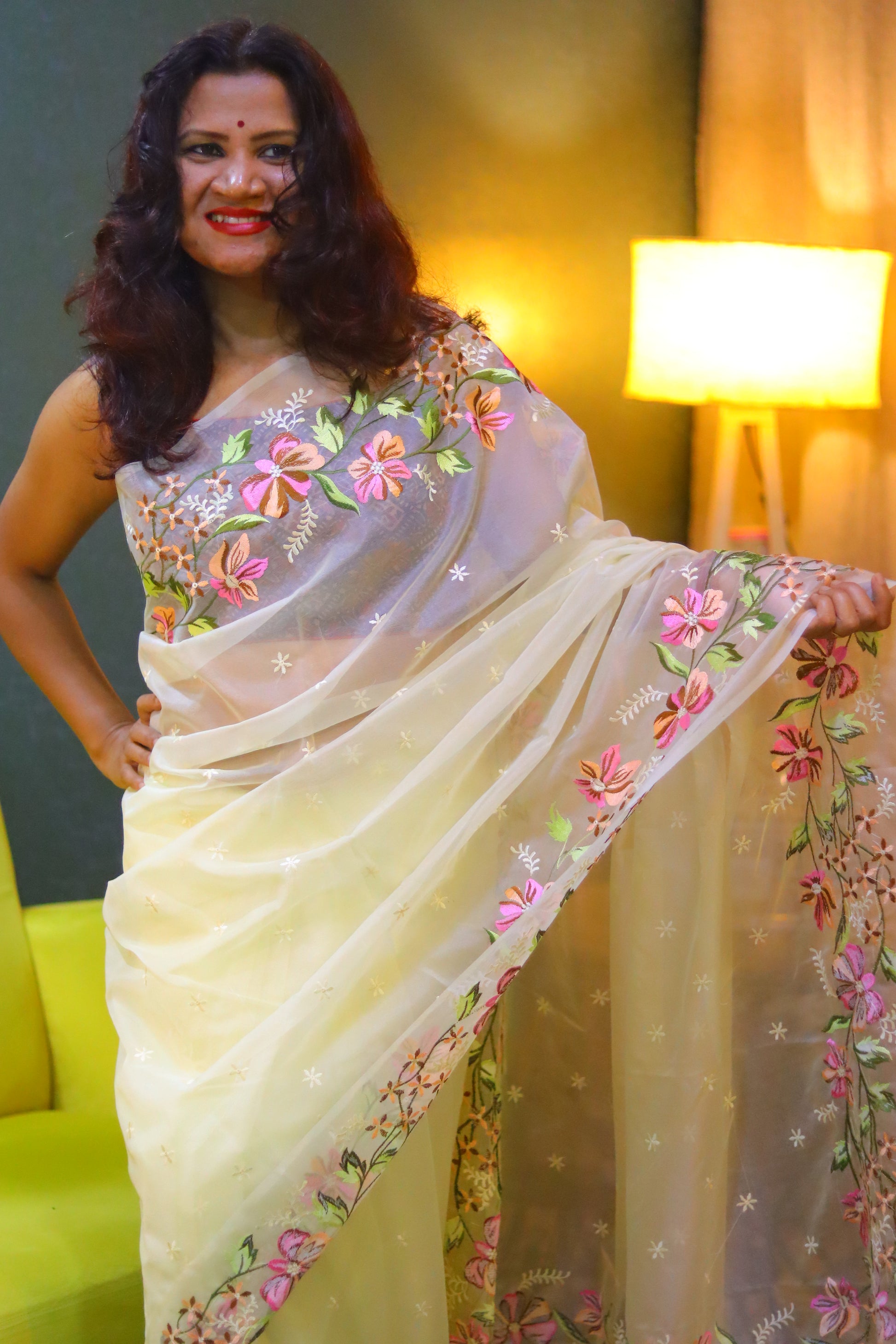 Light of life is a off white organza saree with vibrant embroidered floral border and small buta embroidery all over saree . Saree has a blouse piece attached to it
