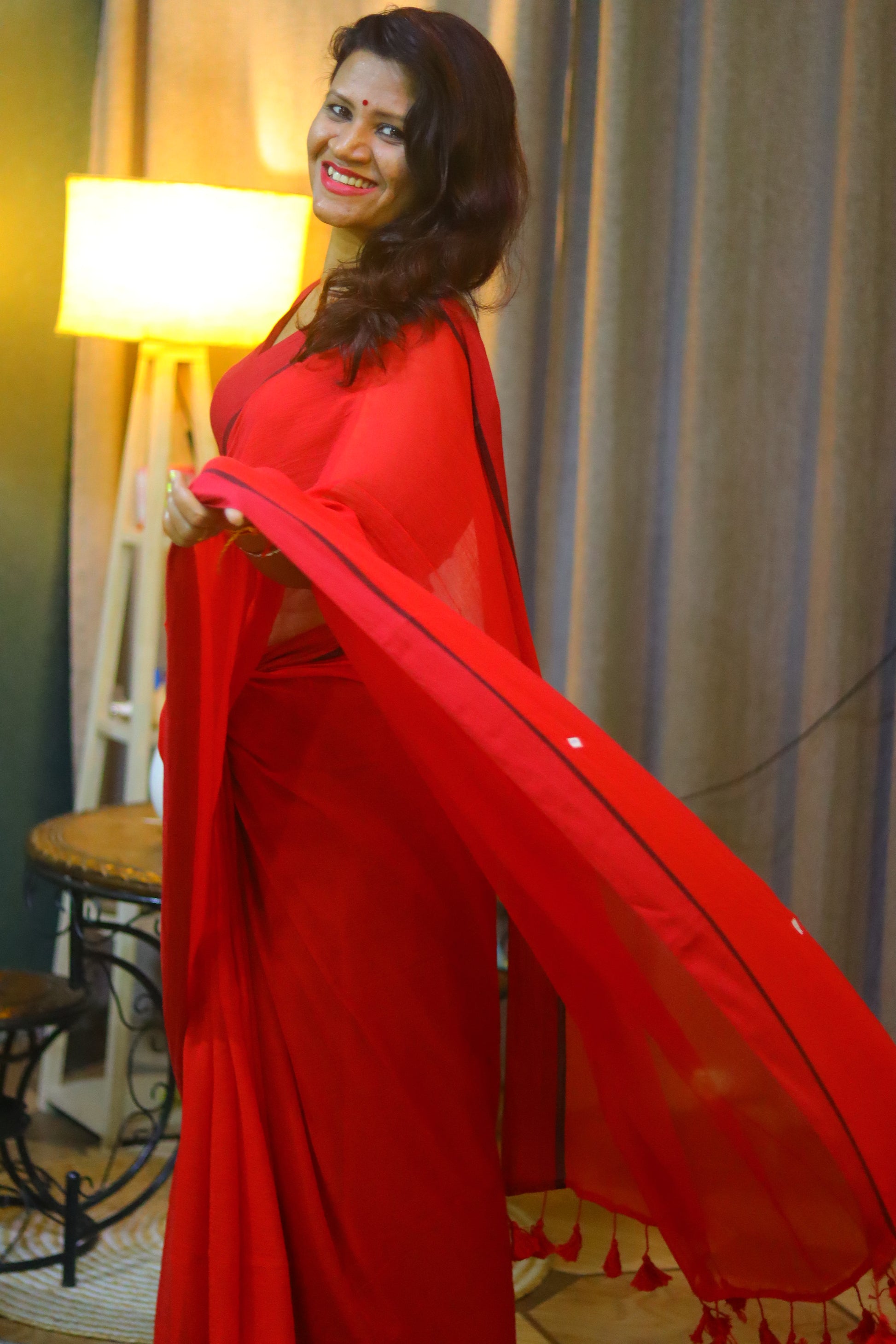 Radiate charm with this vibrant red saree, beautifully accented by a soft pink border. The striking contrast between the bold red and delicate pink adds a touch of elegance, making it perfect for festive celebrations and special occasions.