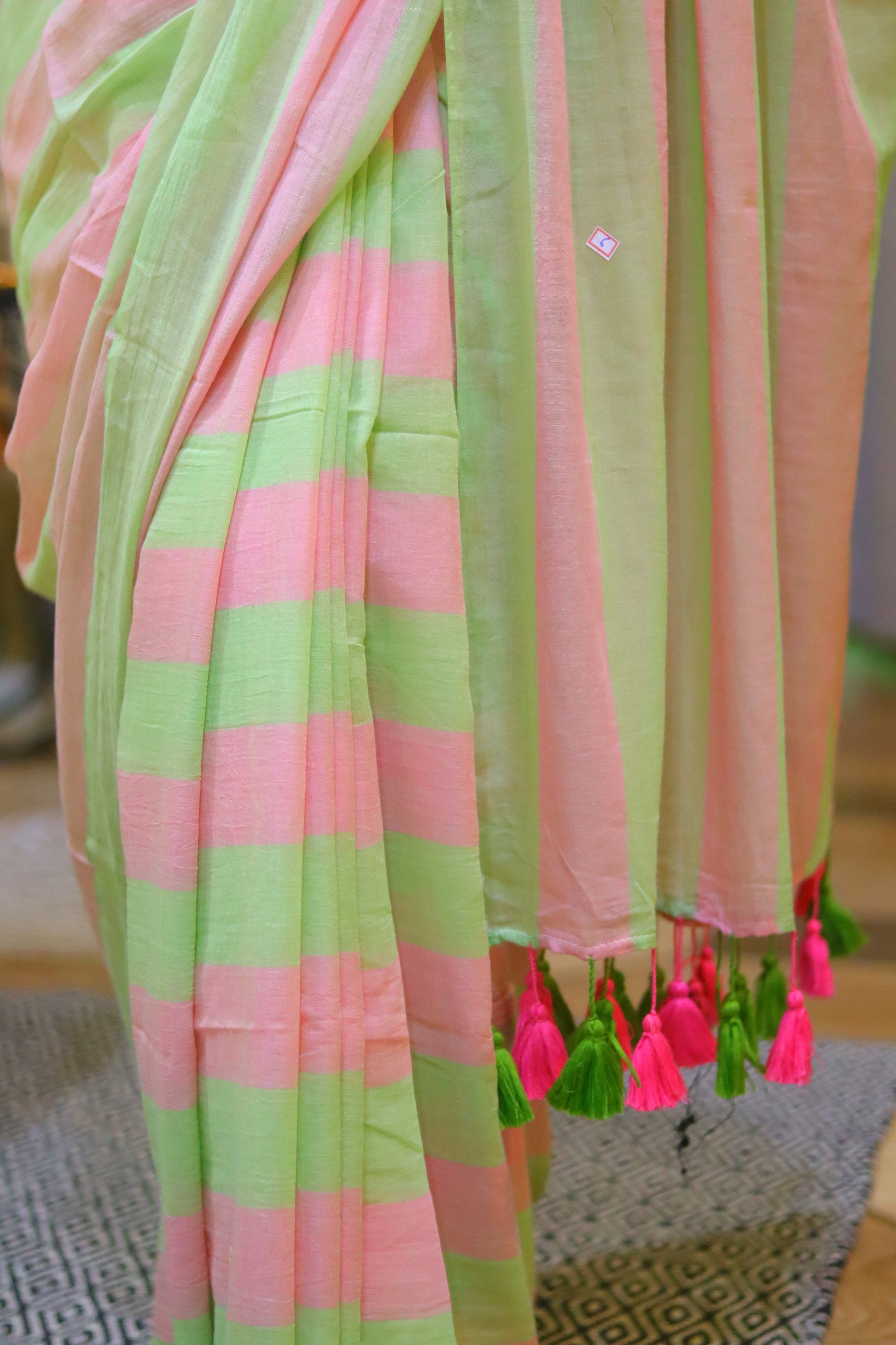 Meethi baatein is a soft Mul cotton saree with thick pista green and pink lines running one after the other. This enchanting saree embodies the beauty of a sunny day, filling your heart with joy and your spirit with tranquility