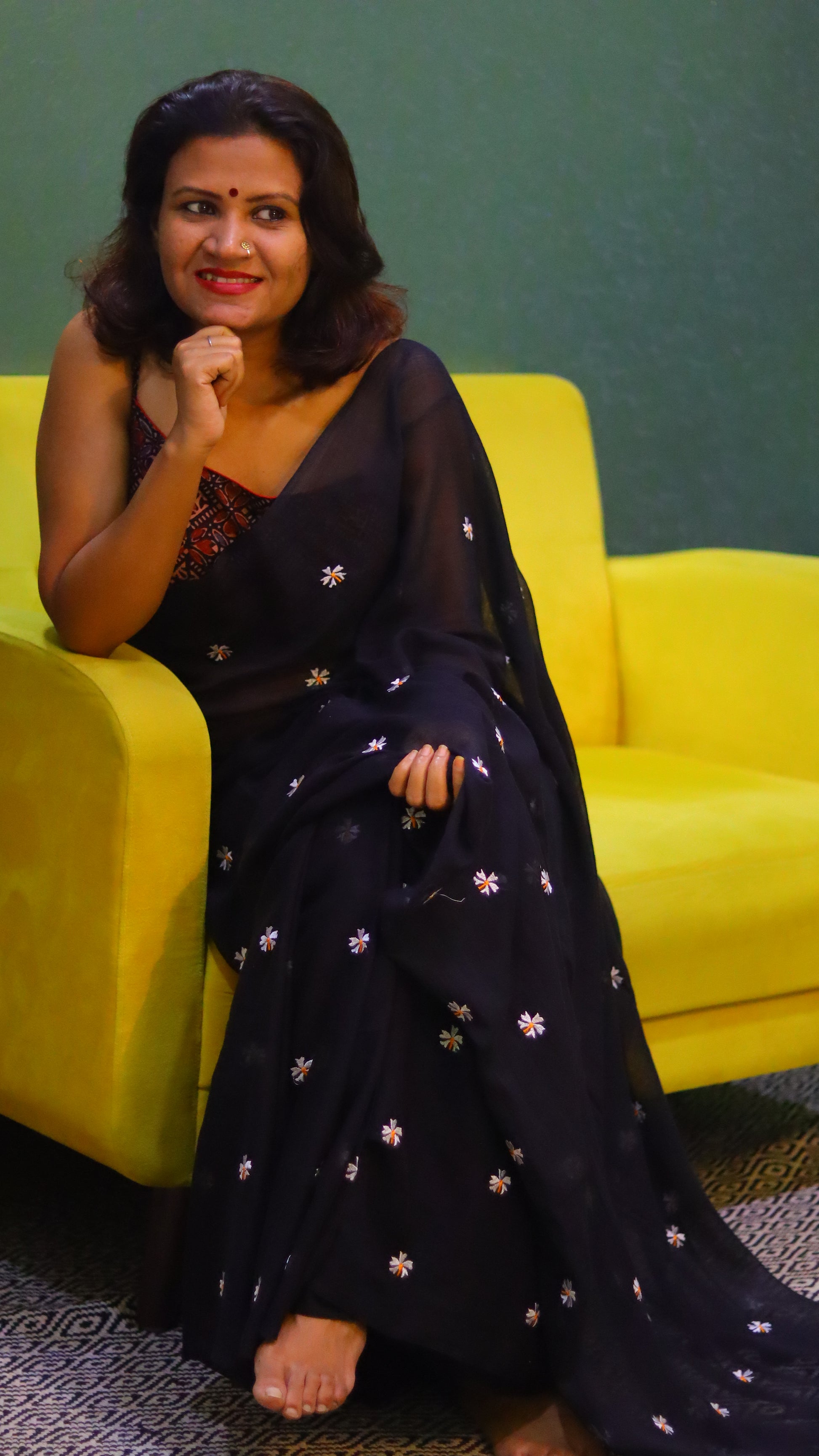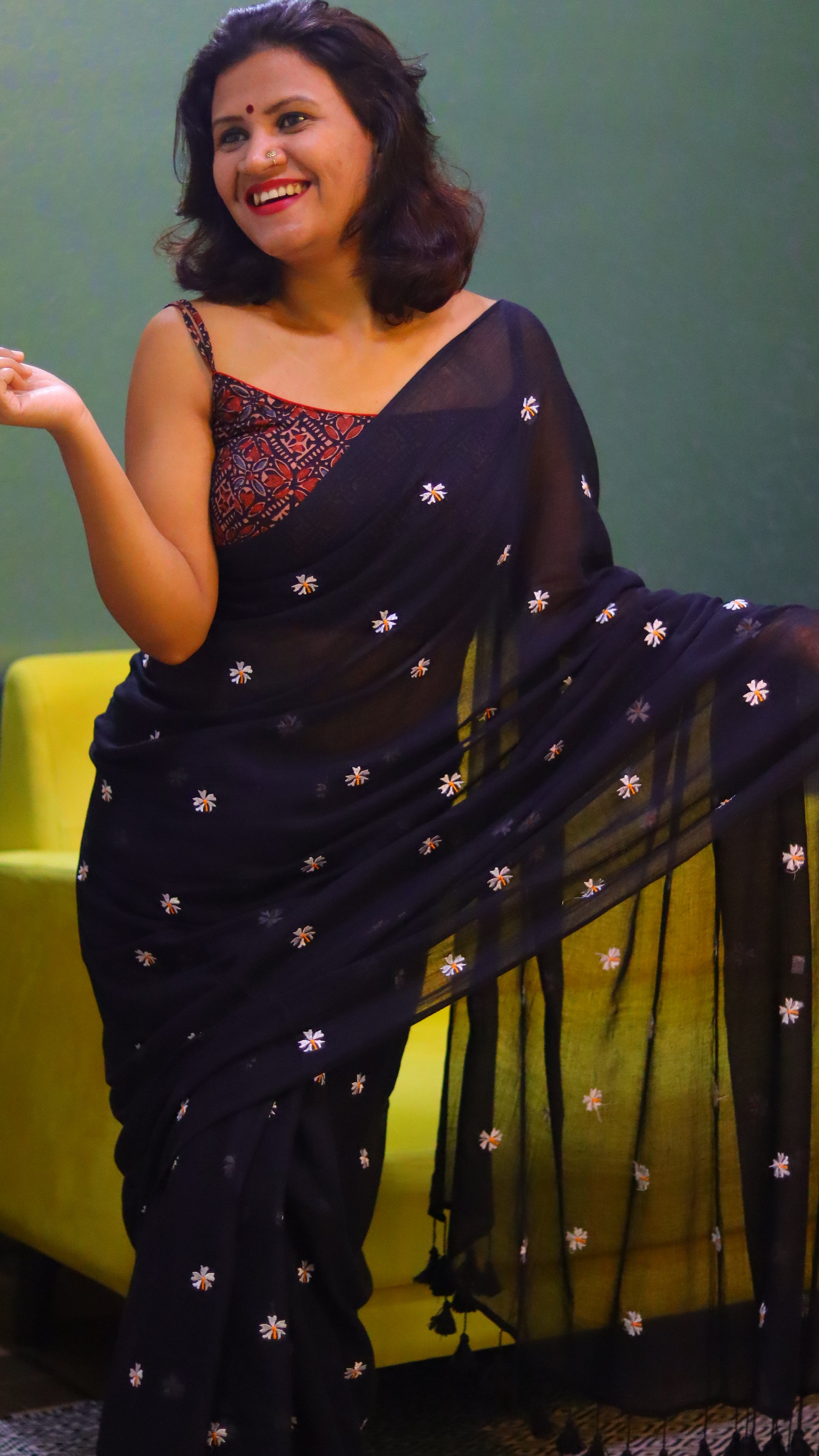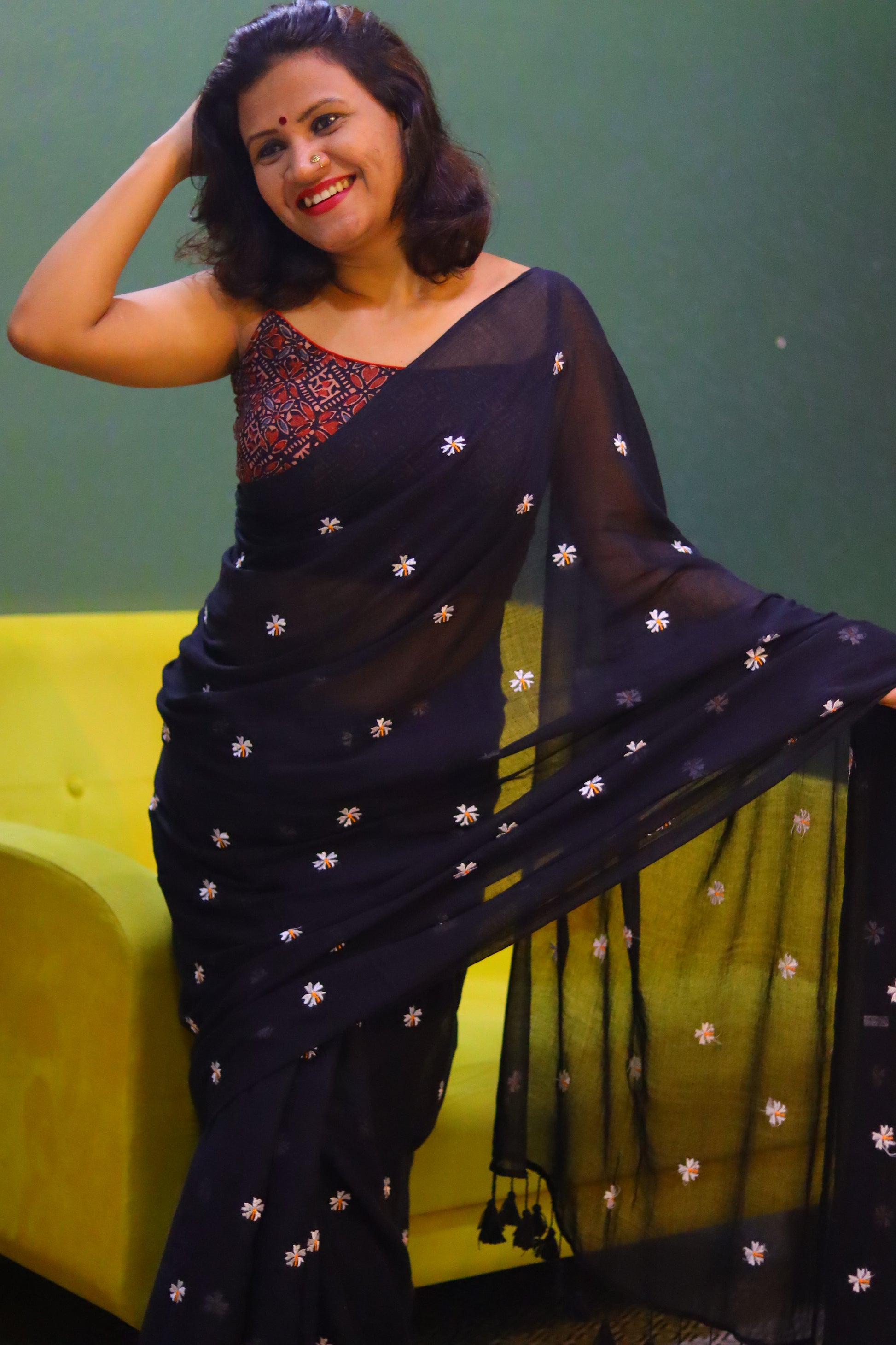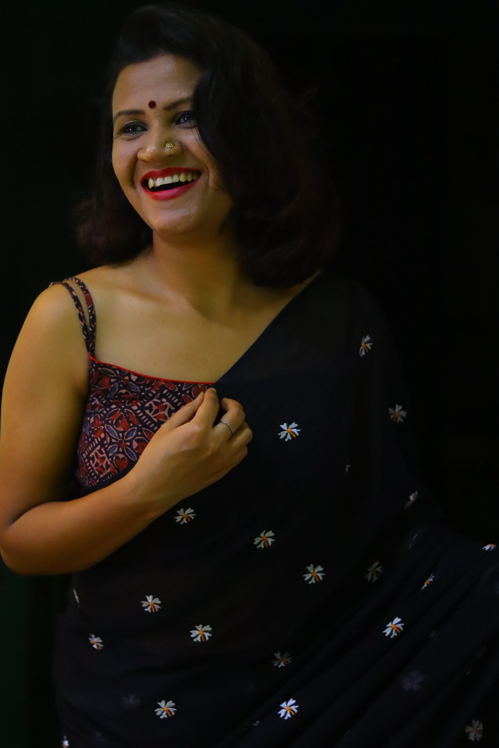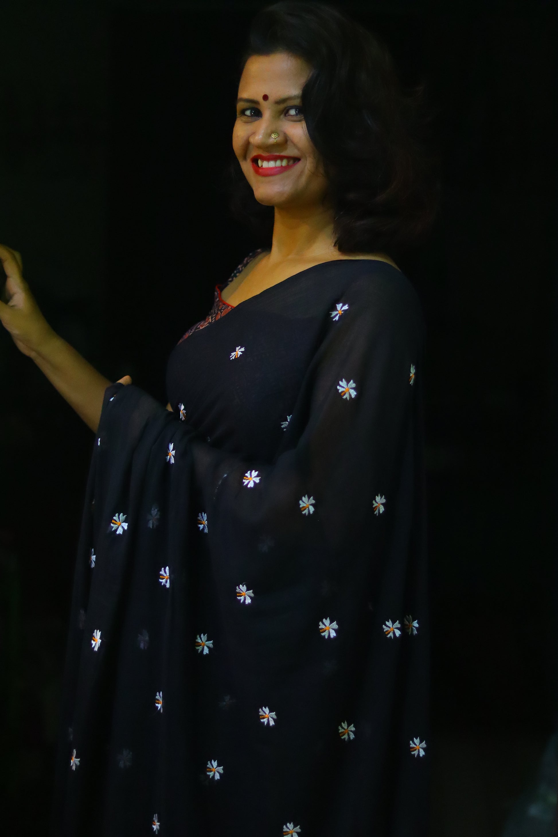 "The stunning black saree is adorned with delicate white Seuli flowers, intricately woven throughout the fabric. The stark contrast between the rich, dark background and the pure white blooms creates a dramatic and elegant visual effect.