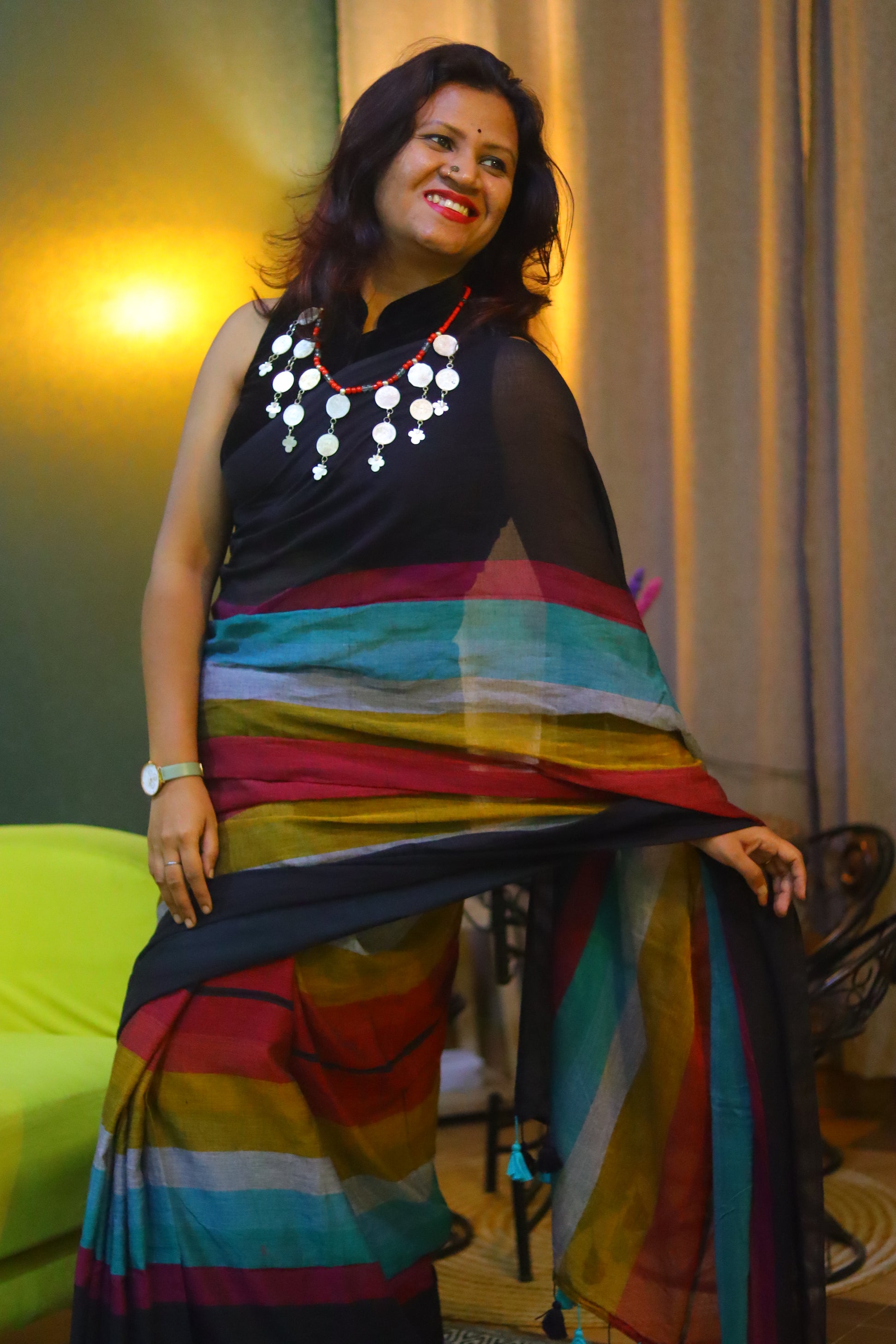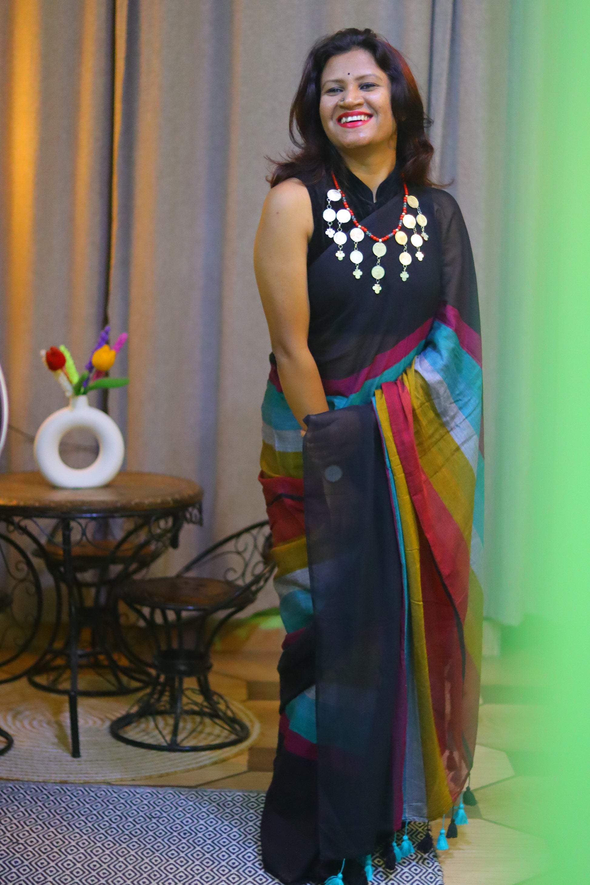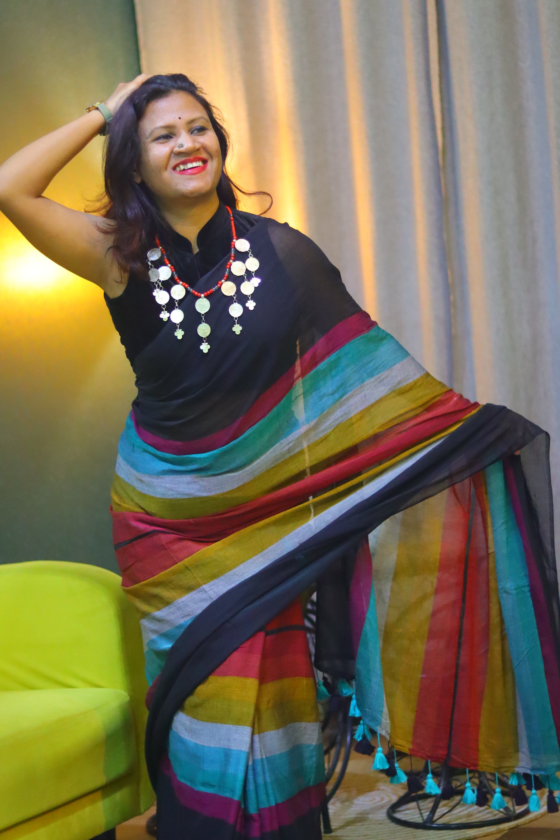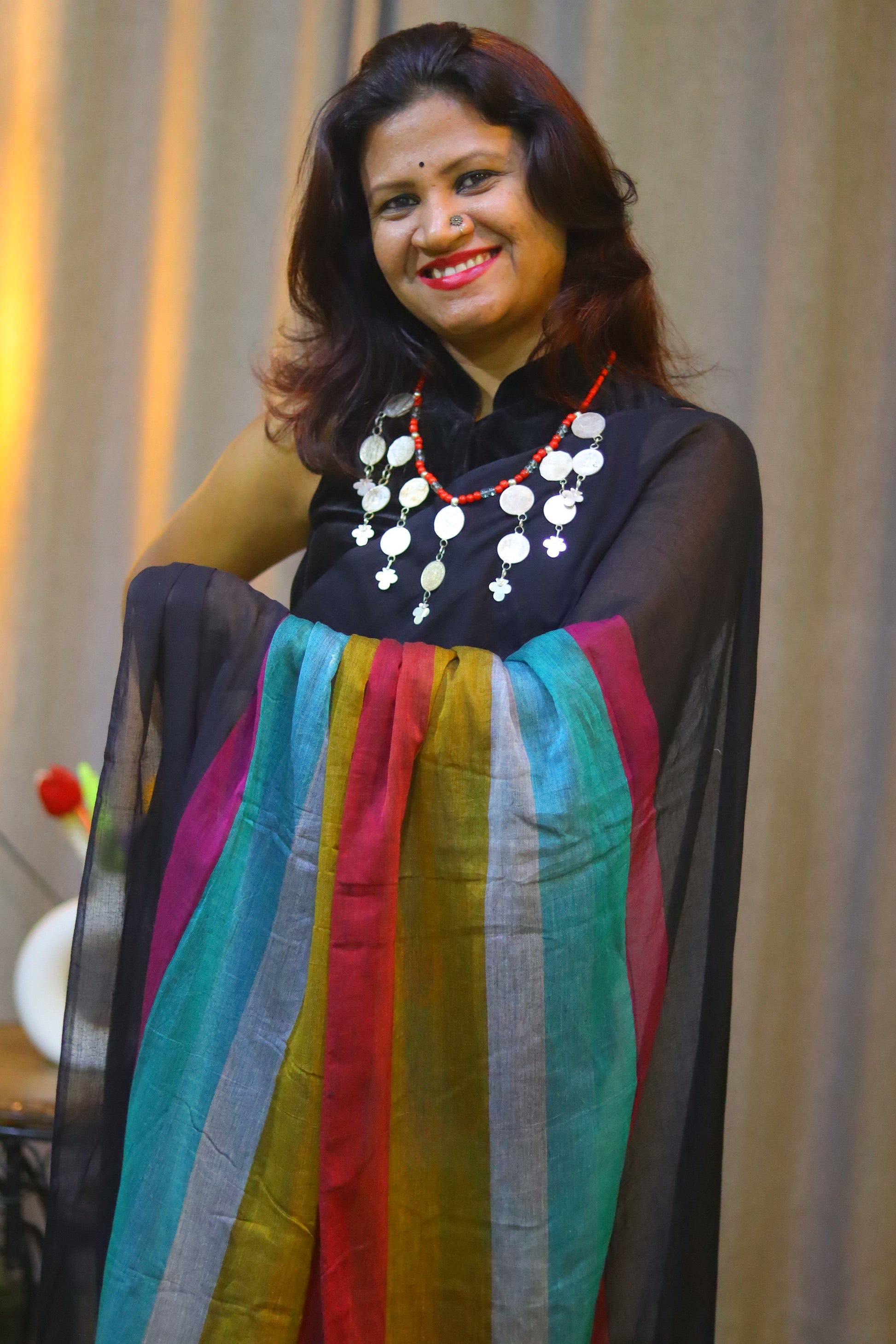 Turn heads with this striking black saree, accentuated by vibrant, colorful stripes running through the middle. The bold contrast of deep black with playful hues creates a perfect balance of tradition and modernity. Ideal for evening events or festive gatherings, this saree exudes confidence, charm, and individuality