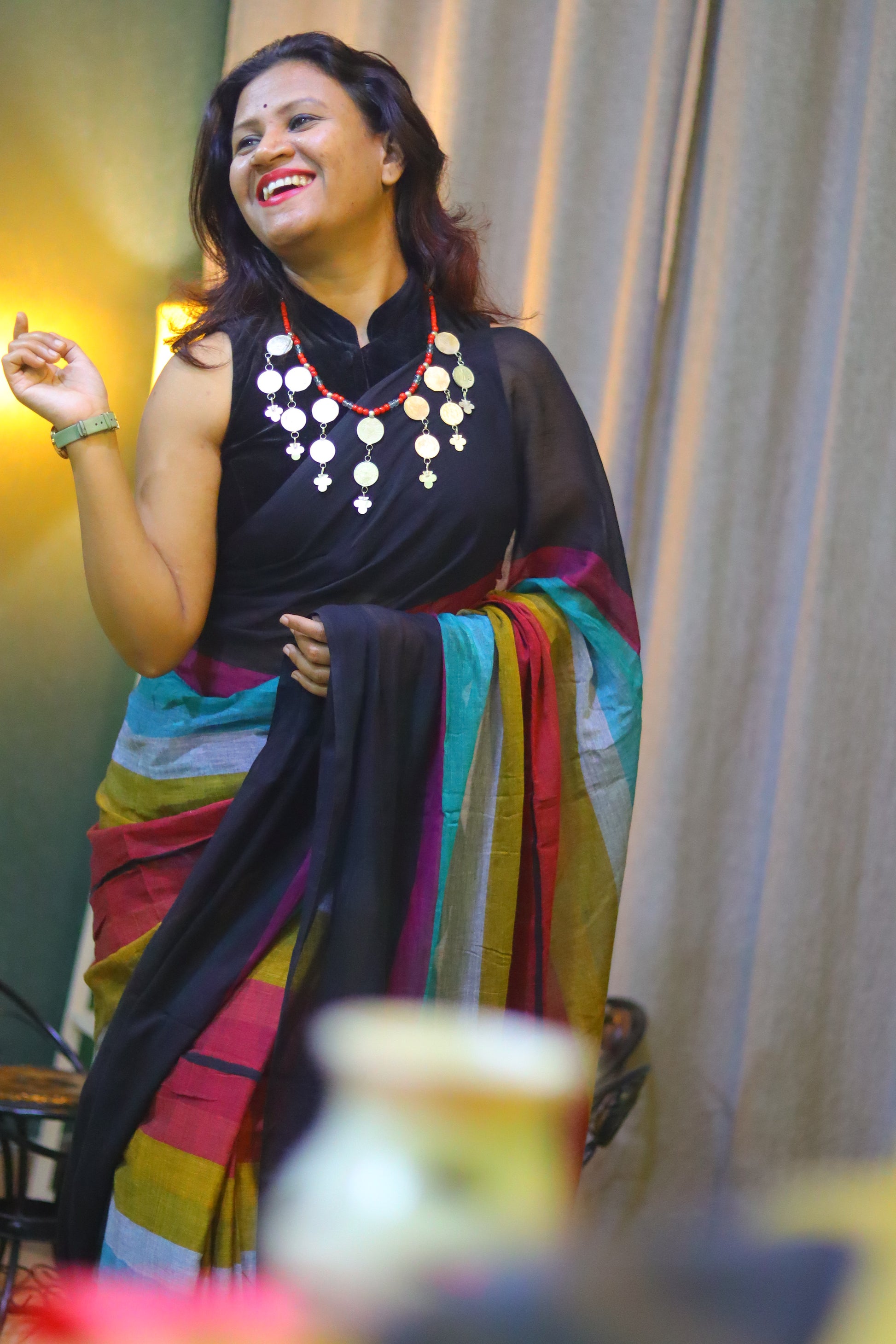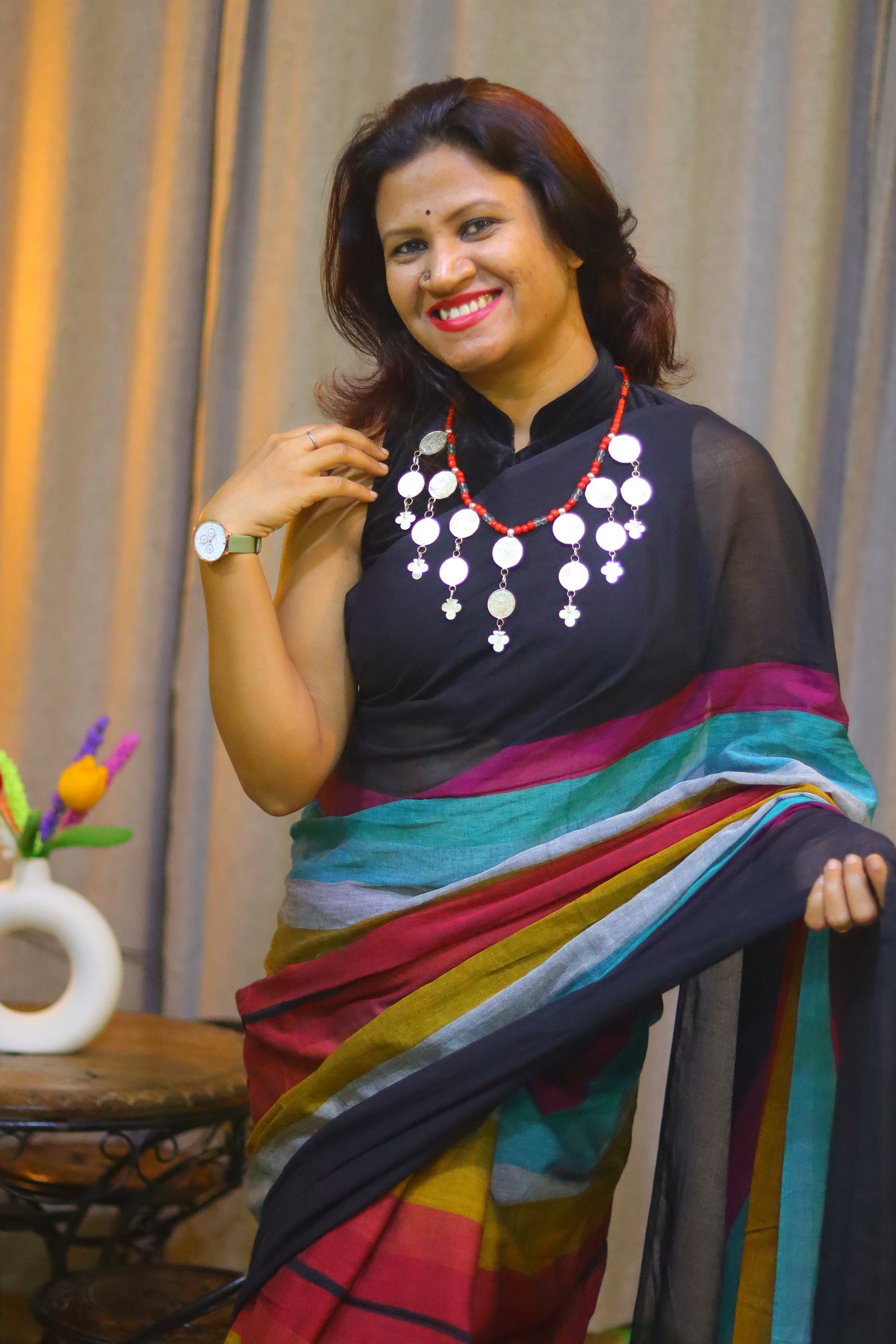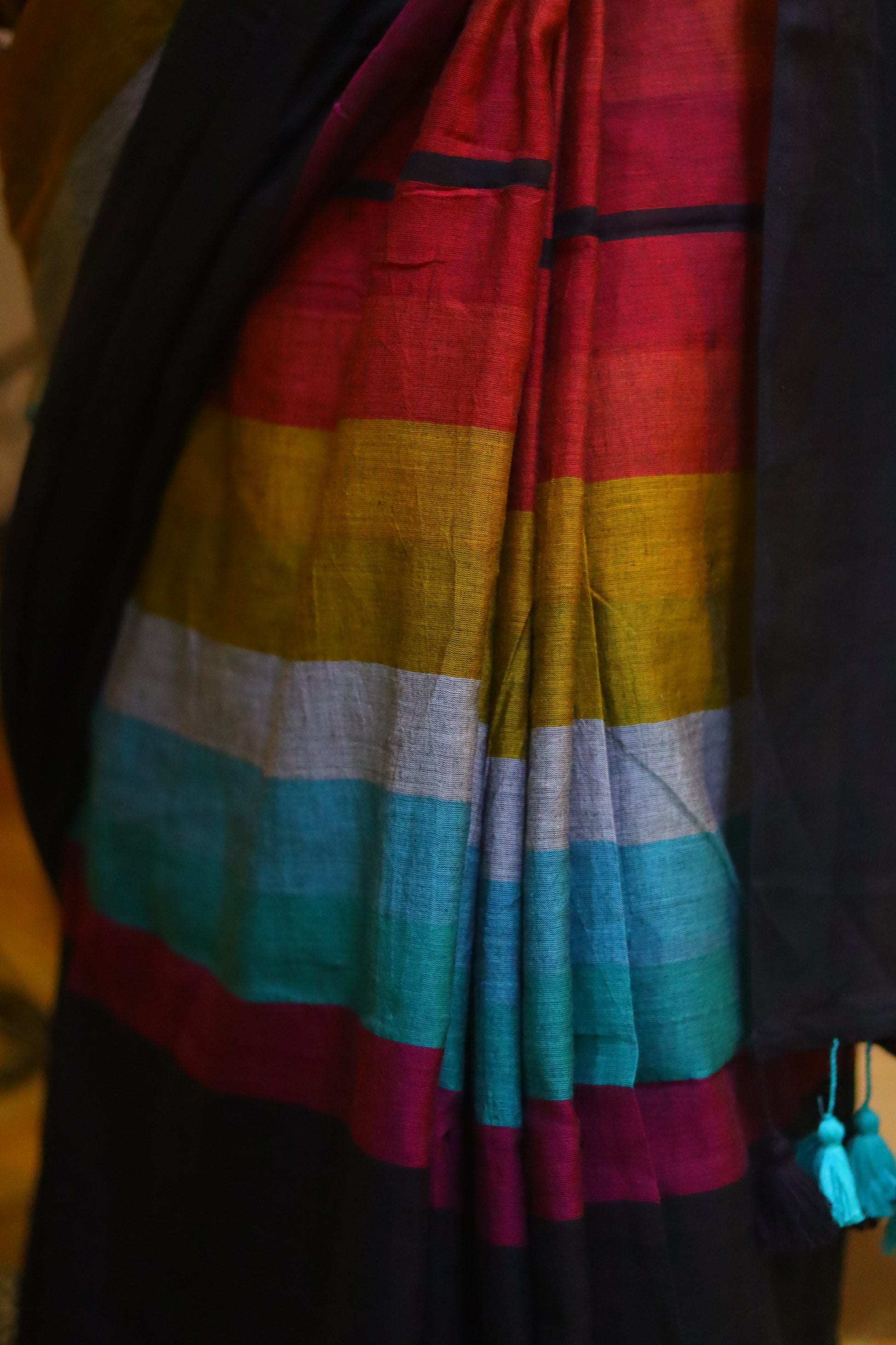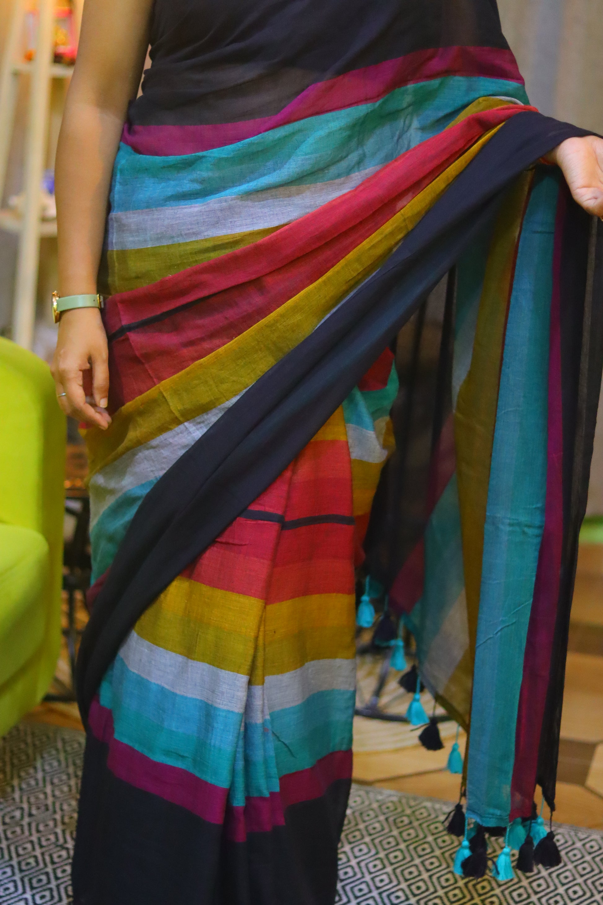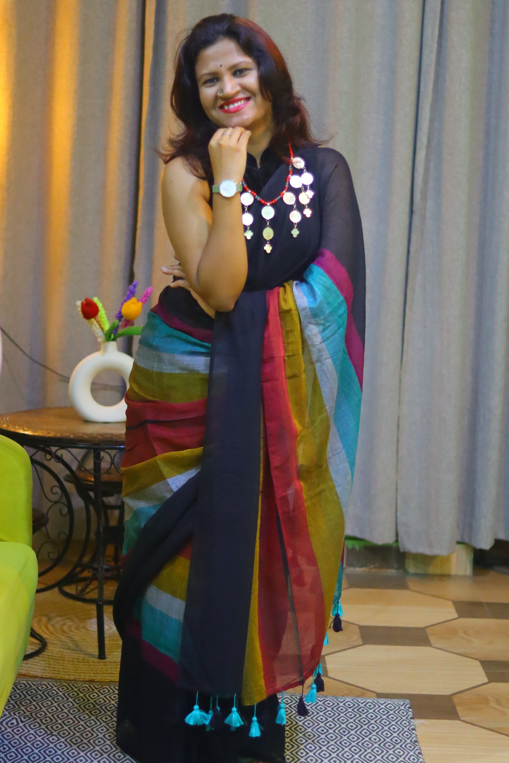 Turn heads with this striking black saree, accentuated by vibrant, colorful stripes running through the middle. The bold contrast of deep black with playful hues creates a perfect balance of tradition and modernity. Ideal for evening events or festive gatherings, this saree exudes confidence, charm, and individuality
