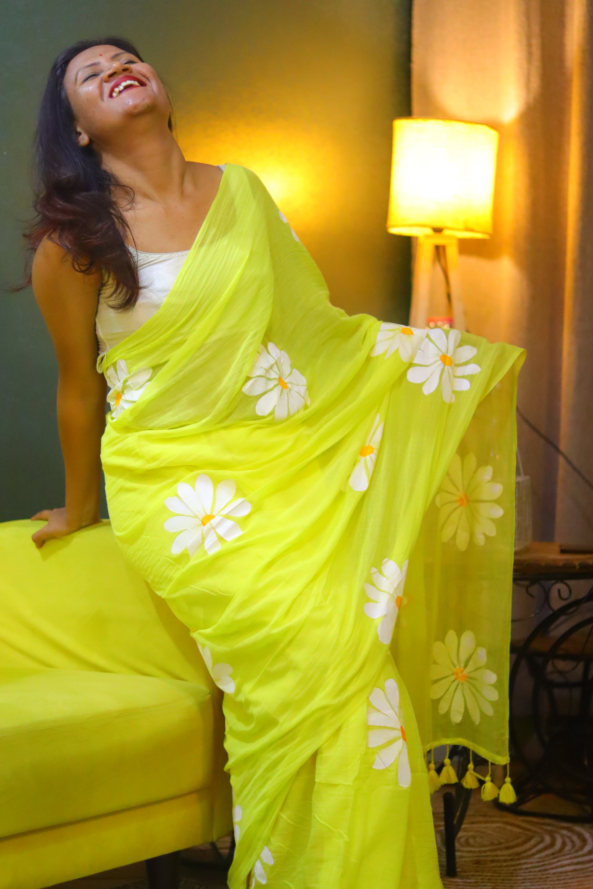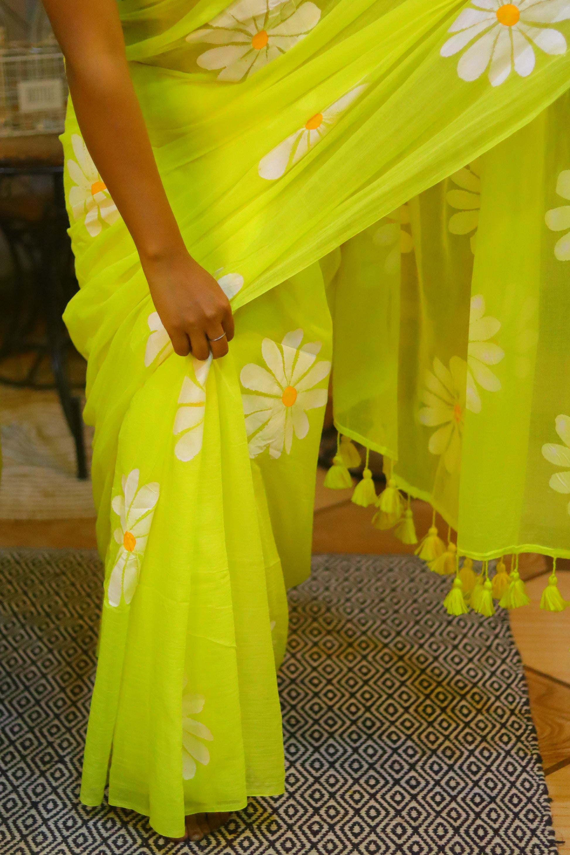 "Morning Dew" - A soft, serene light yellow mul cotton saree, gently adorned with delicate white hand-painted flowers that evoke the freshness of morning dew. This enchanting saree exudes warmth, innocence, and effortless elegance, perfect for a serene and ethereal look.