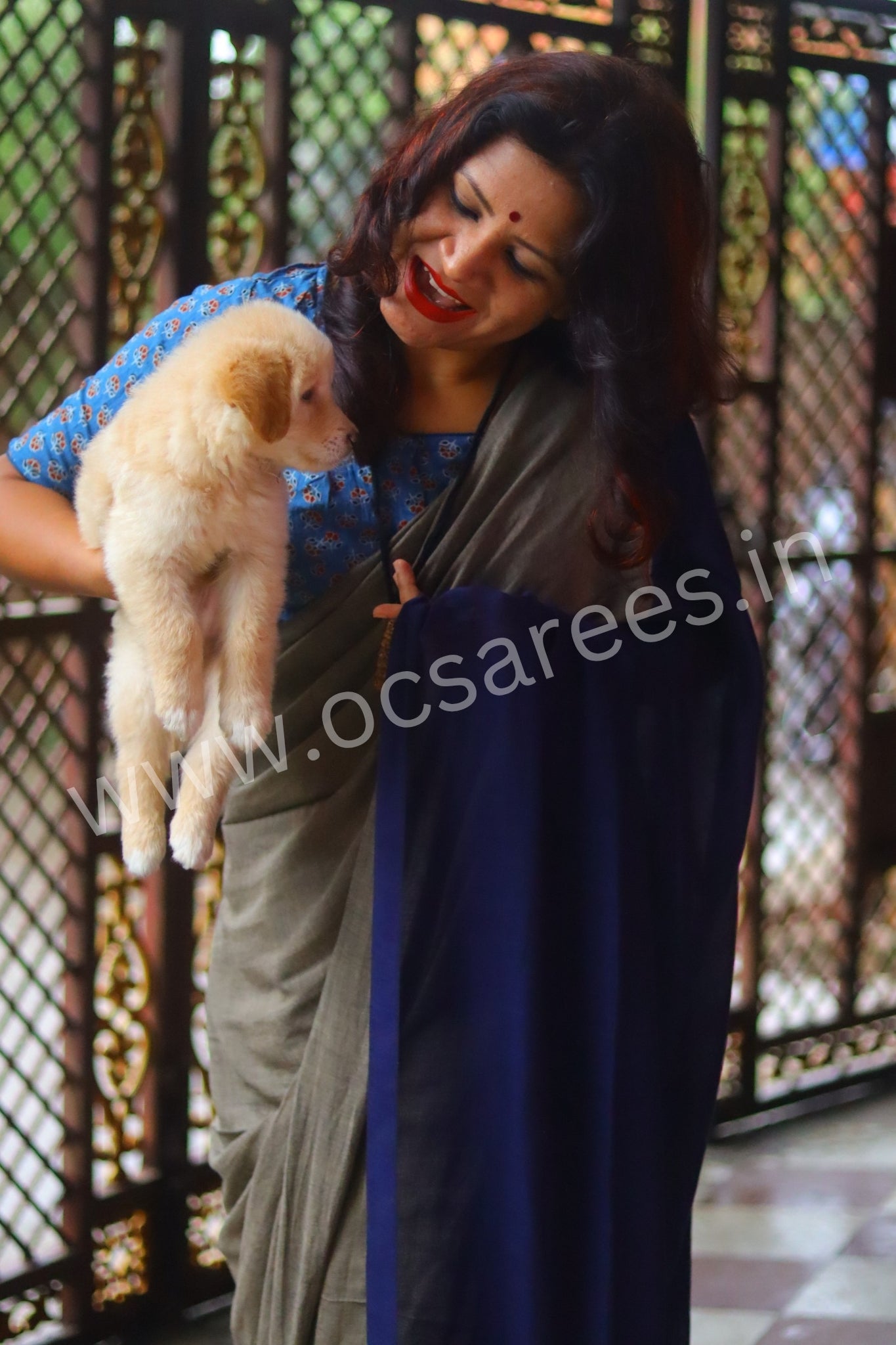 Misty mornings and serene skies come alive in Neel Dhundh, a beautifully balanced saree with a soft grey body and a calming blue anchal. Crafted in a breathable cotton blend, this saree blends everyday ease with understated elegance. The smooth transition from the muted grey to the vibrant blue reflects harmony, perfect for both work and casual gatherings. The anchal ends in matching blue tassels, adding a playful sway to every step. Neel Dhundh is for the woman who carries grace in simplicity and finds beauty in the quietest hues