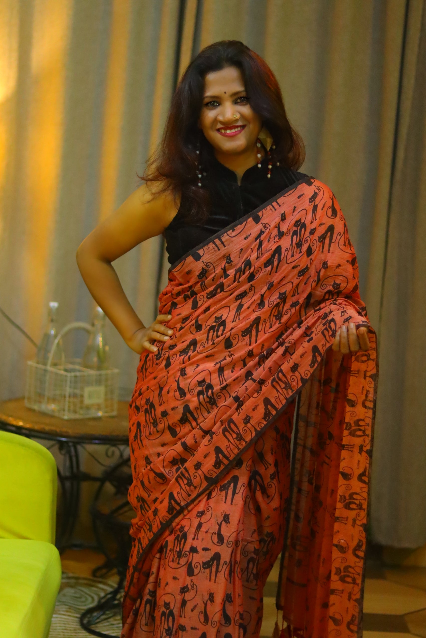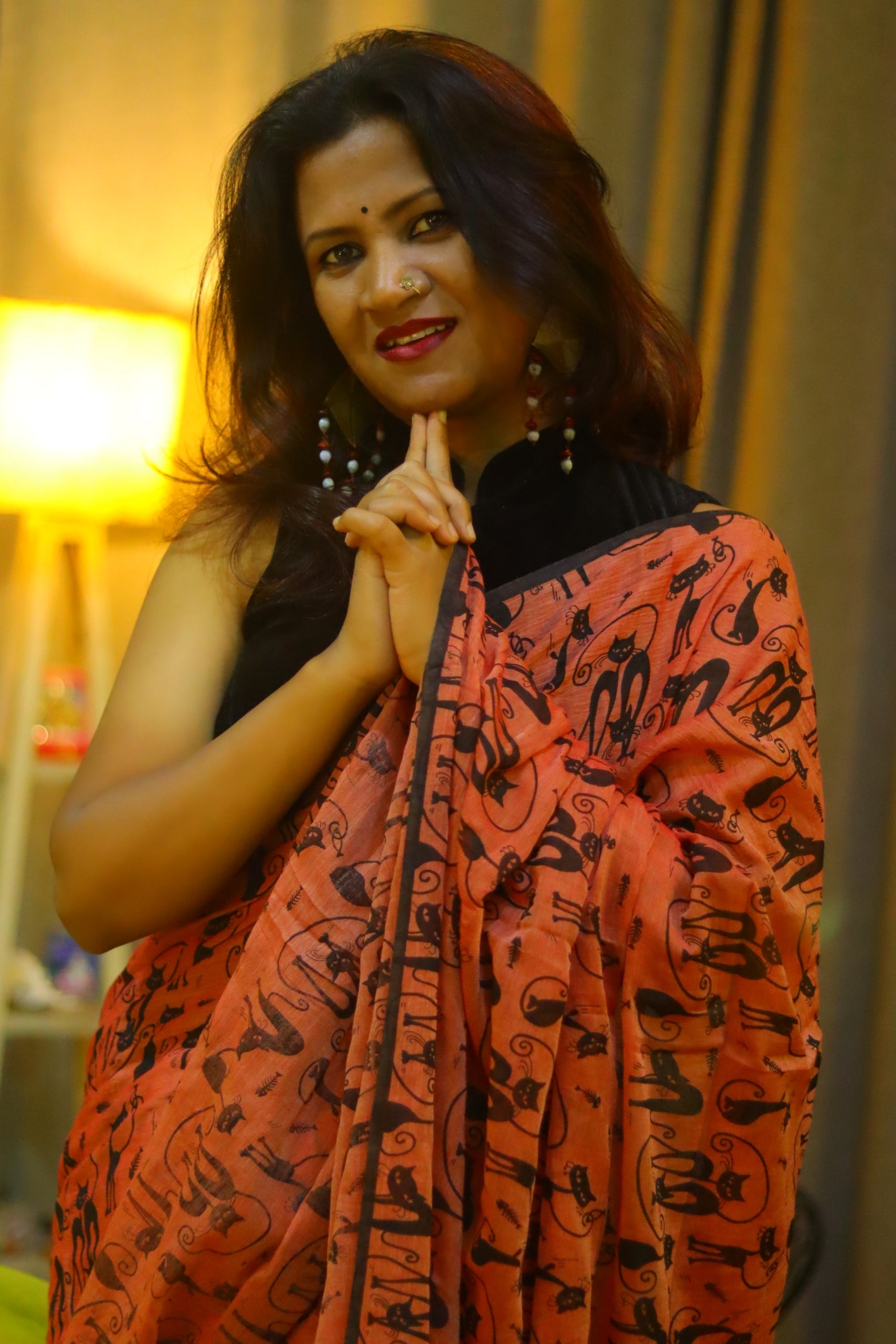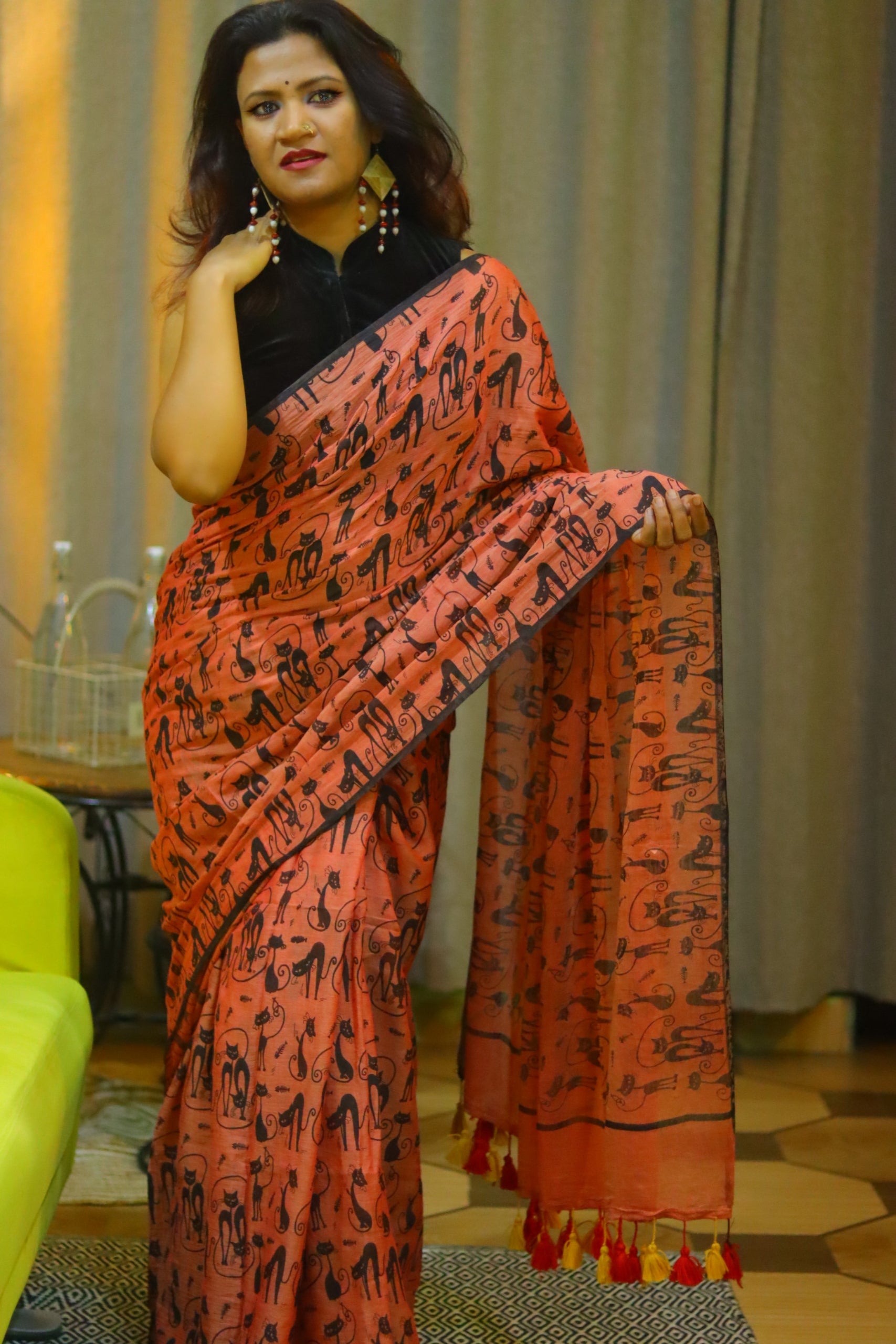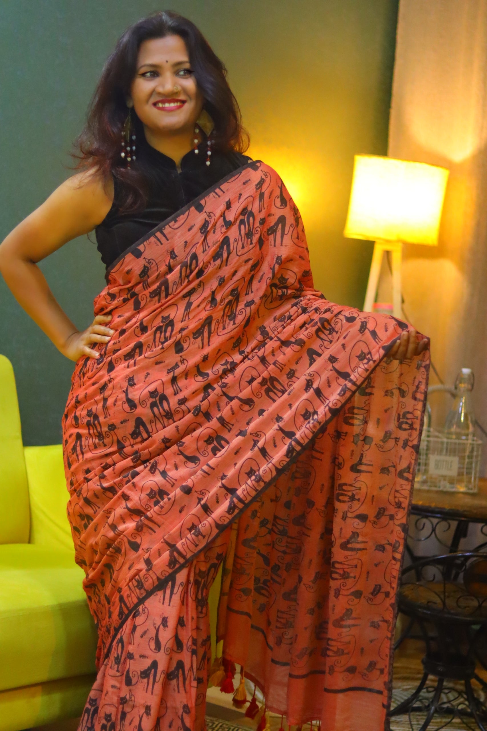 Get ready to make a stylish statement with Purrfectly Chic, a unique and playful saree featuring adorable cat prints all over. This six-yard wonder is perfect for cat lovers and fashionistas alike!