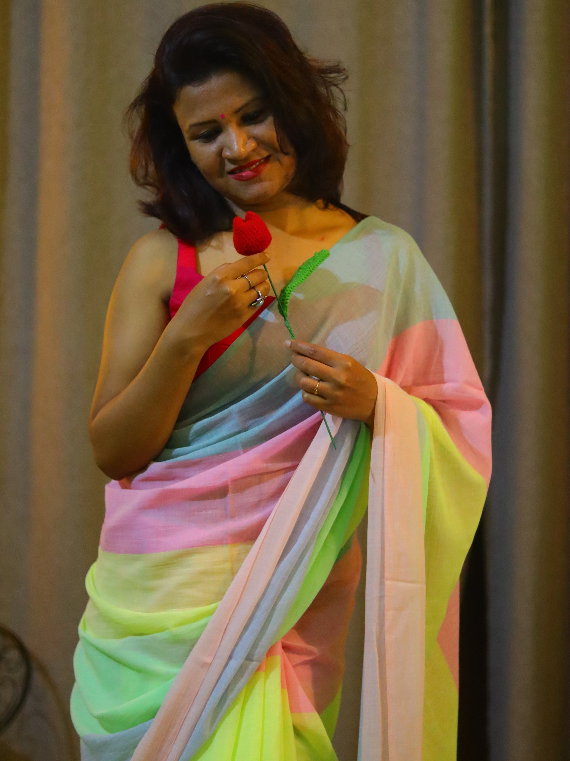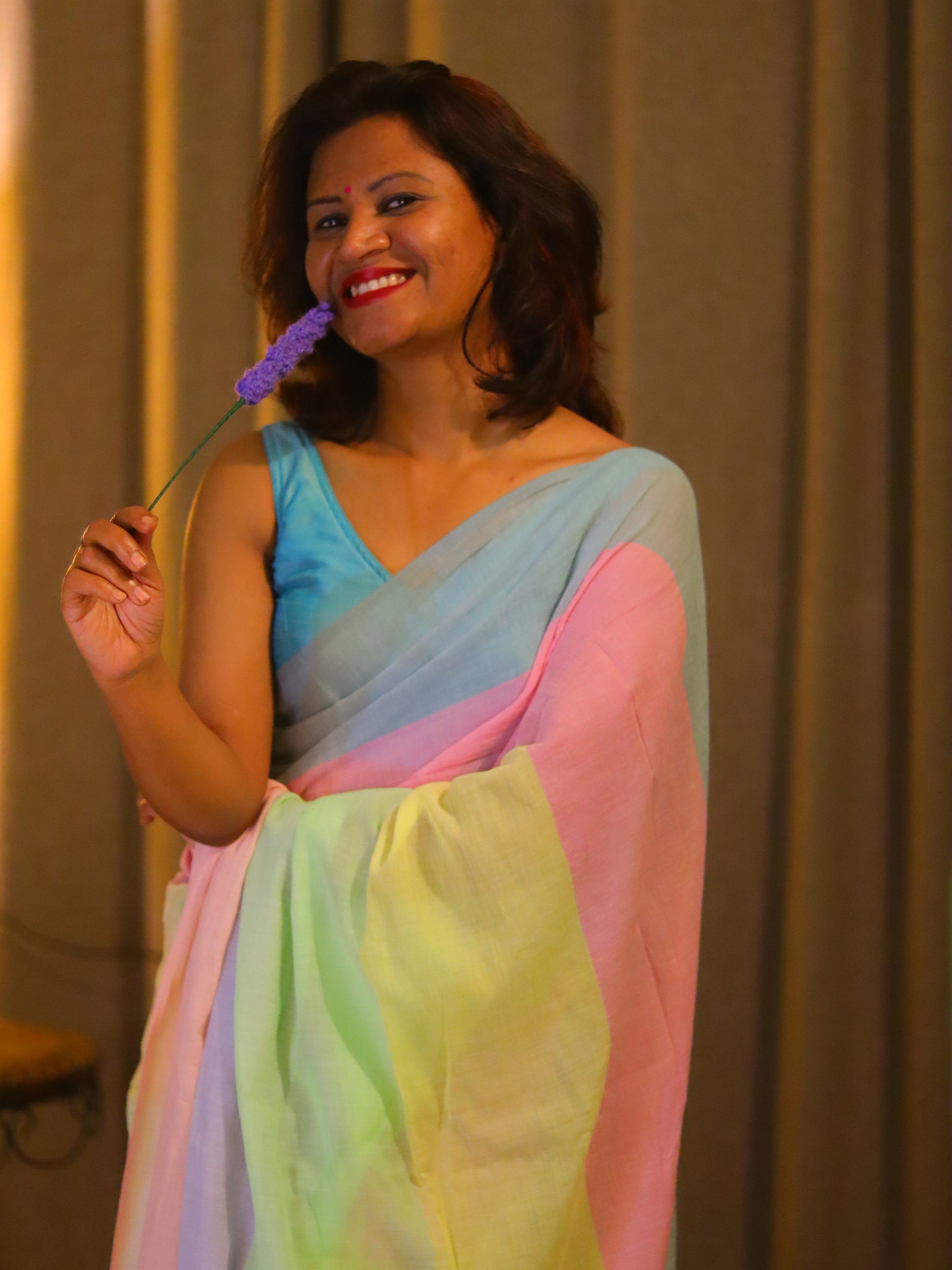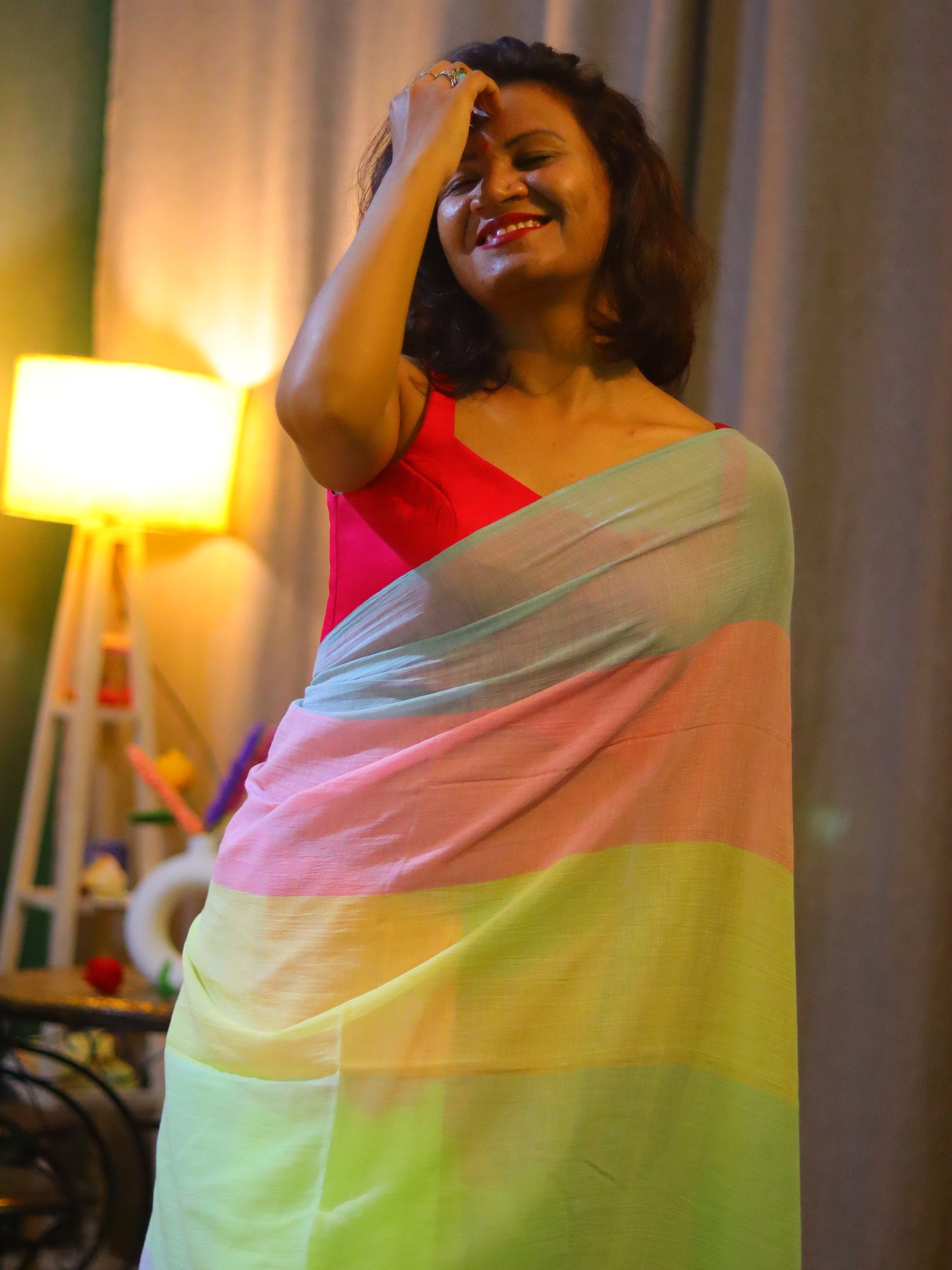 This dazzling saree, inspired by the vibrant hues of a rainbow, is a breathtaking blend of multiple colors seamlessly transitioning across the fabric. Each shade, from radiant red to serene violet, creates a stunning visual harmony, symbolizing joy, diversity, and positivity. The vivid spectrum of colors gives the saree a lively and playful appeal, perfect for festive occasions, celebrations, or special events. With its striking palette, this saree is a statement piece that brings a sense of optimism and creativity, ensuring you shine with confidence and flair wherever you go. It's the perfect embodiment of bold beauty and artistic expression.