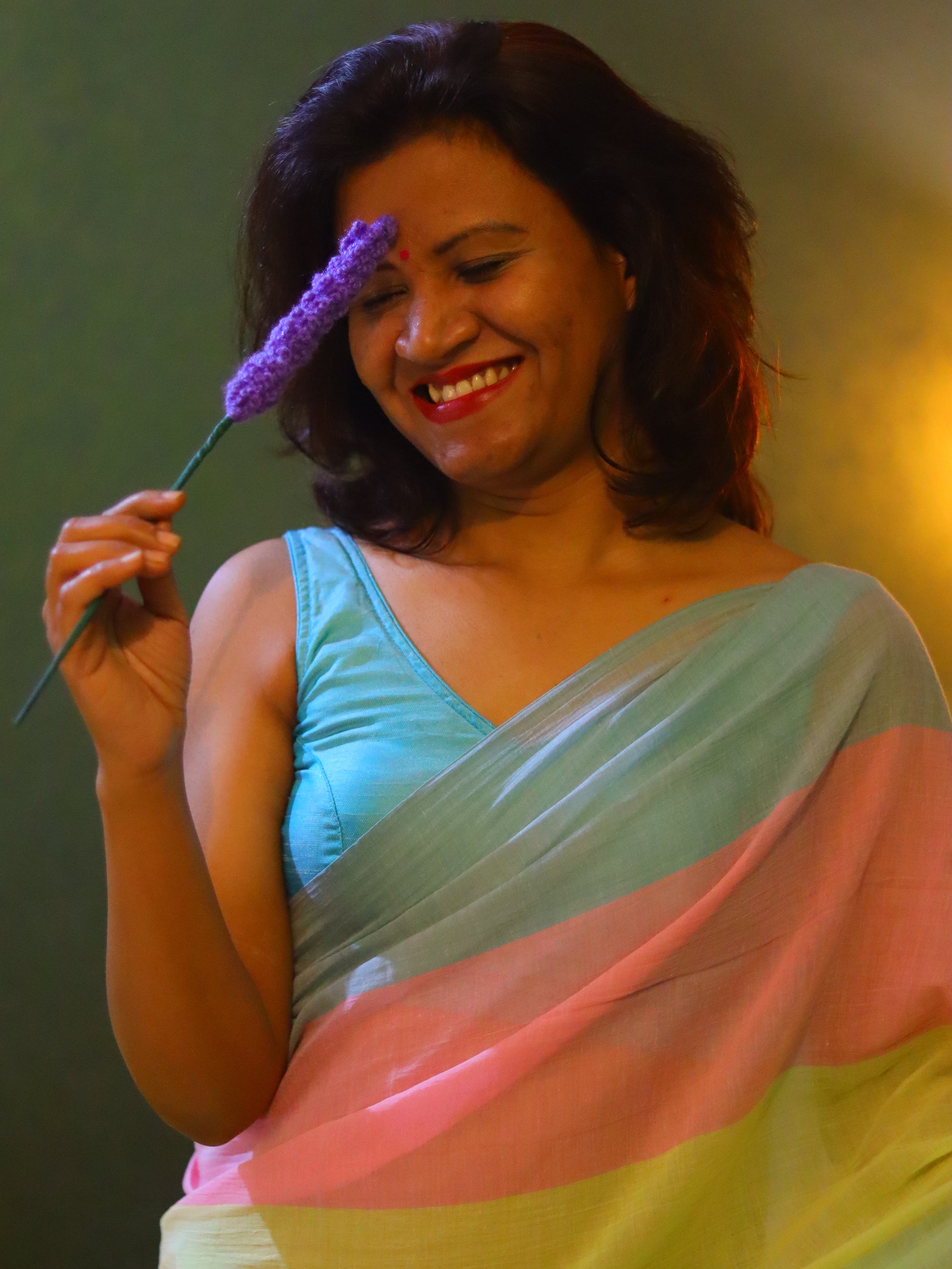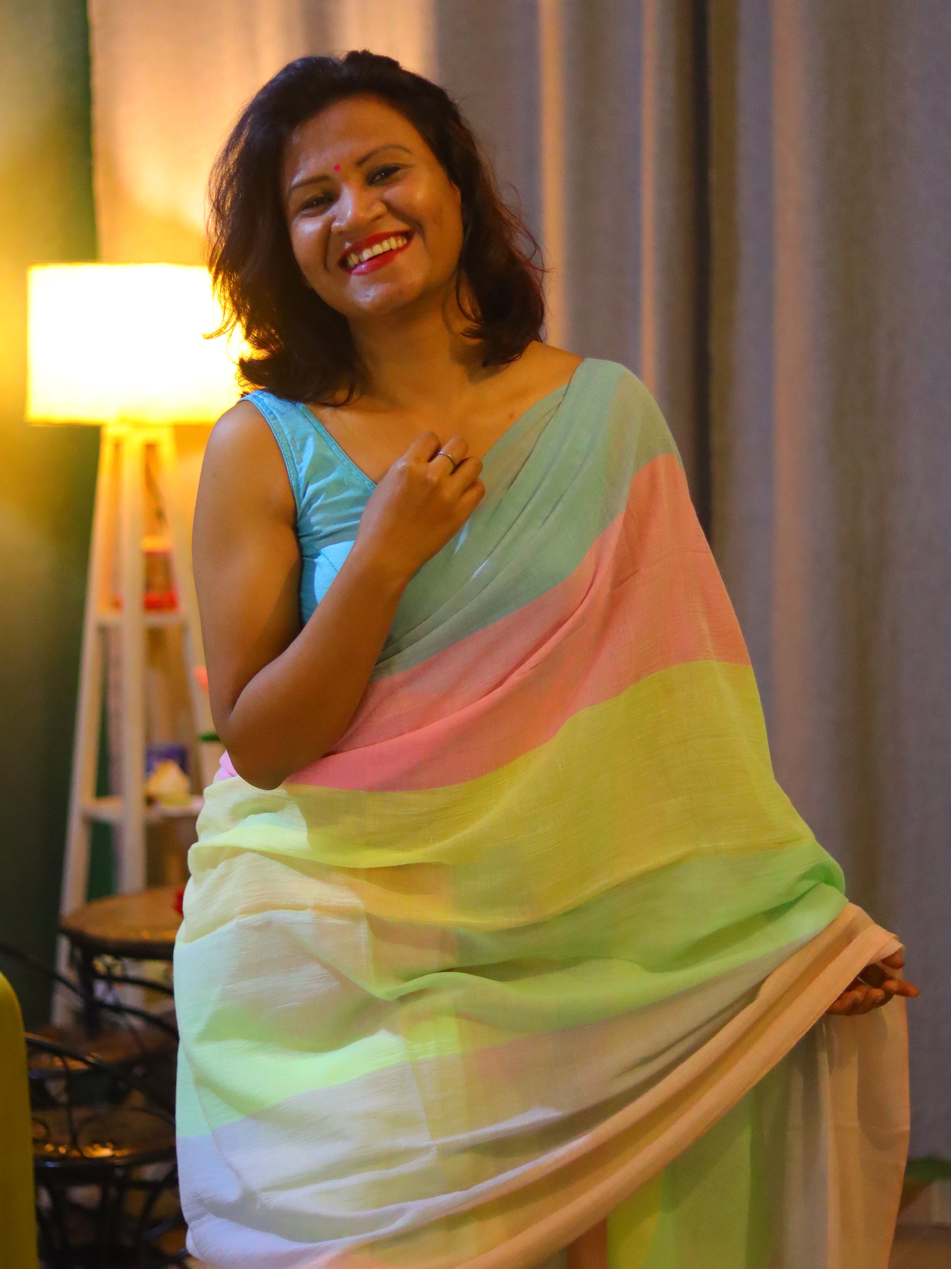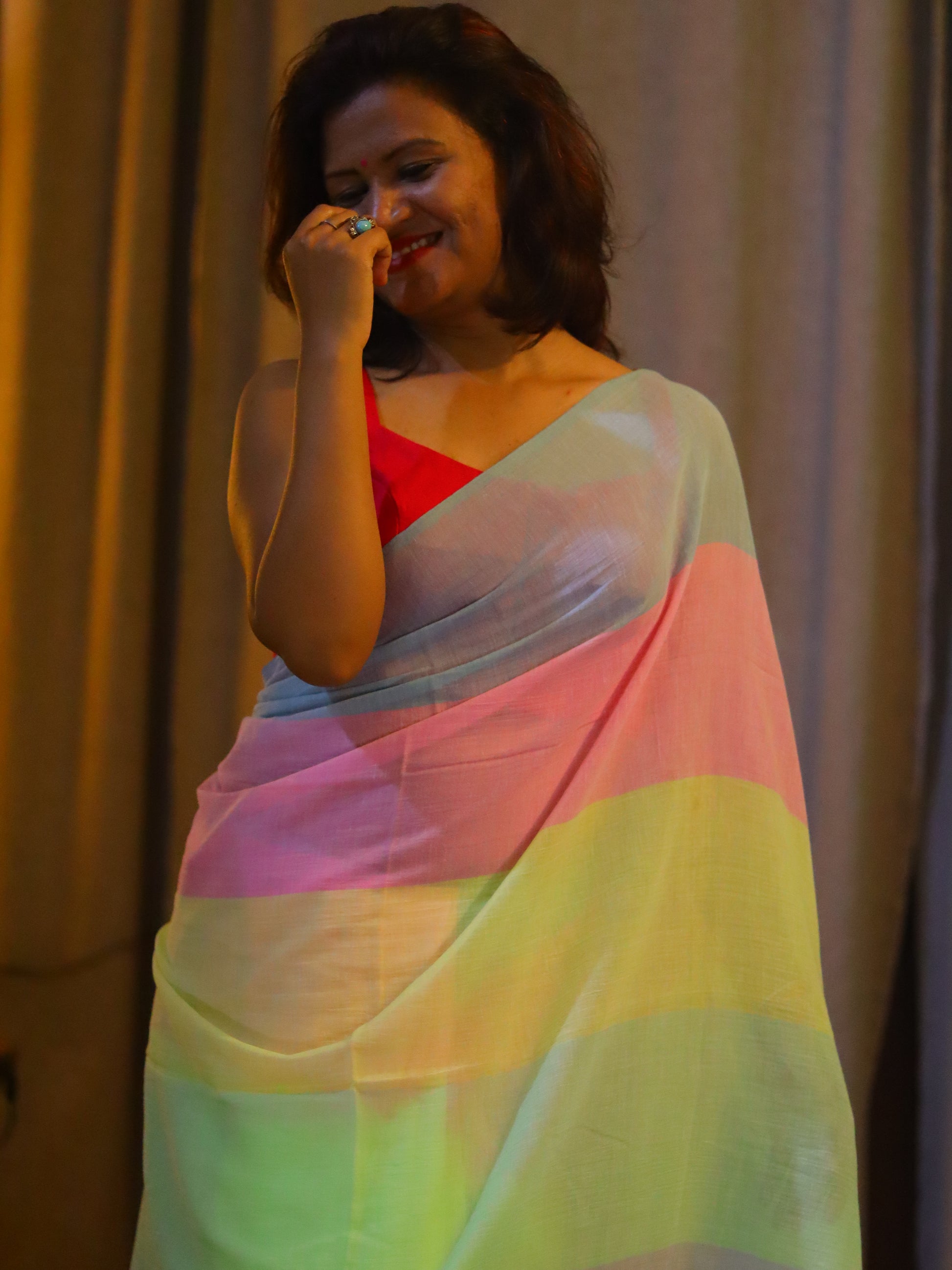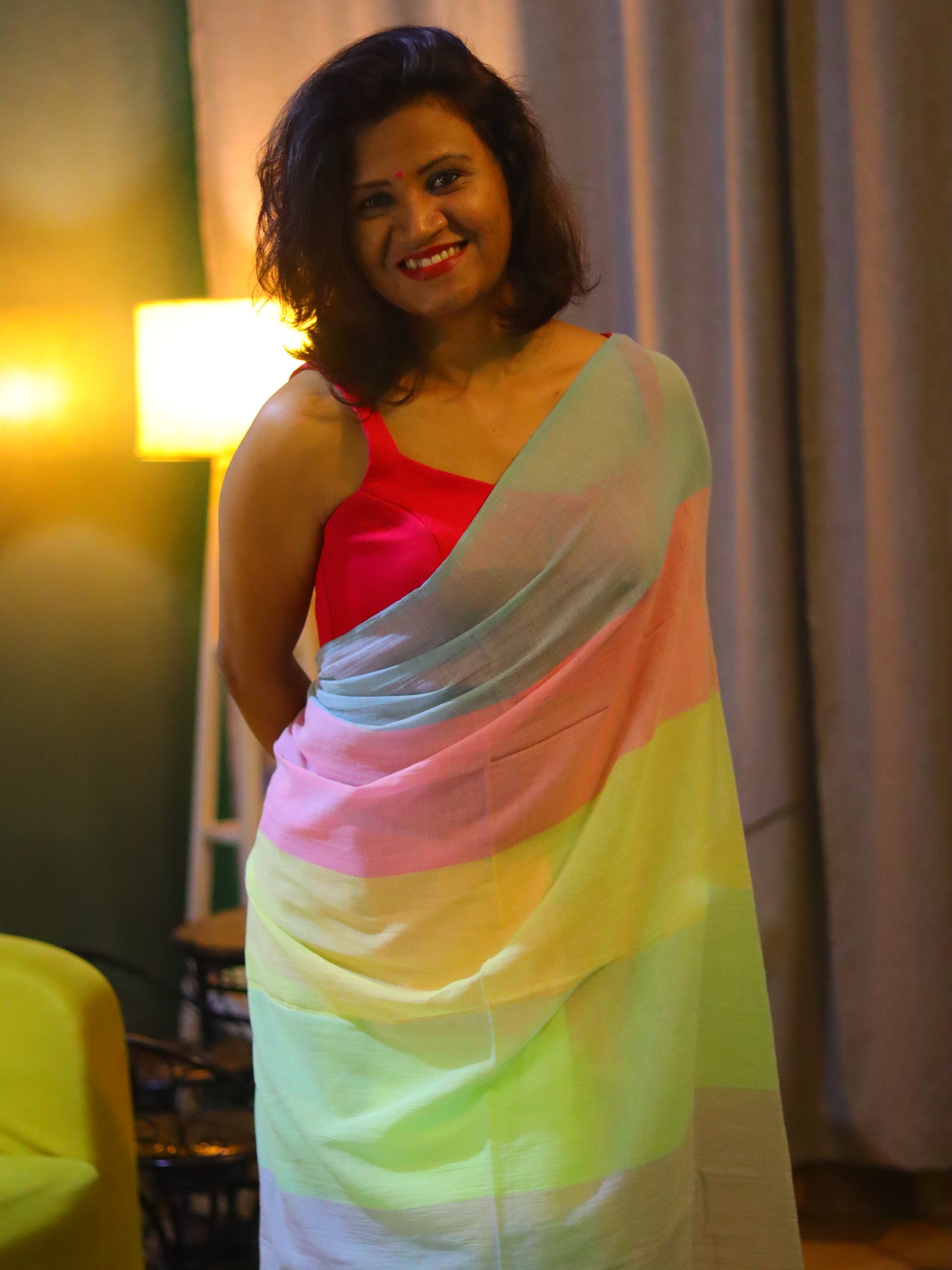 This dazzling saree, inspired by the vibrant hues of a rainbow, is a breathtaking blend of multiple colors seamlessly transitioning across the fabric. Each shade, from radiant red to serene violet, creates a stunning visual harmony, symbolizing joy, diversity, and positivity. The vivid spectrum of colors gives the saree a lively and playful appeal, perfect for festive occasions, celebrations, or special events. With its striking palette, this saree is a statement piece that brings a sense of optimism and creativity, ensuring you shine with confidence and flair wherever you go. It's the perfect embodiment of bold beauty and artistic expression.