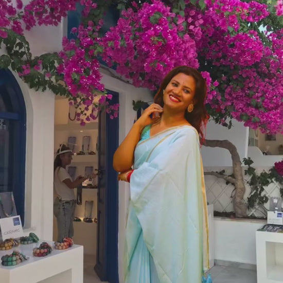 Pastel blue colour Mul cotton saree with chumki stitched all over saree. Gold zari border on both sides of the saree and tassels at anchal end