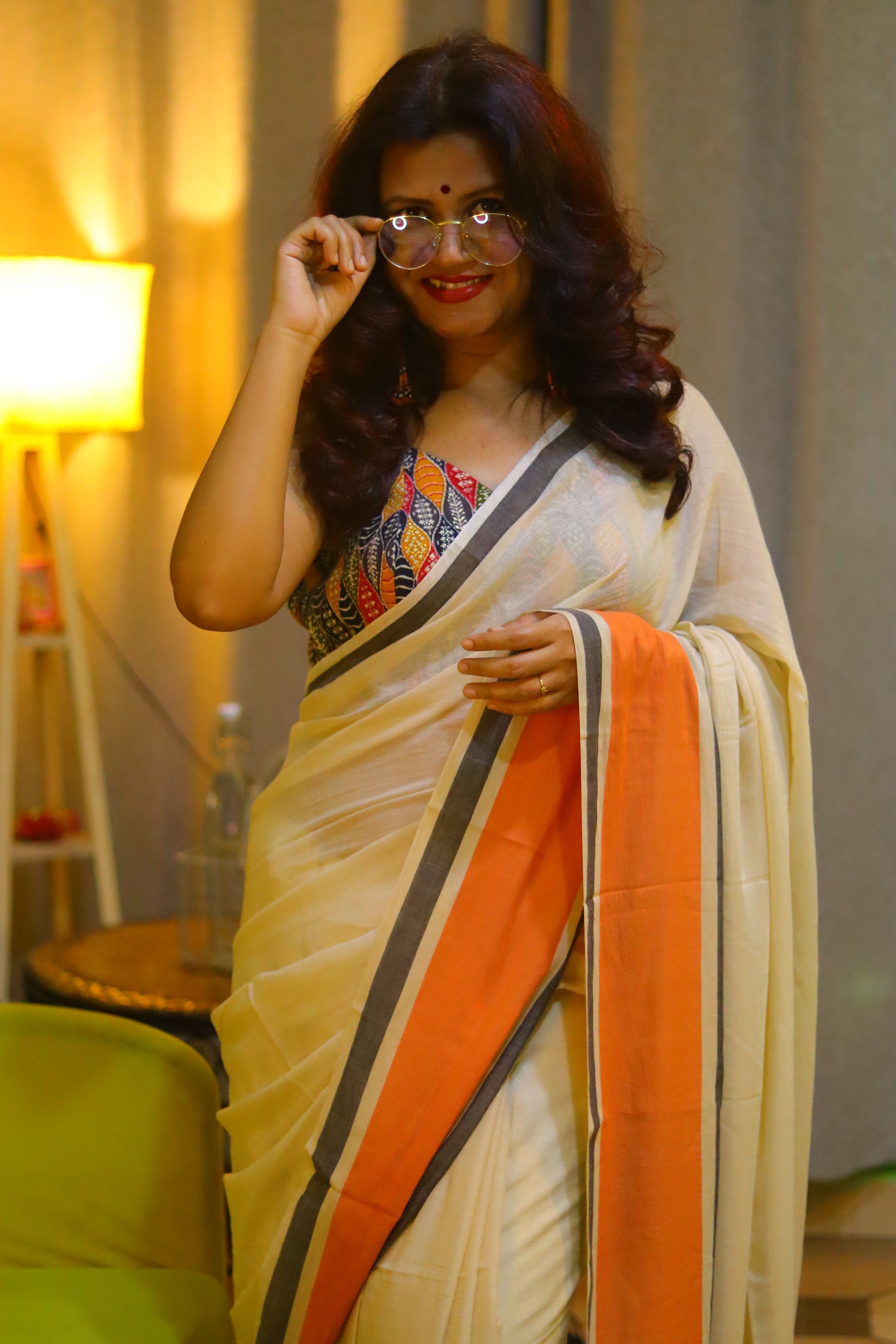 Sunday classic is a beautiful beige Mul cotton saree with lower thick border and upper thin border. It has tassels at anchal