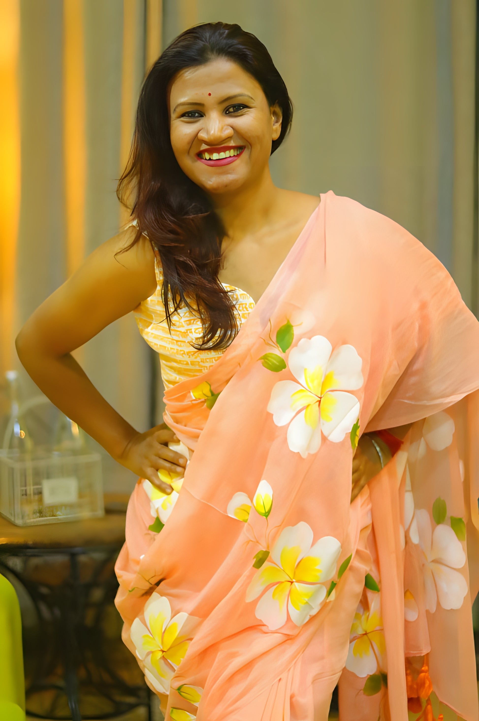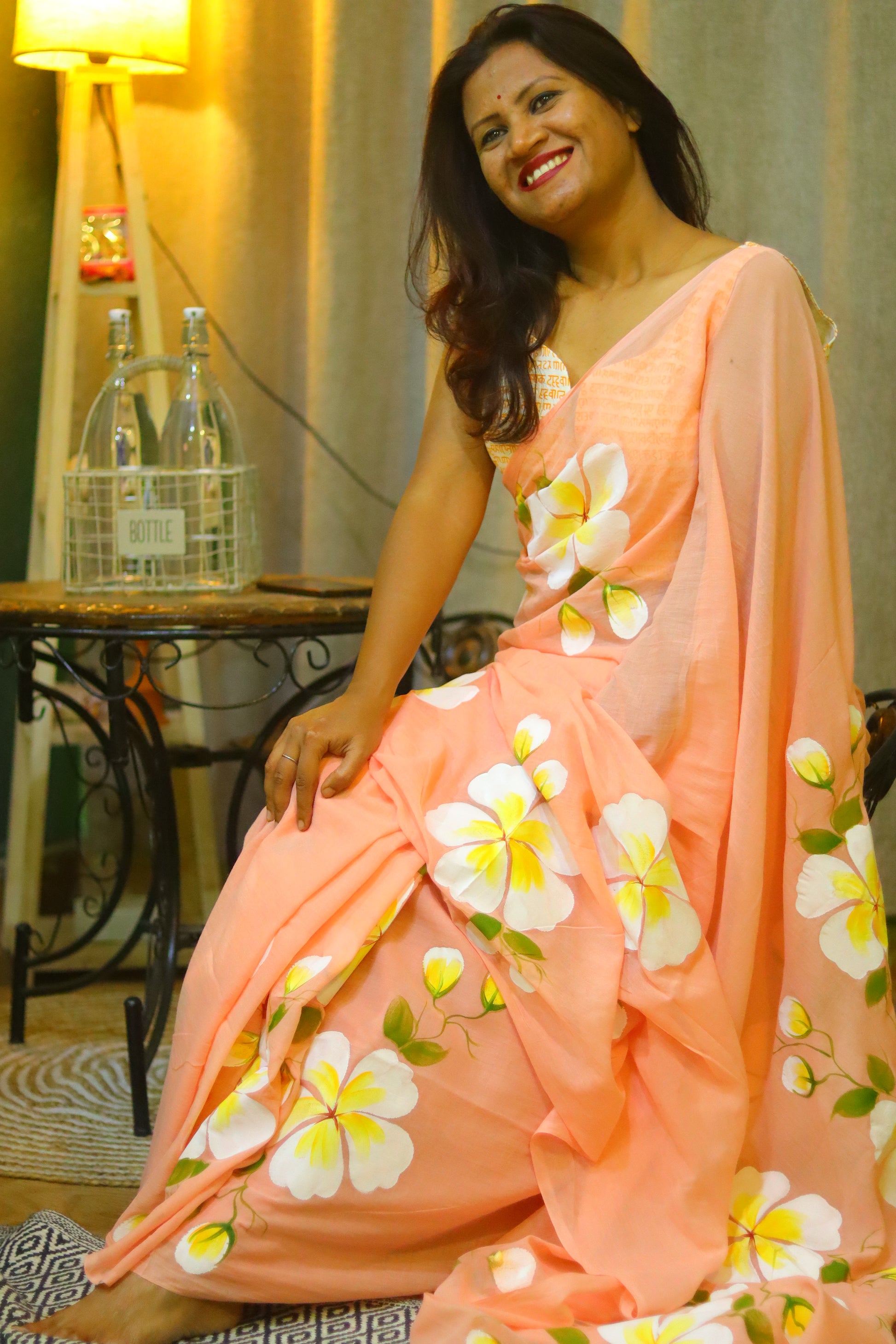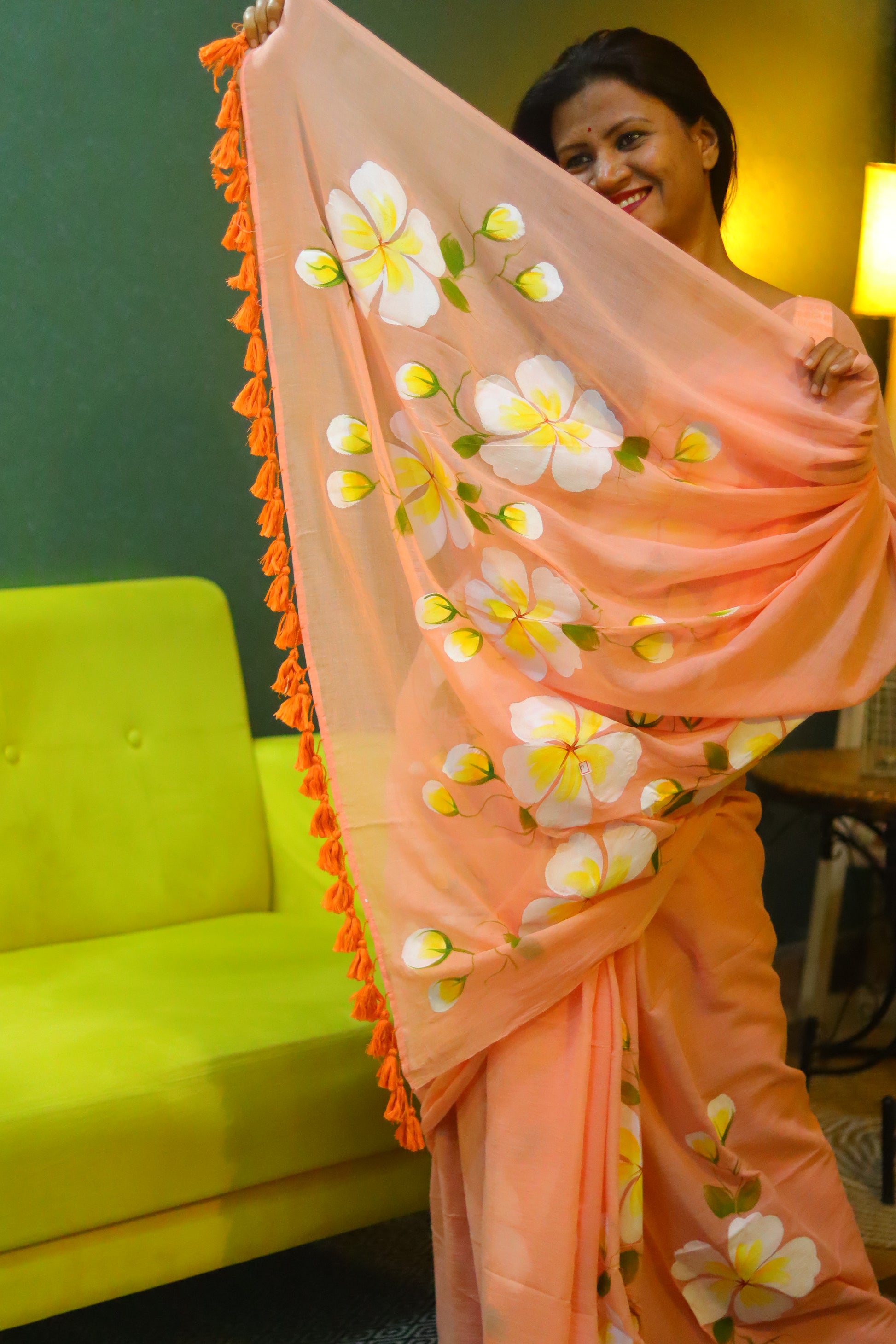 "Sunkissed" - A vibrant tangerine-hued mul cotton saree, infused with the warmth of a sunny day. Delicate white gulachi hand-painted flowers dance across the fabric, evoking the gentle caress of sunbeams. Wear "Sunkissed" and radiate joy, energy, and the carefree spirit of a sun-kissed afternoon.