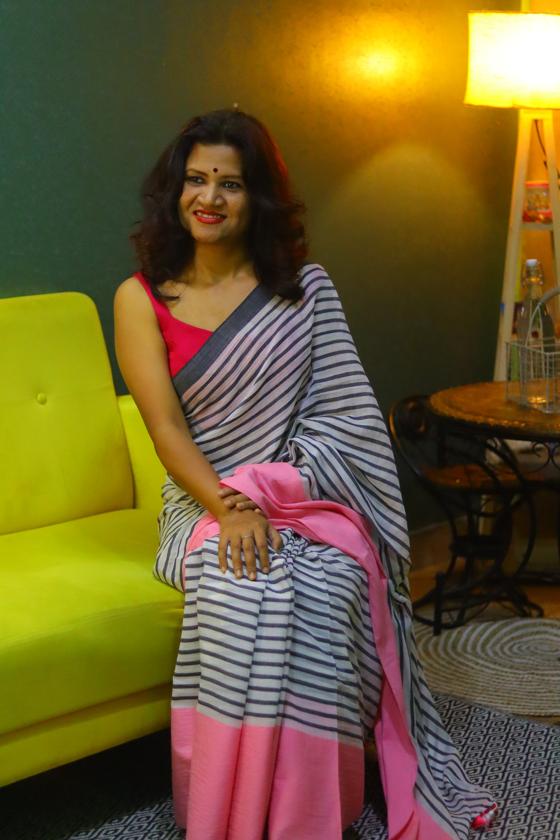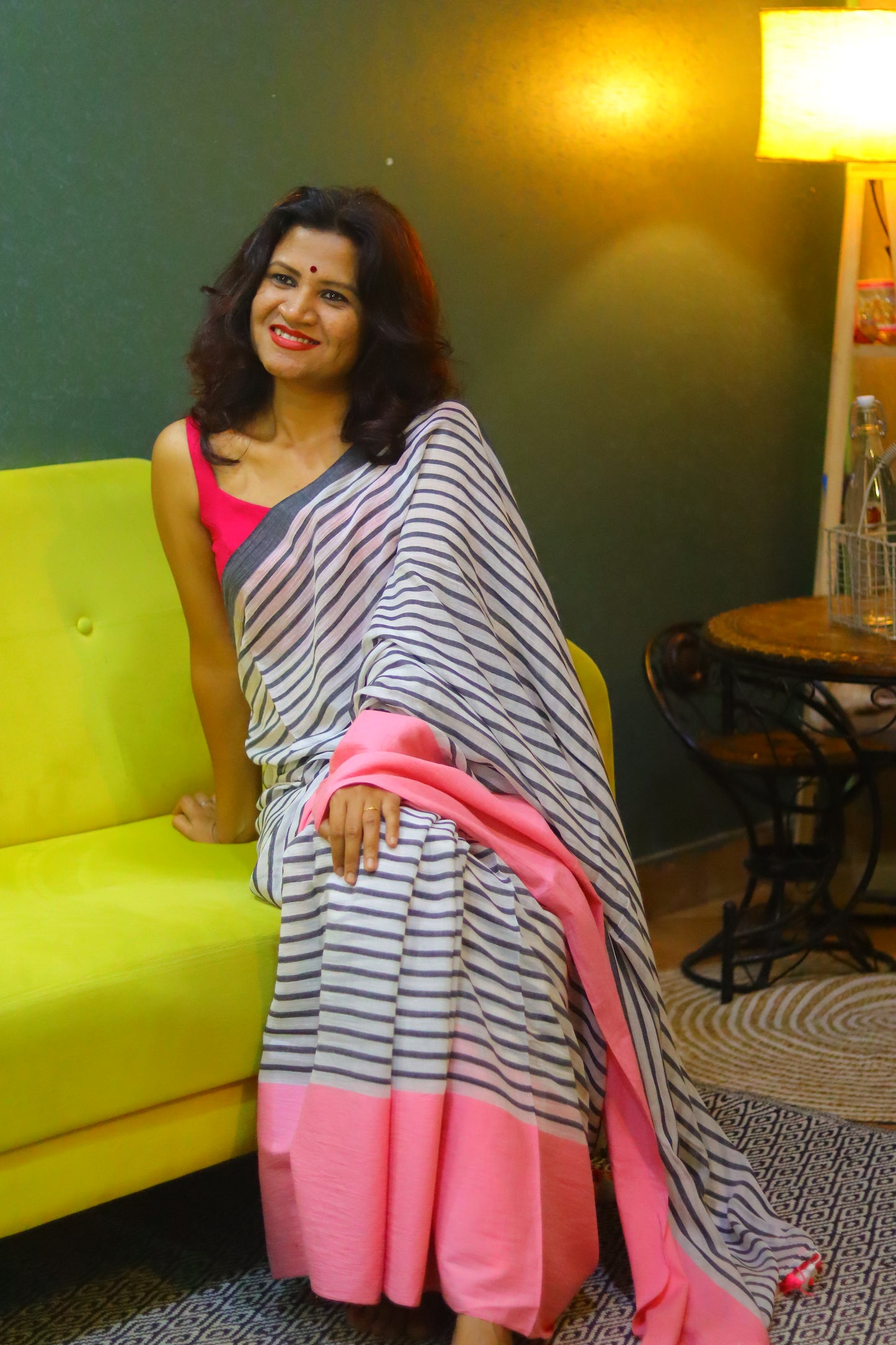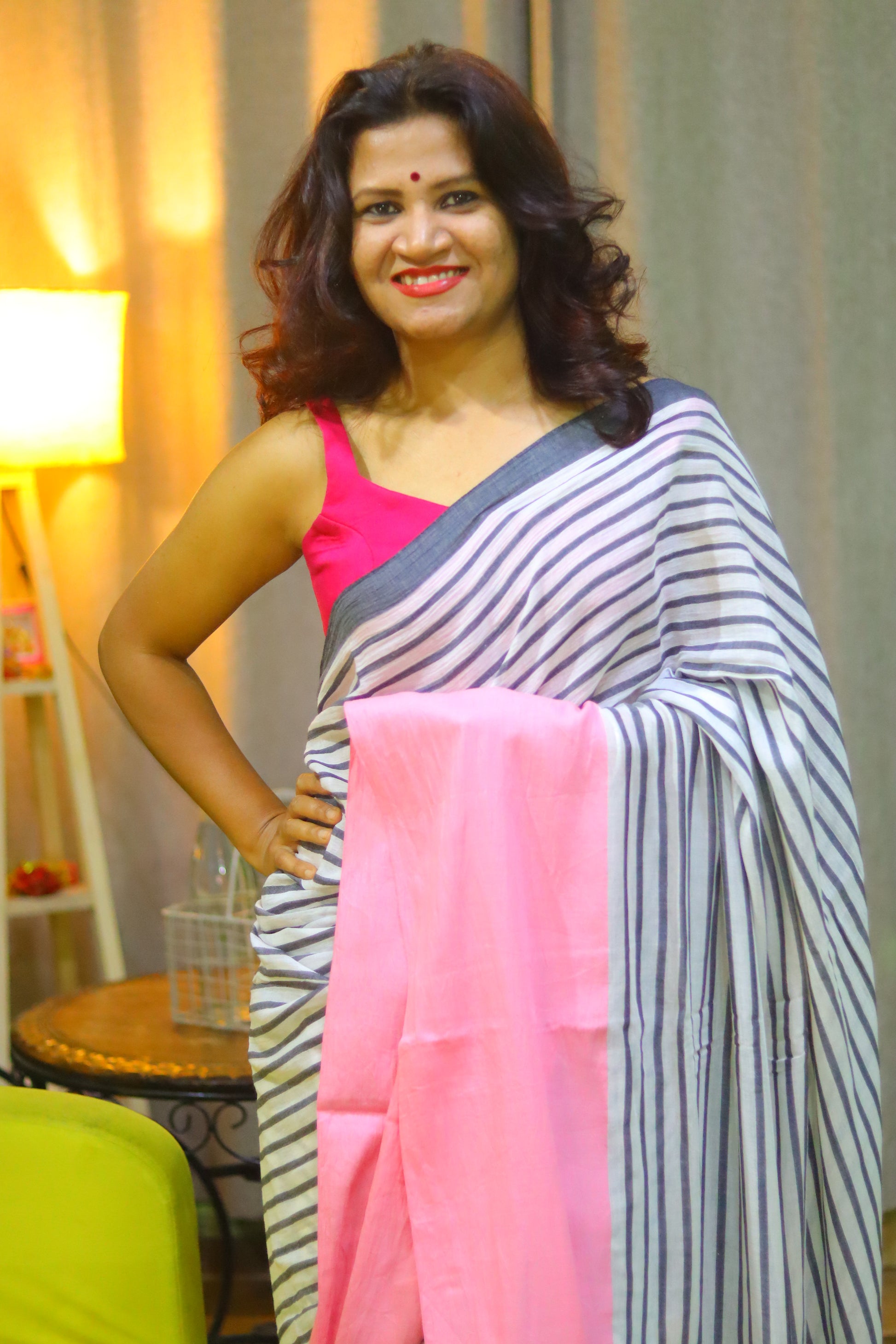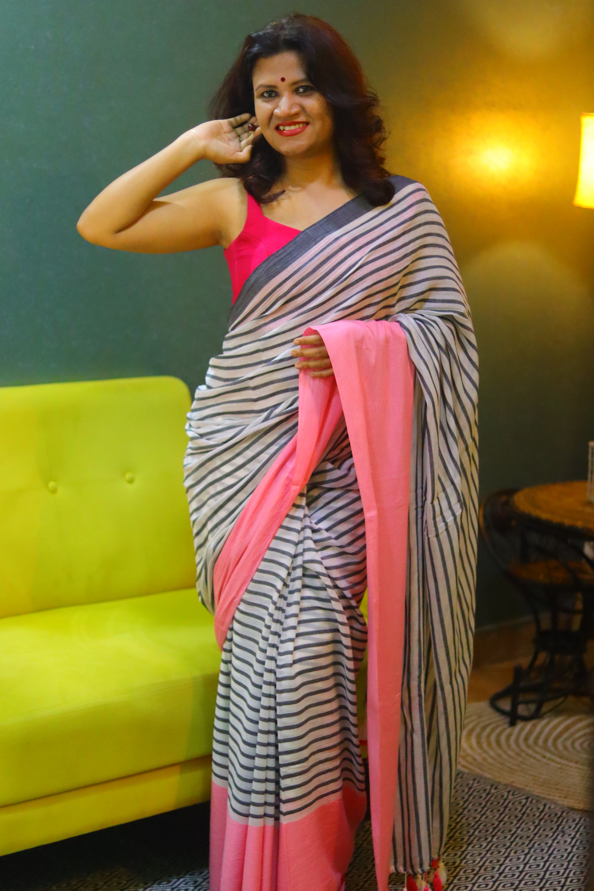 Amigo - is a saree from our our 'unparallel' collection. The saree is beautiful black and off white horizontal lines all over saree with pink lower border. The anchal of saree is adorned with beautiful tassels