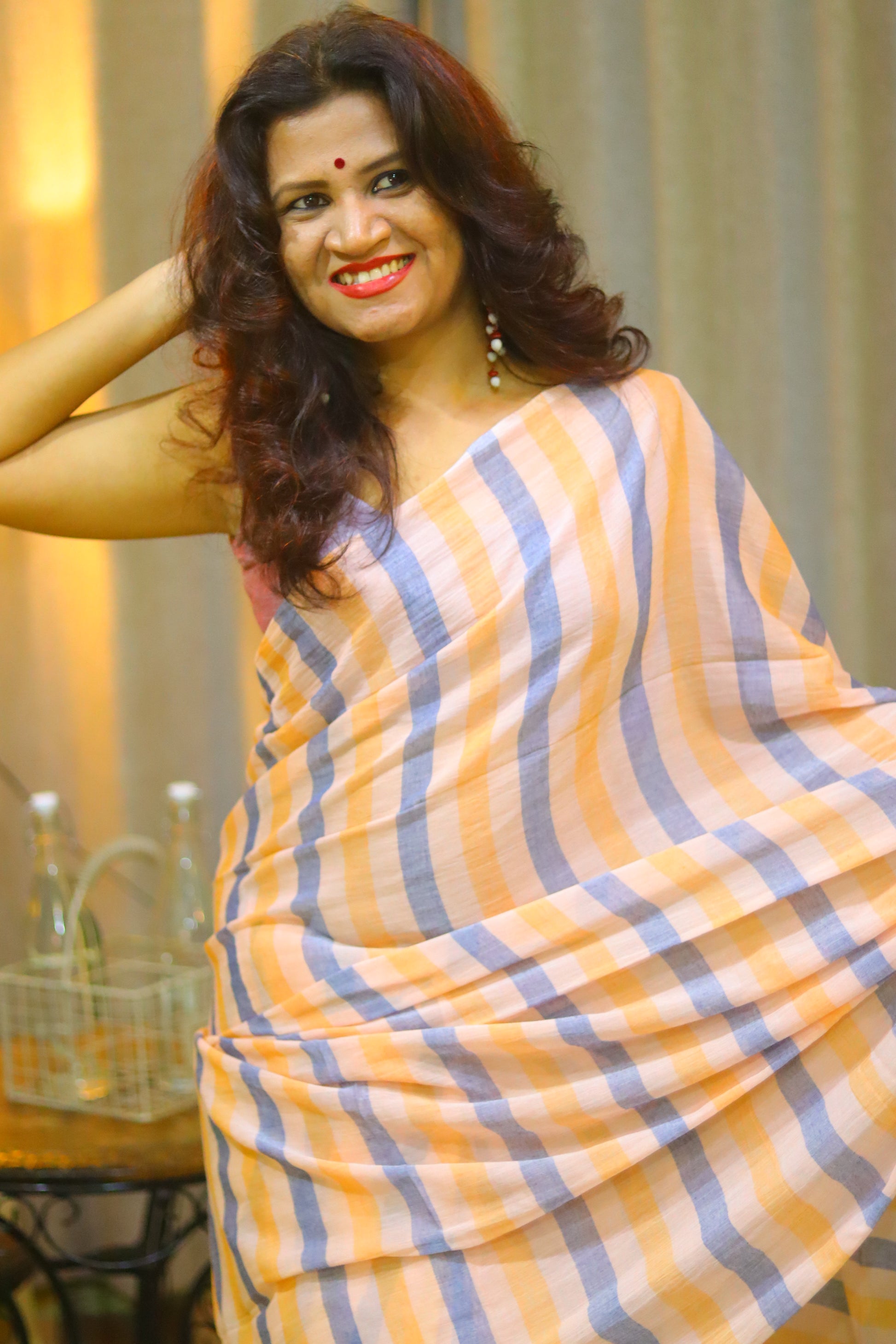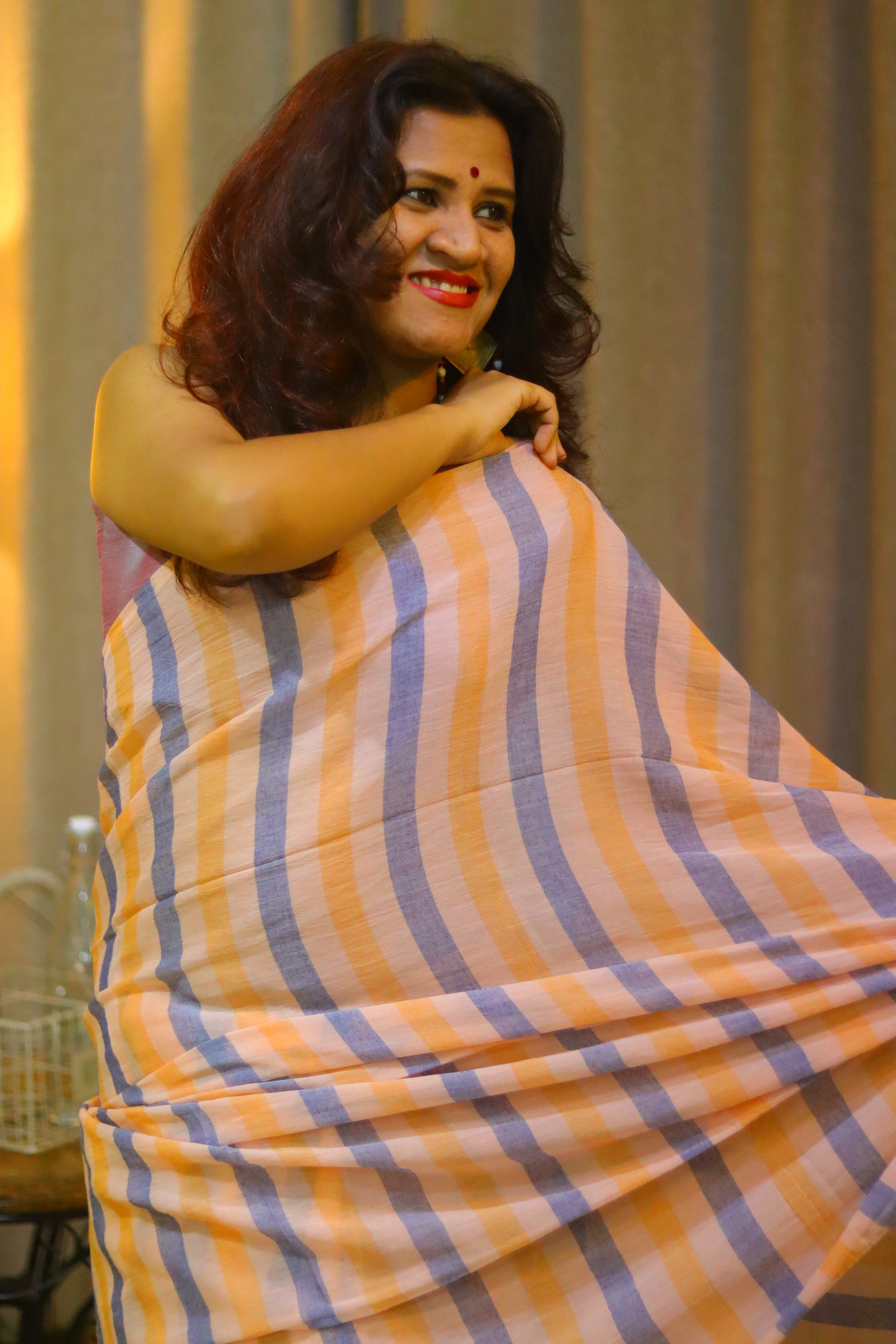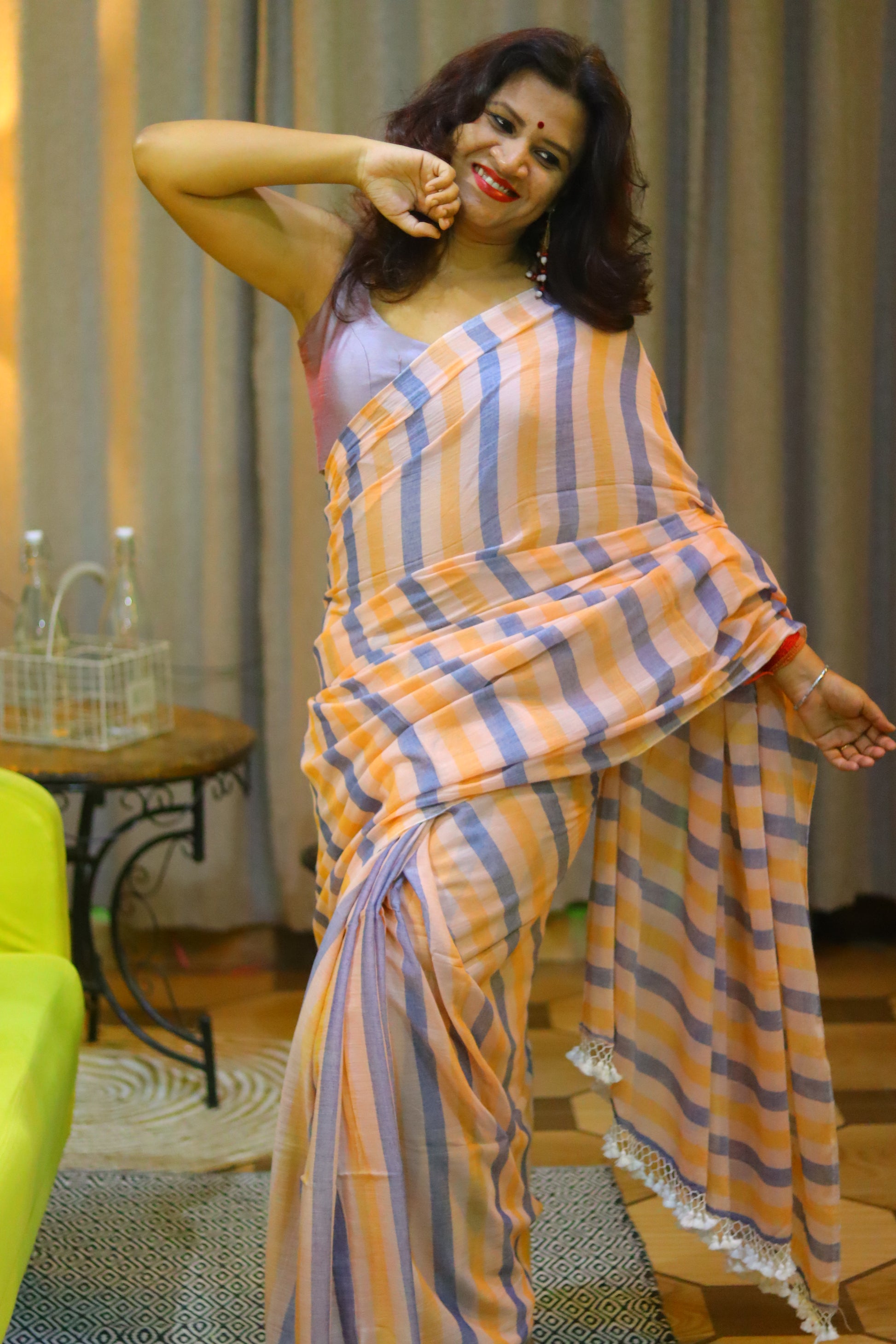 Eros is a saree in unparallel collection. Its a mul cotton saree with parallel pattern all around saree in a shade of blue and shade of orange with beige as its base colour . It's a handwoven saree