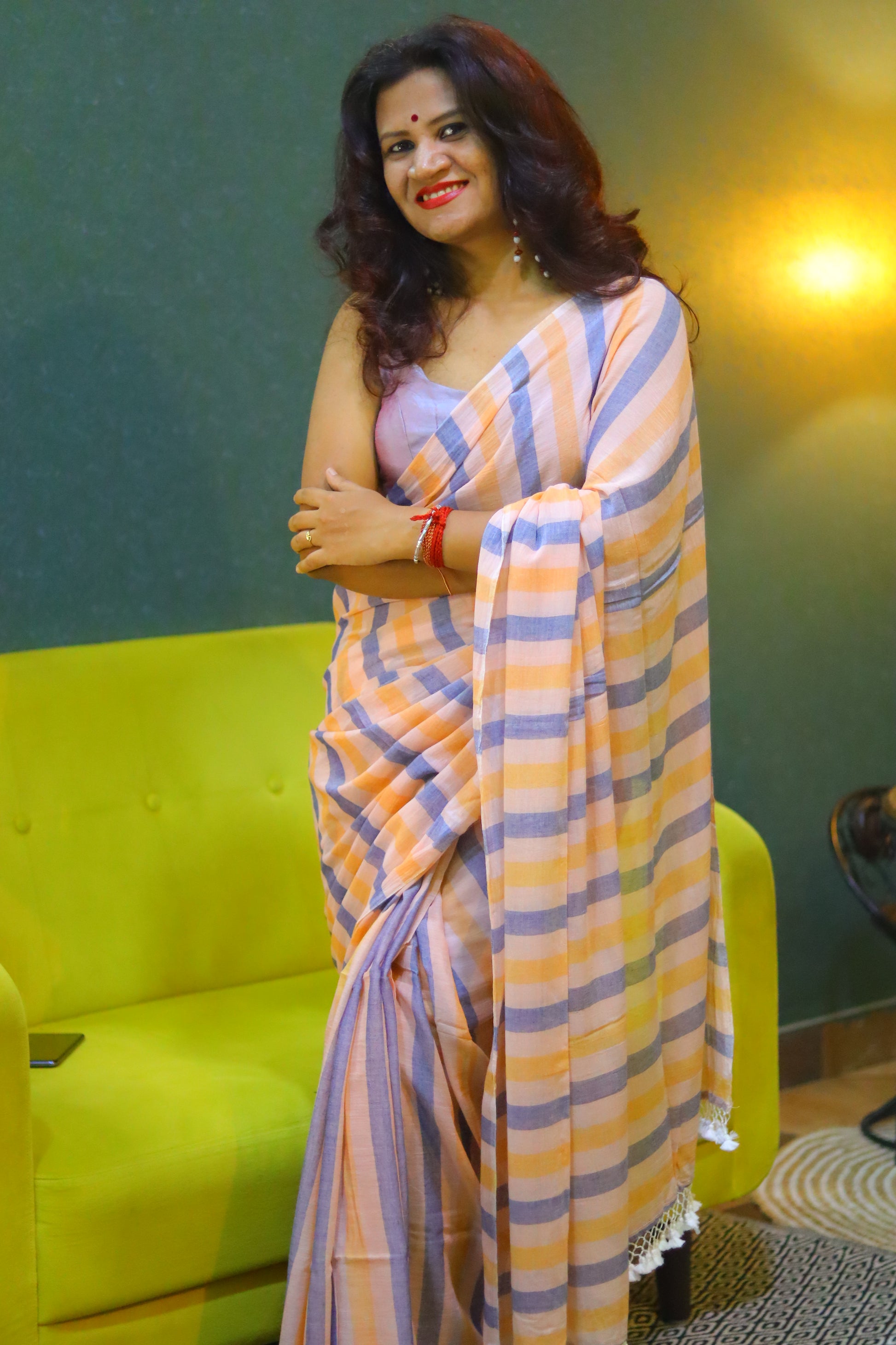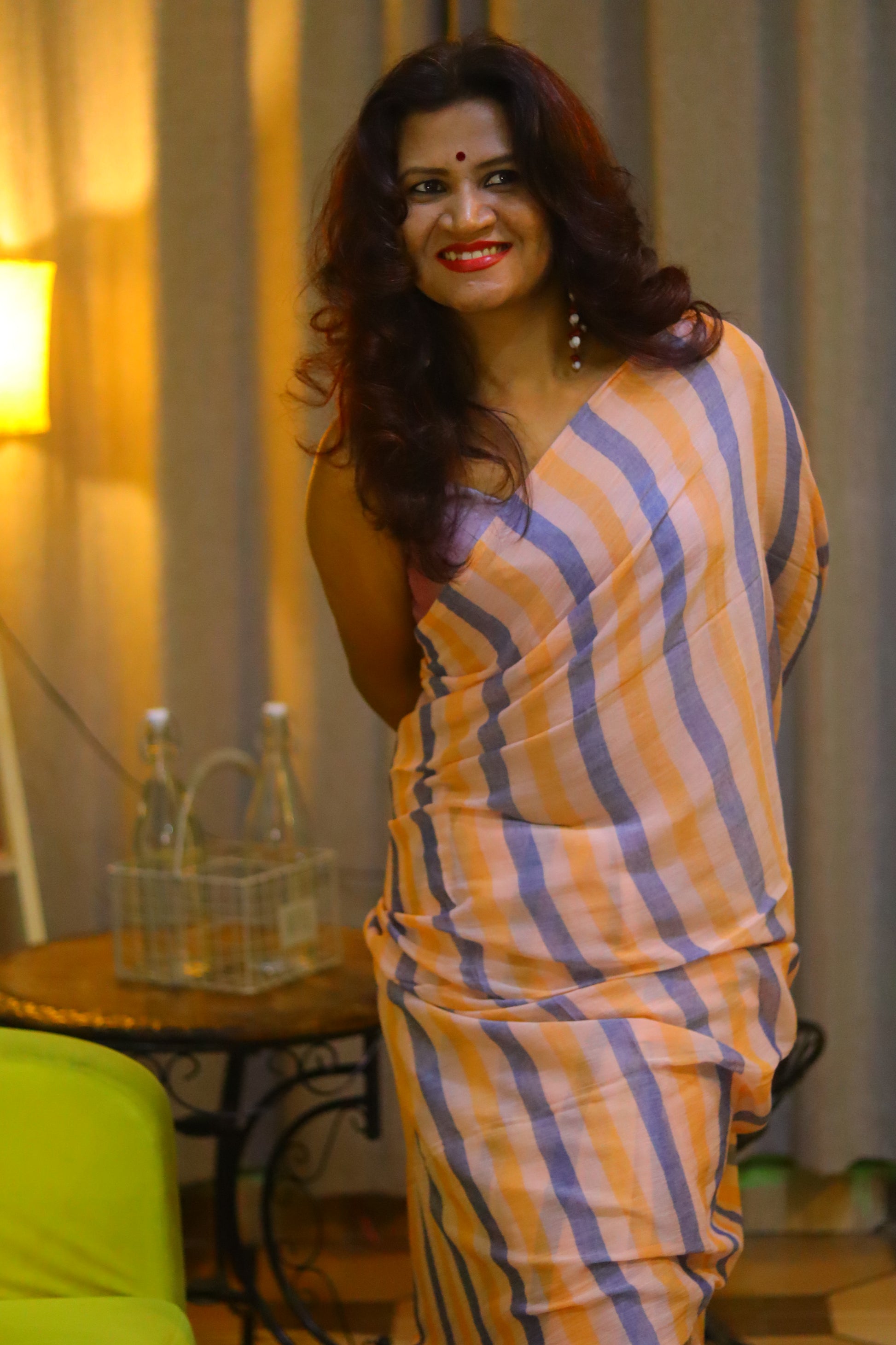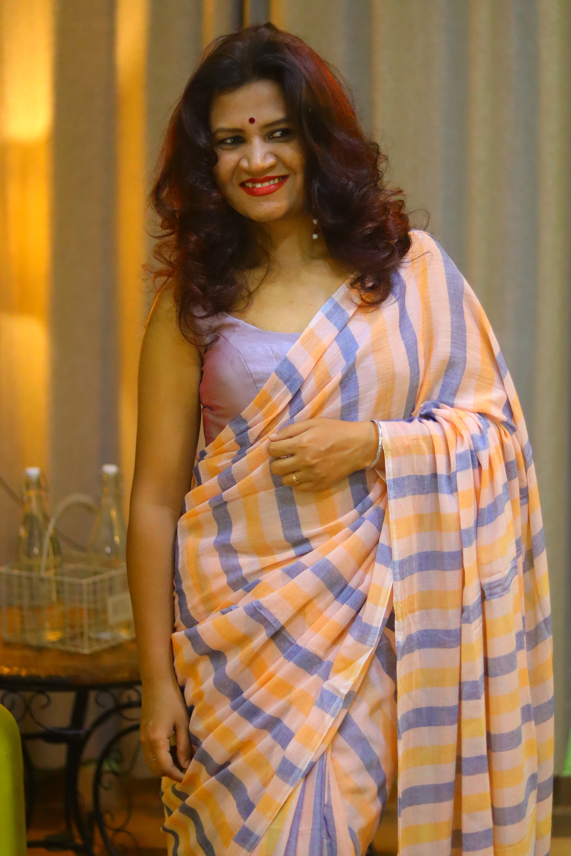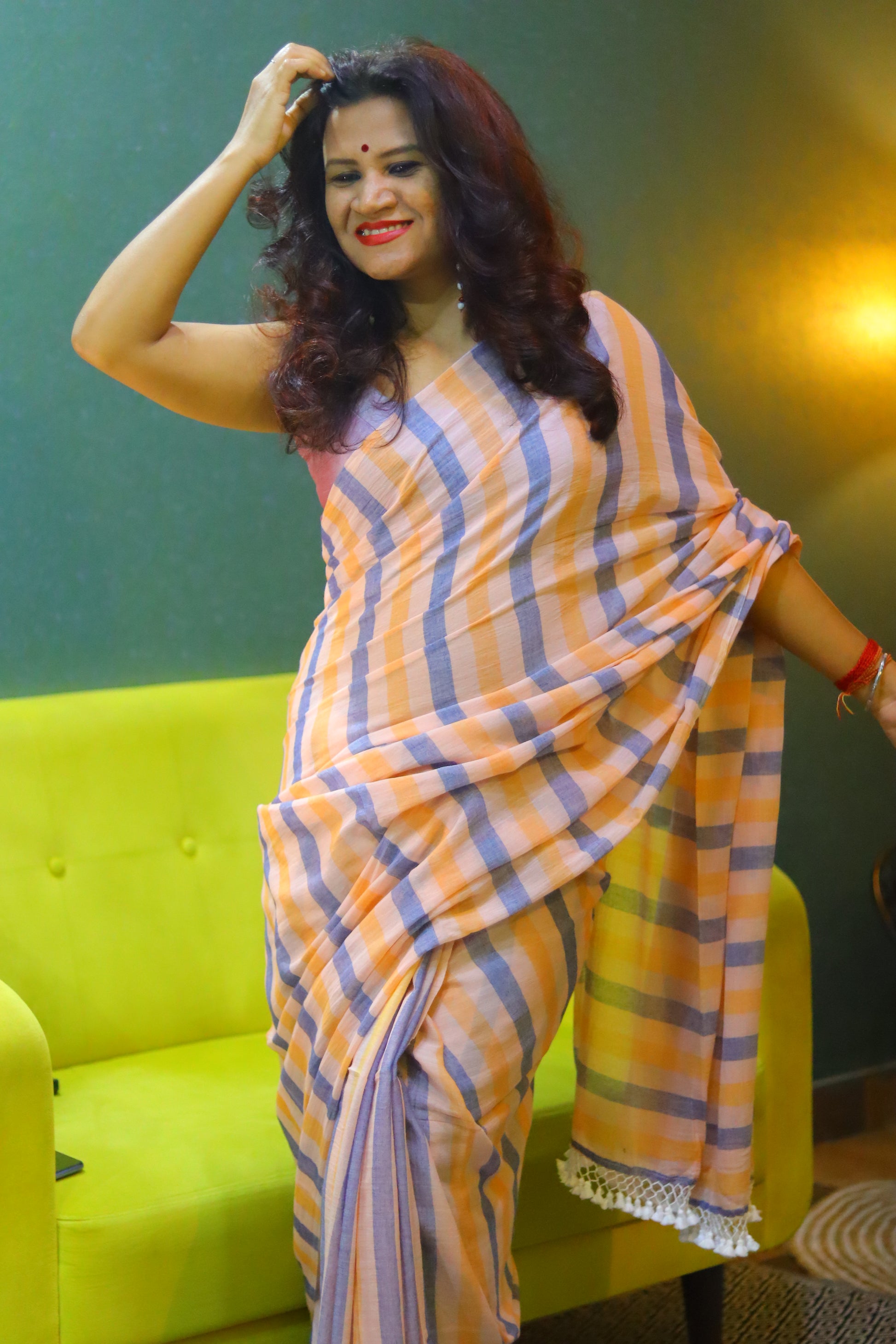 Eros is a saree in unparallel collection. Its a mul cotton saree with parallel pattern all around saree in a shade of blue and shade of orange with beige as its base colour . It's a handwoven saree