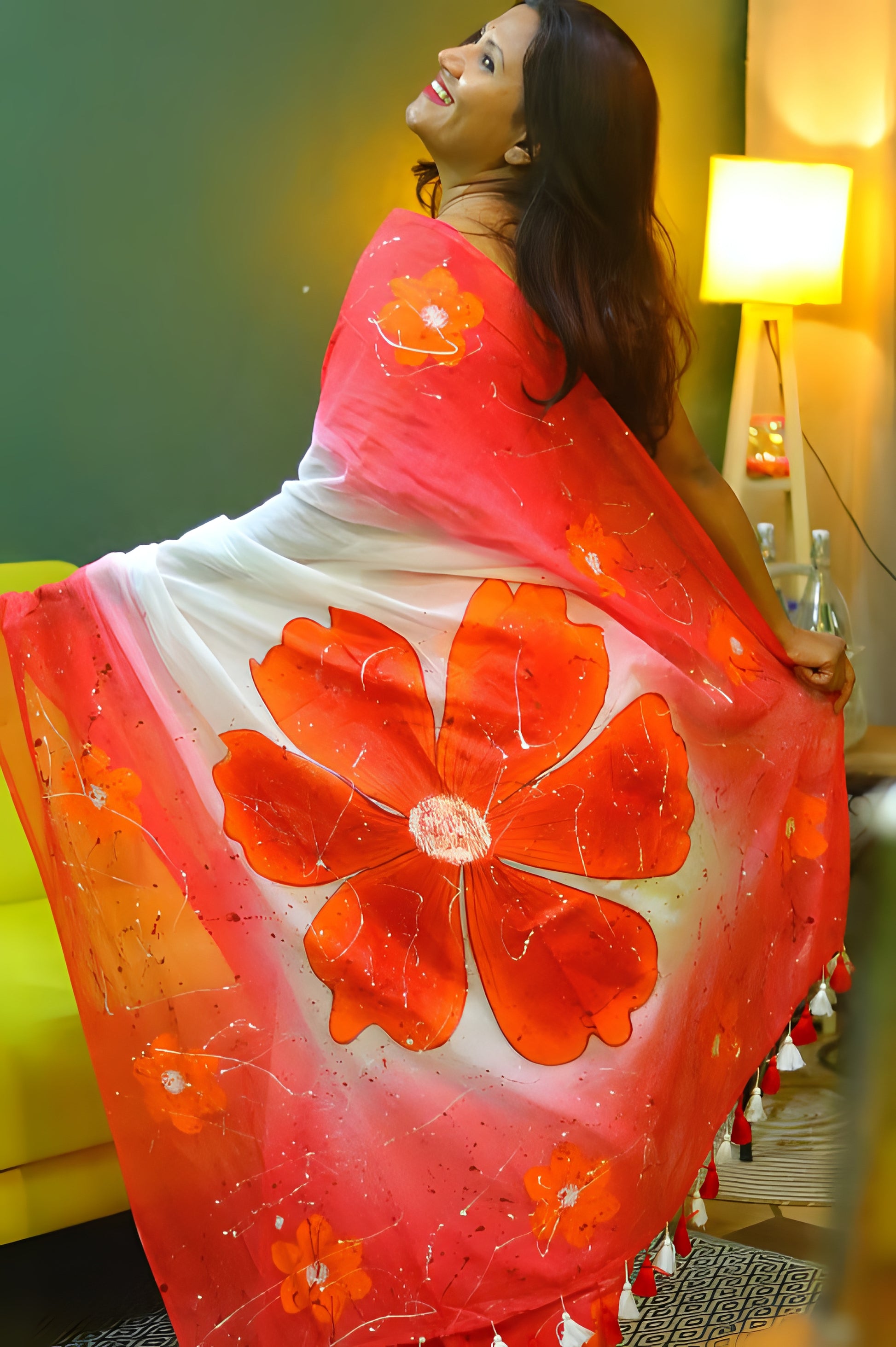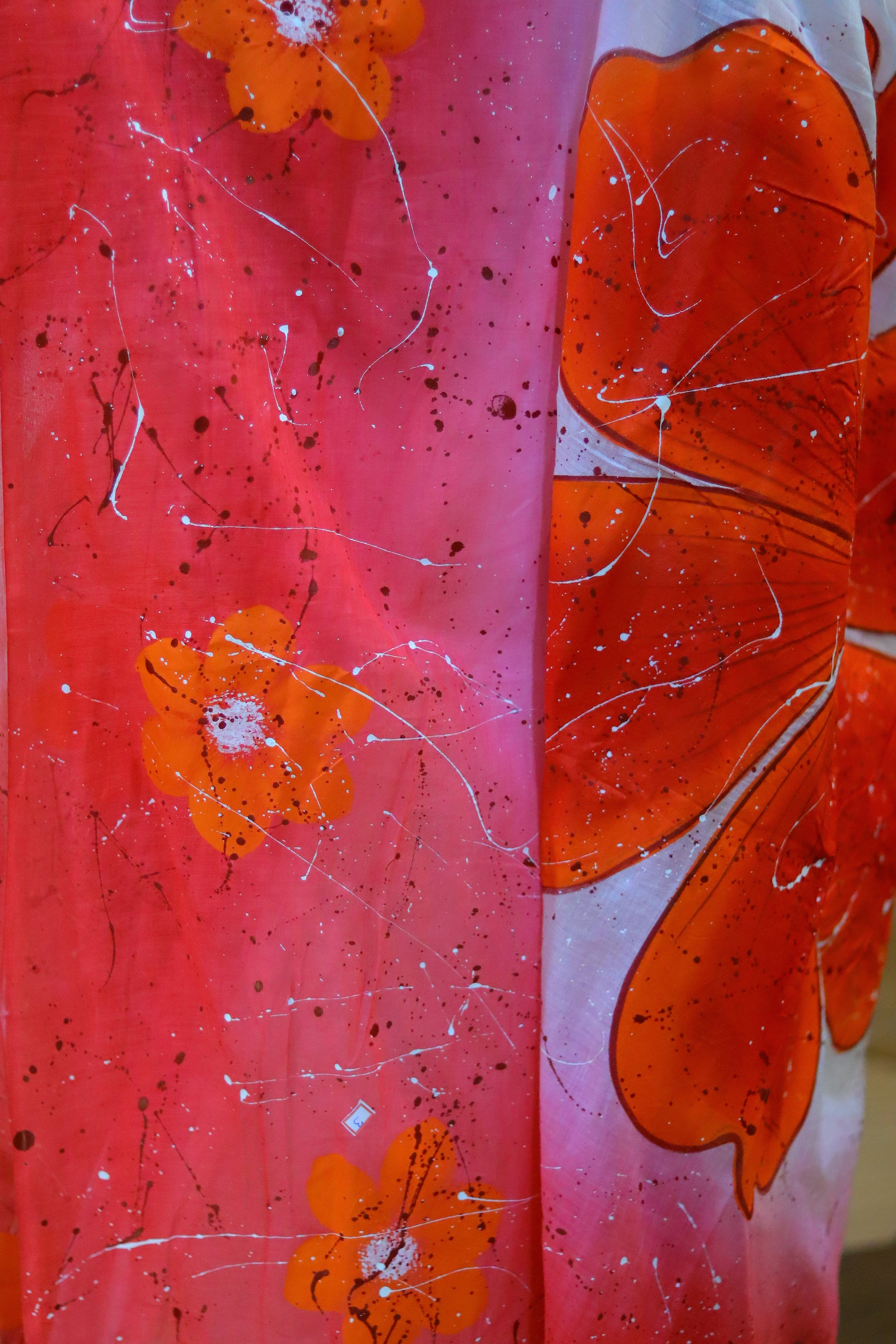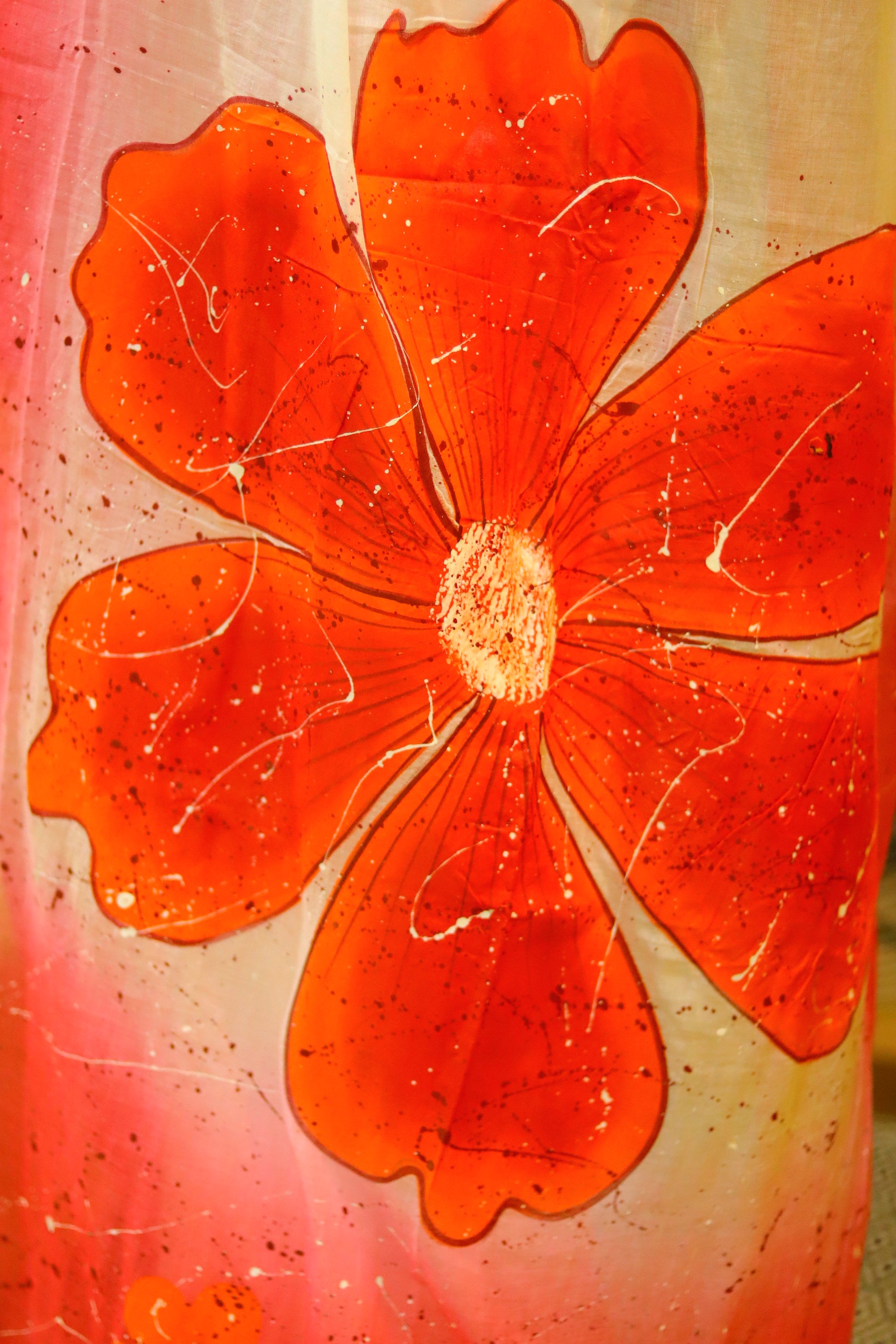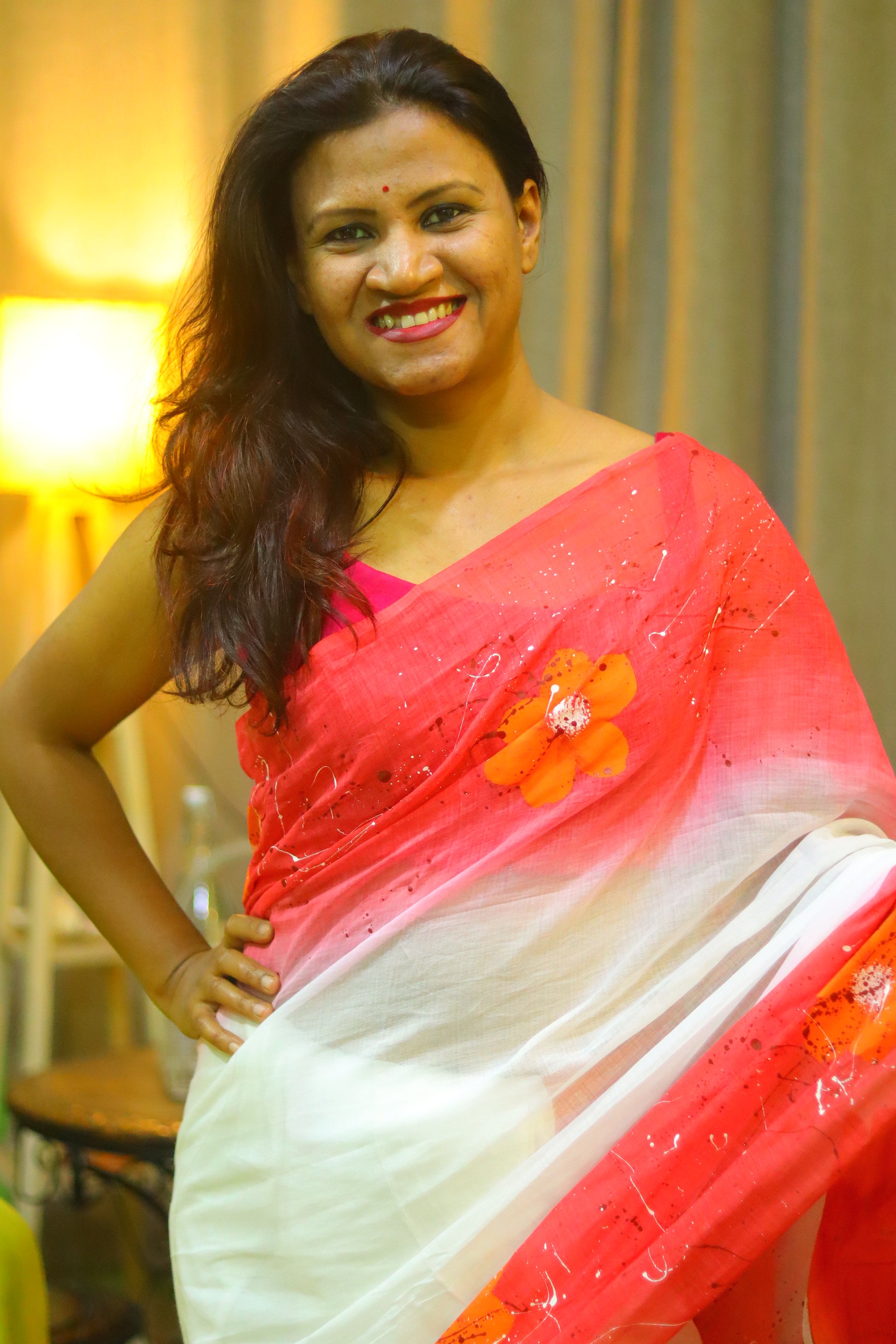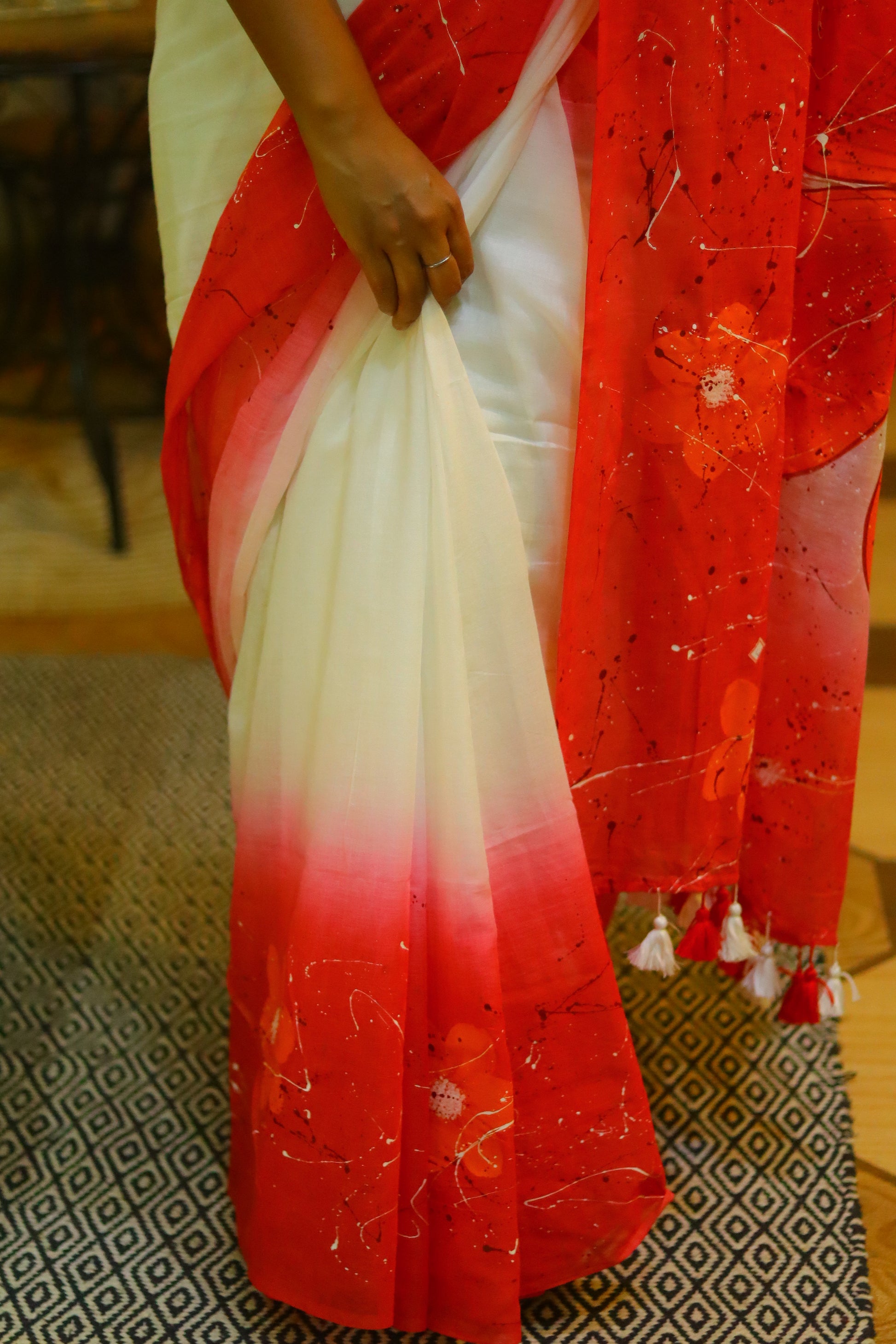 "Rangrez" - a masterpiece of hand-painted artistry on soft mul cotton saree. Vibrant tie-dye hues meet delicate brushstrokes, as a majestic flower blooms on the anchal. Wear "Rangrez" and embody the beauty of artistic expression.