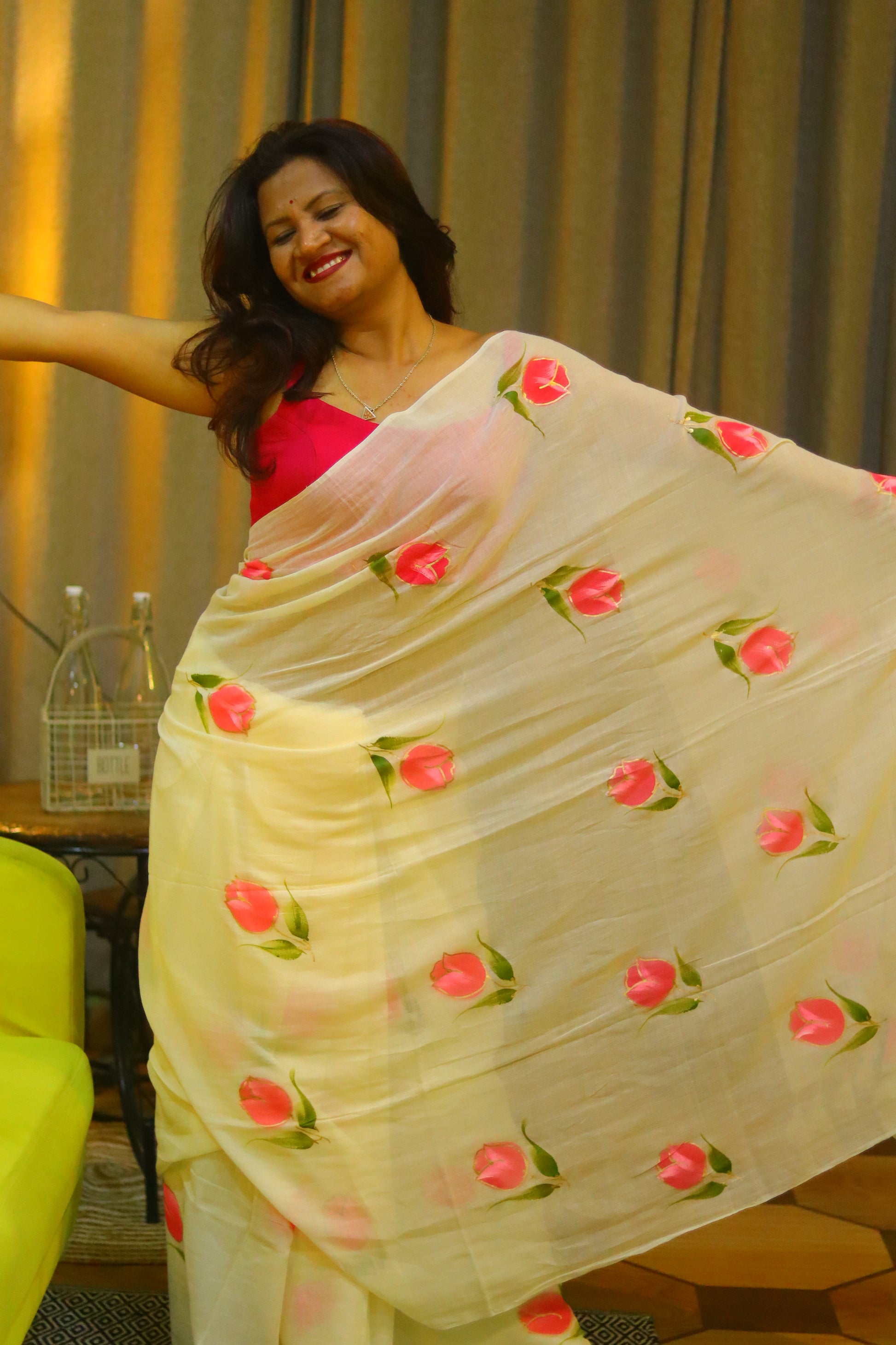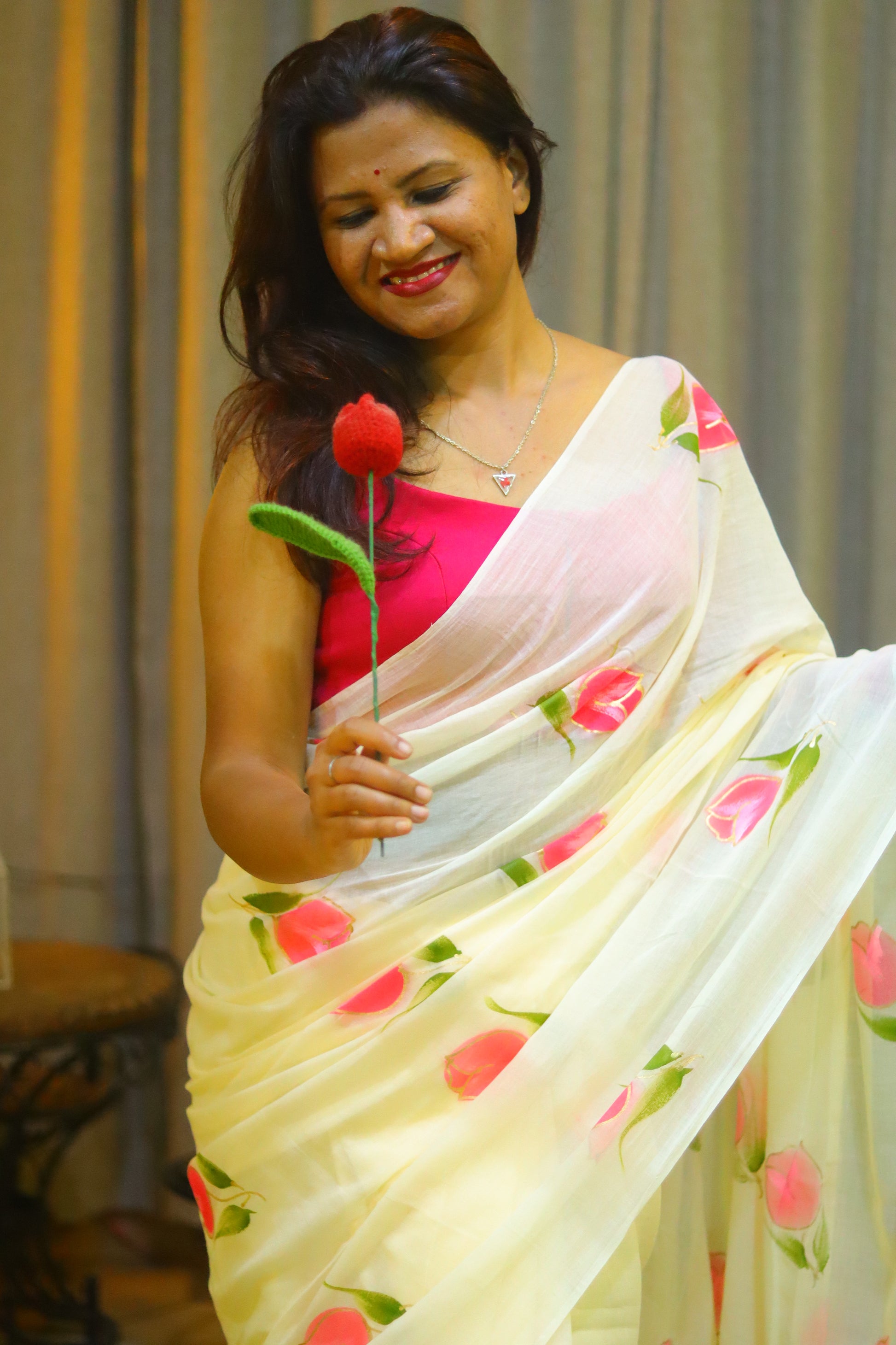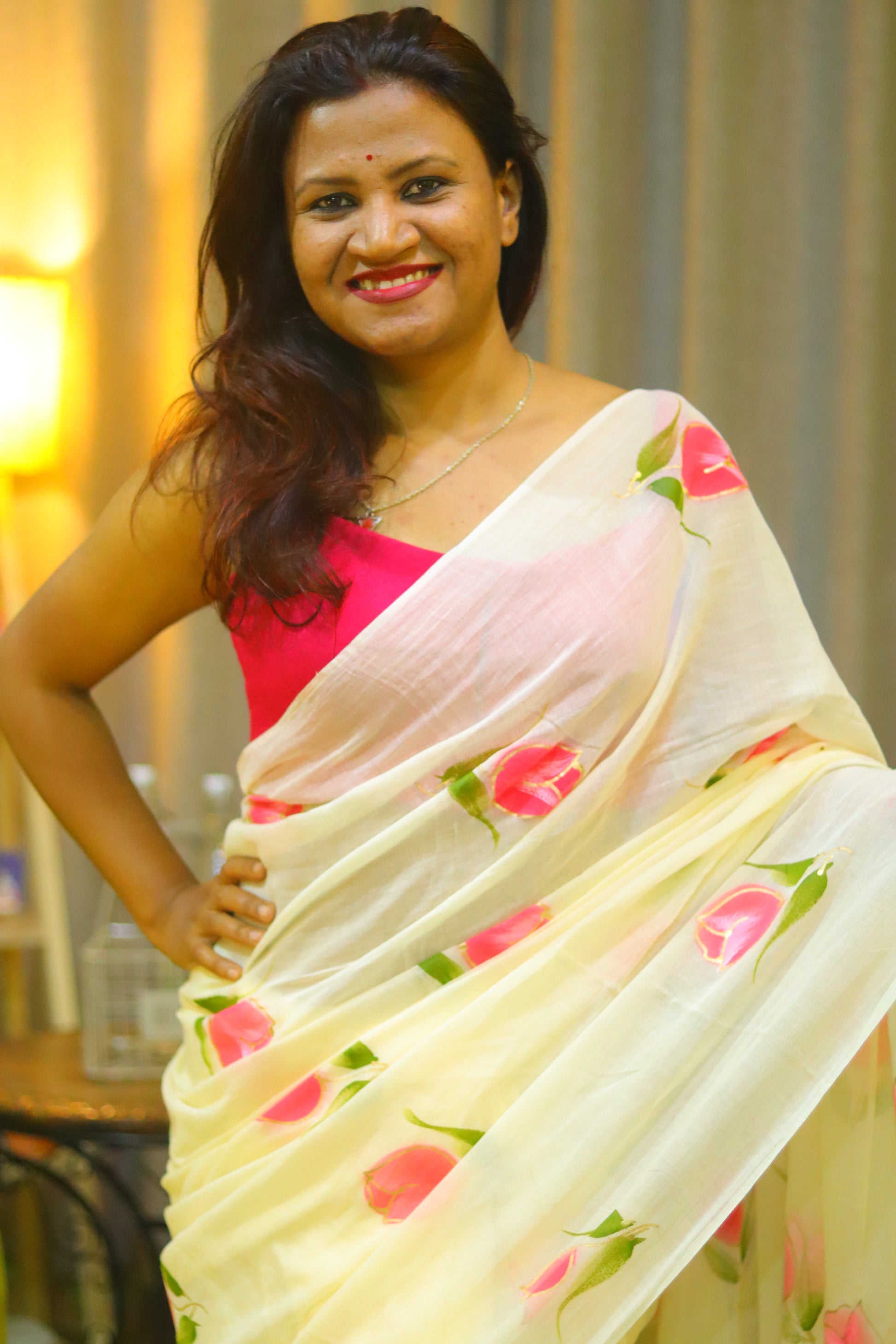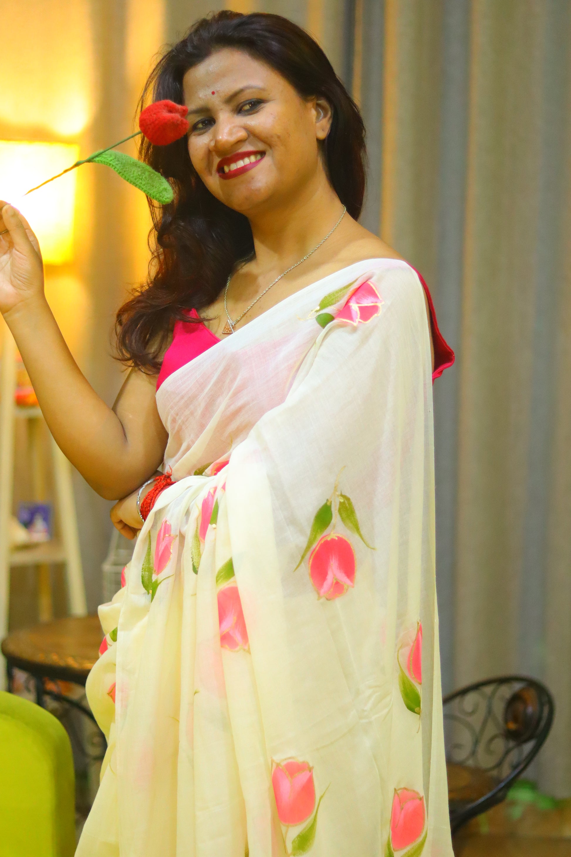 "Tulip Whisper" - An off-white mul cotton saree, softly whispered with delicate hand-painted pink tulips, evoking the gentle beauty of a spring morning.