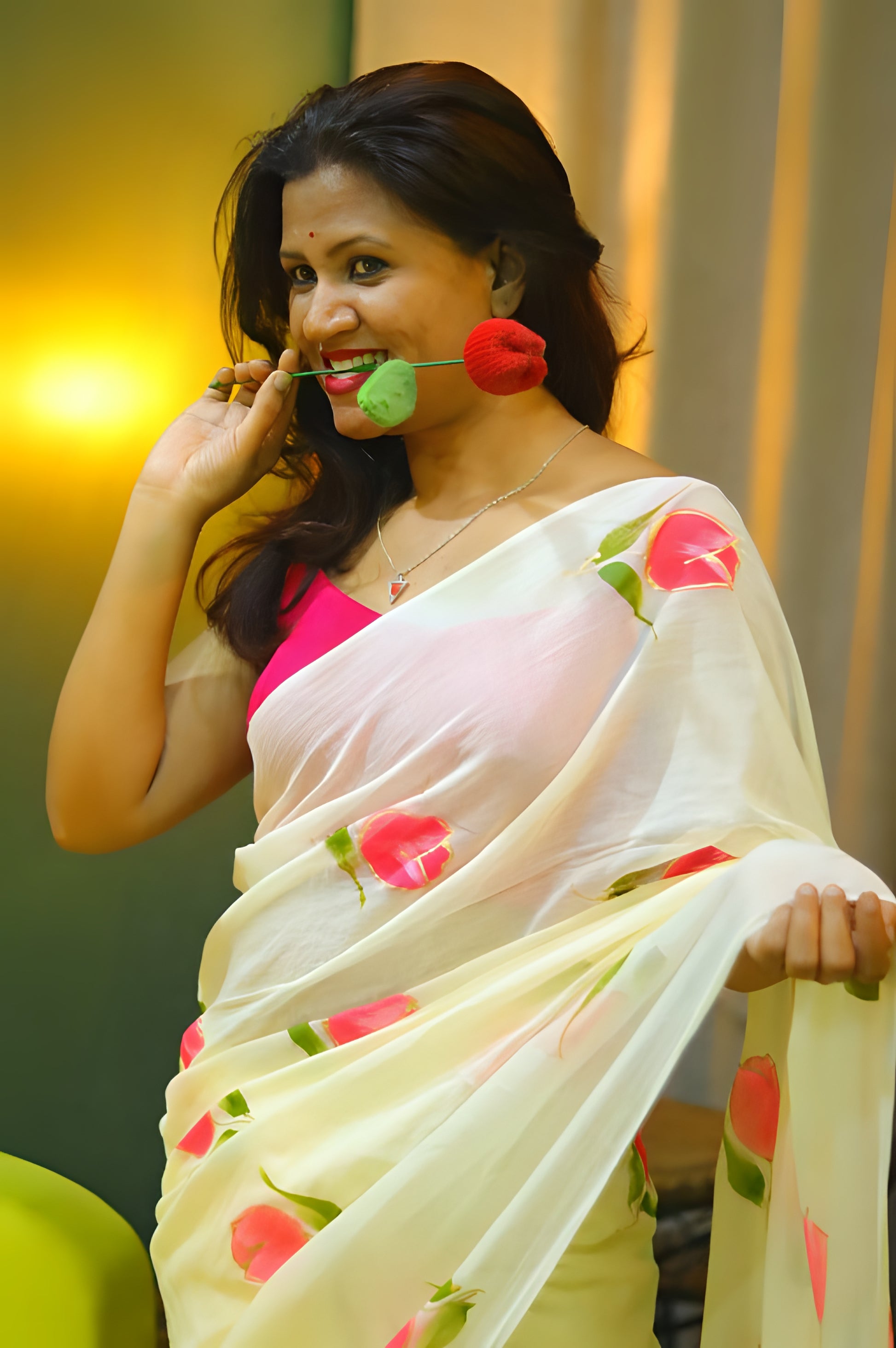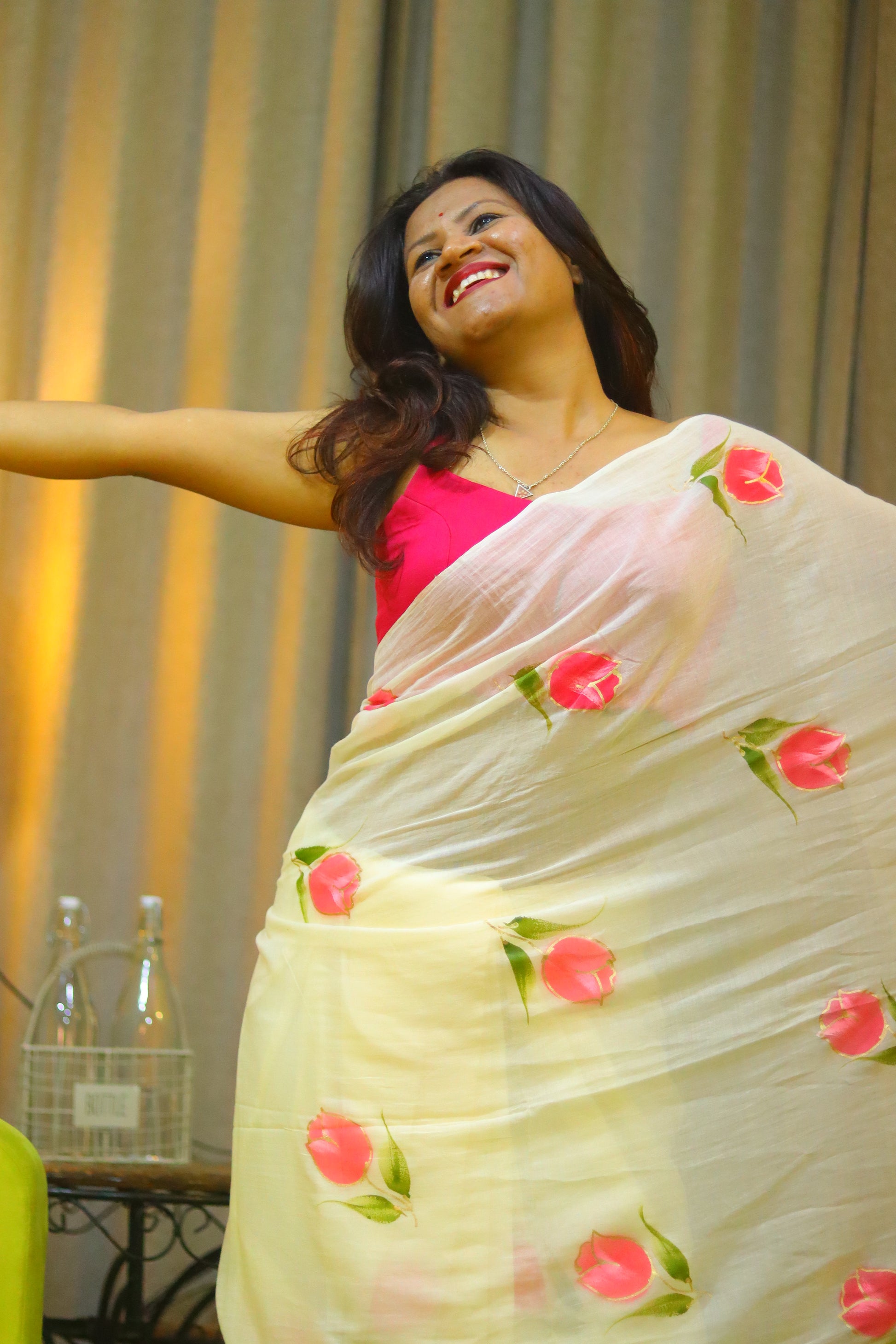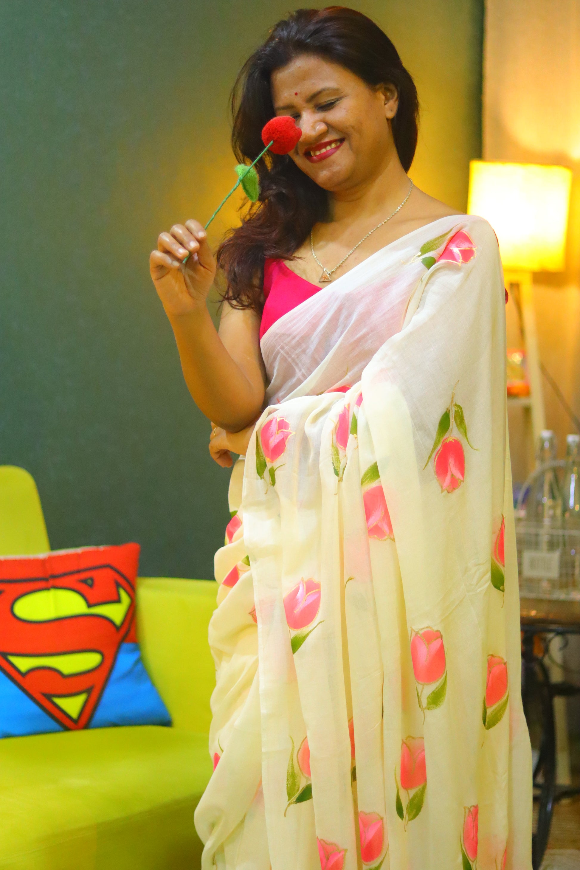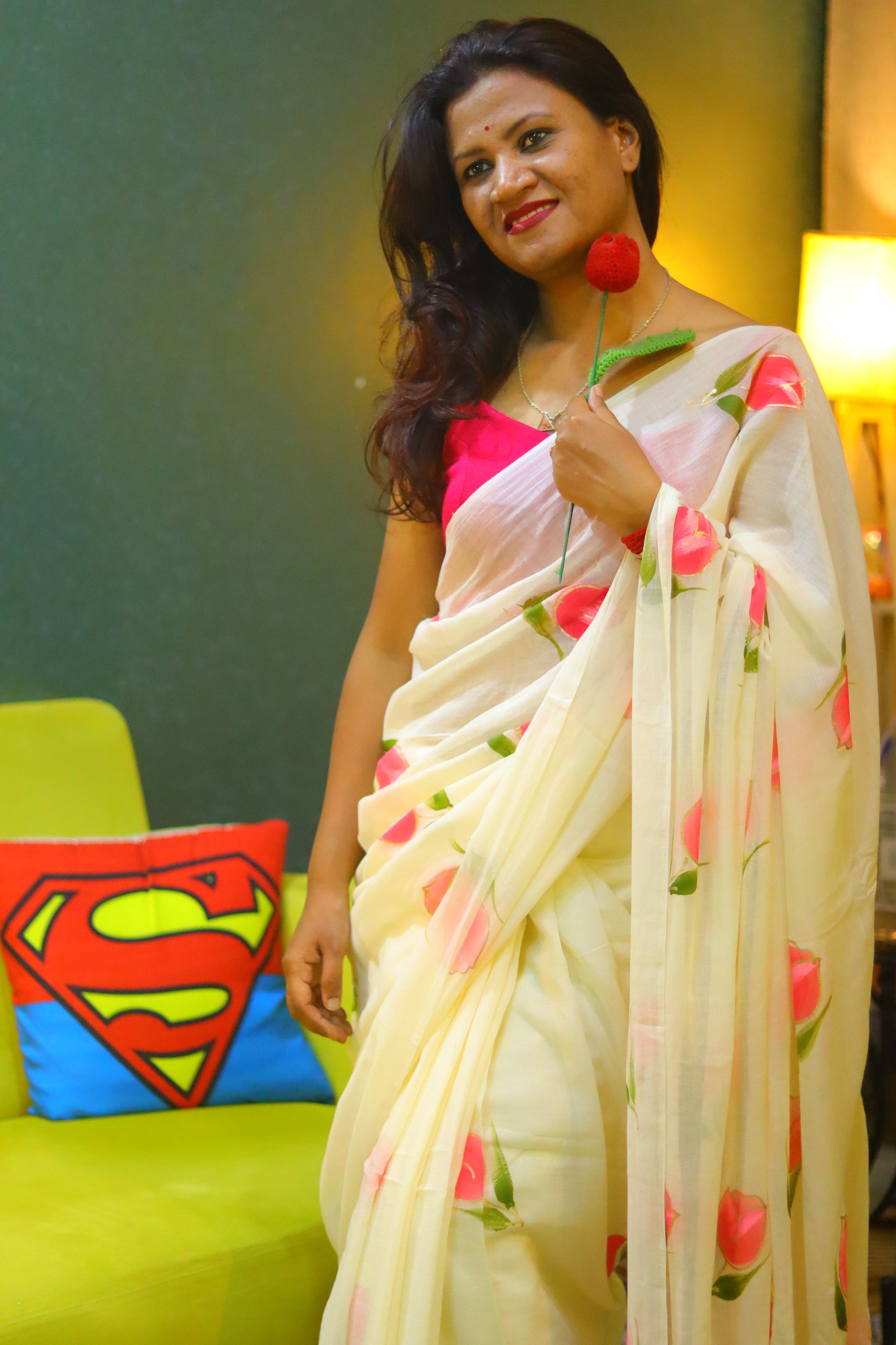 "Tulip Whisper" - An off-white mul cotton saree, softly whispered with delicate hand-painted pink tulips, evoking the gentle beauty of a spring morning.
