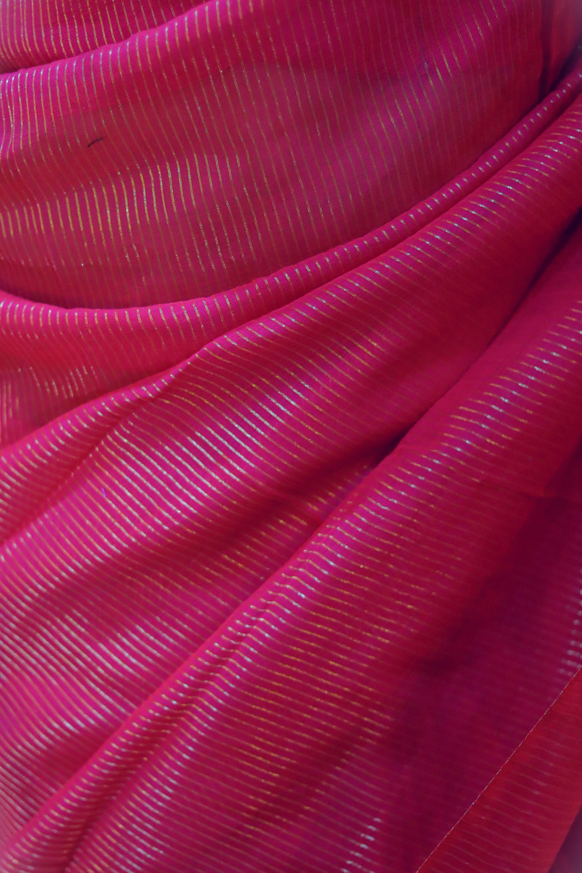 Make a bold statement with "Vaidehi", a vibrant hot pink saree adorned with intricate zari lines that run parallelly across the entire fabric. This stunning masterpiece combines traditional craftsmanship with modern flair, creating a truly show-stopping