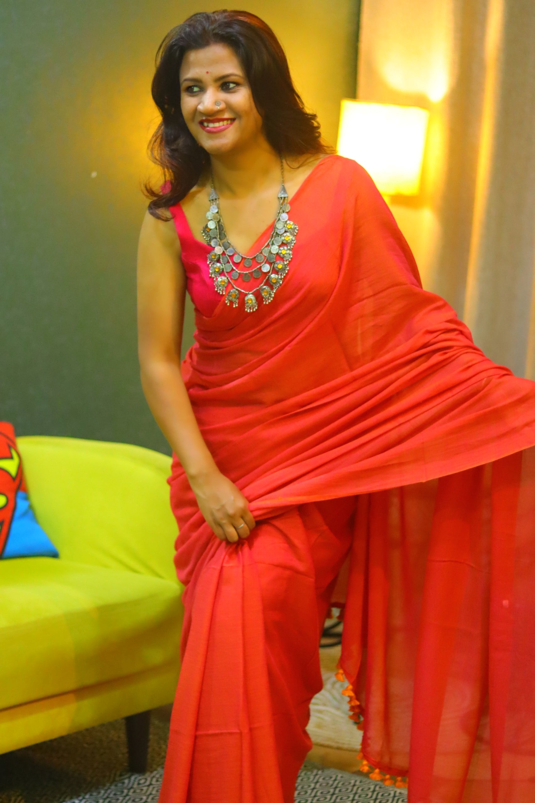 Dual tone plain red and yellow saree with tassels